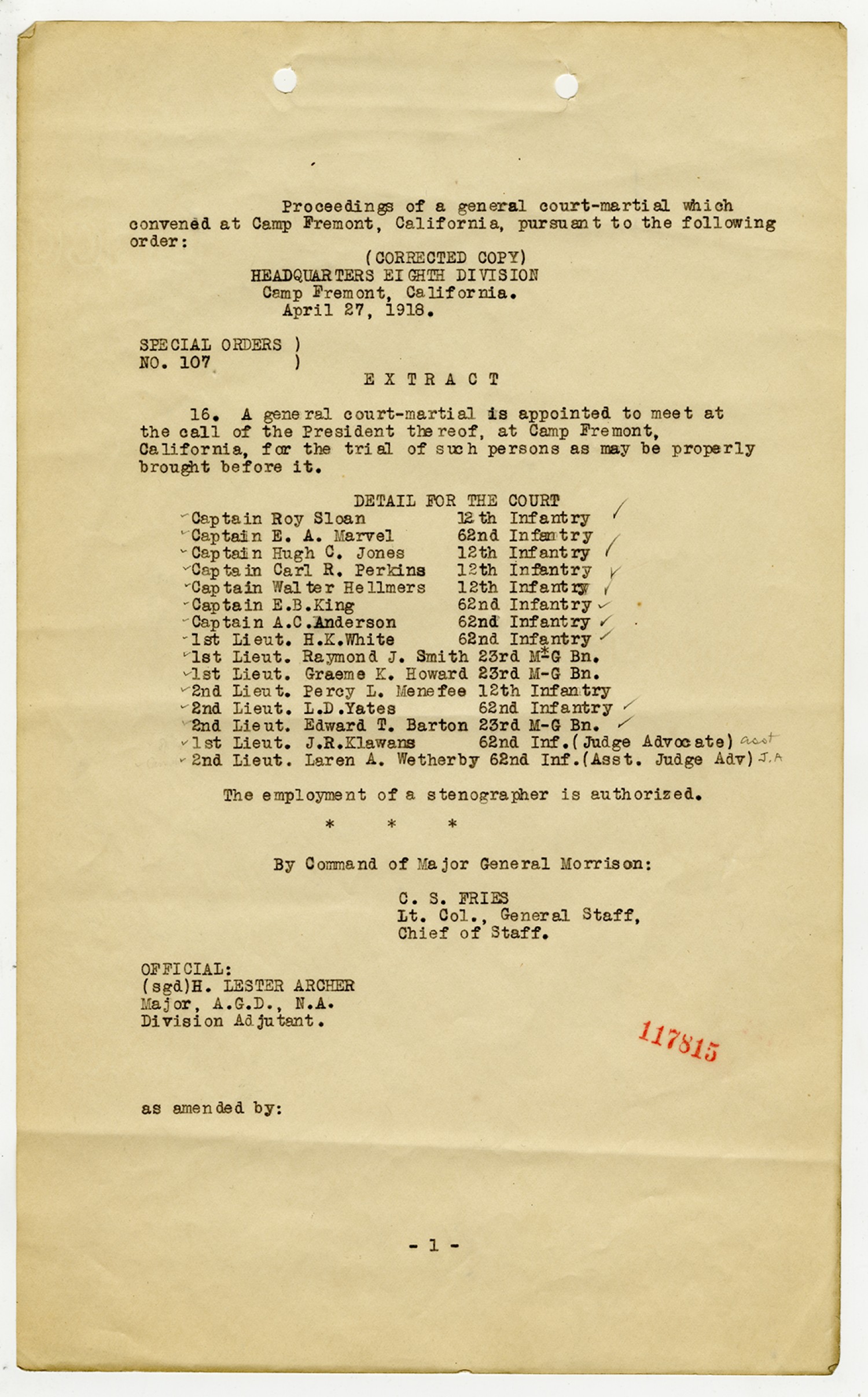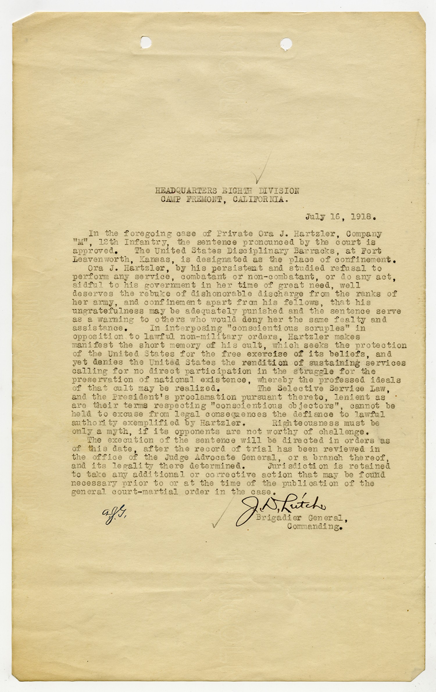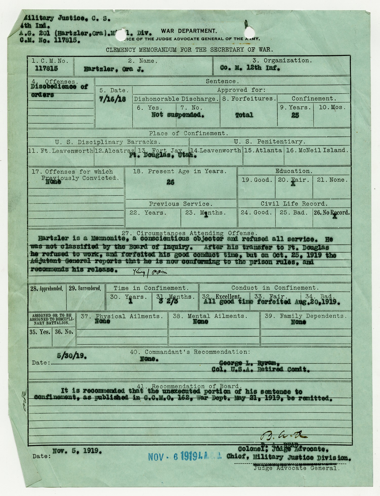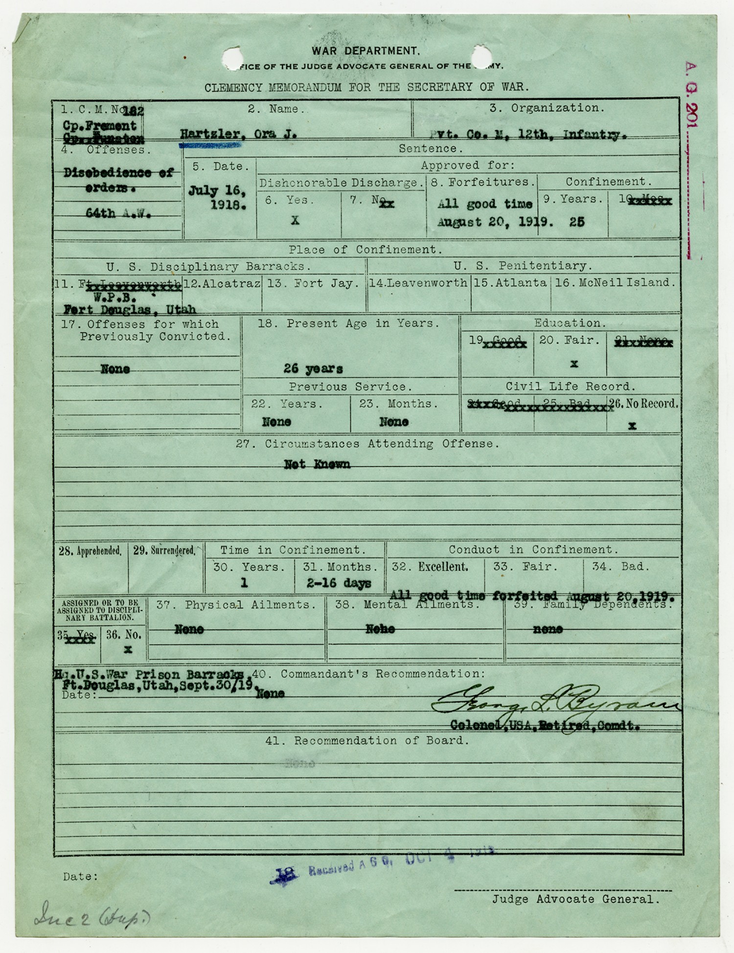 | Source | Hartzler, Ora; Court-Martial Case Files, 1917-1938; Records of the Office of the Judge Advocate General (Army), 1792-2010, Record Group 153; National Archives and Records Administration-National Personnel Records Center (St. Louis). |