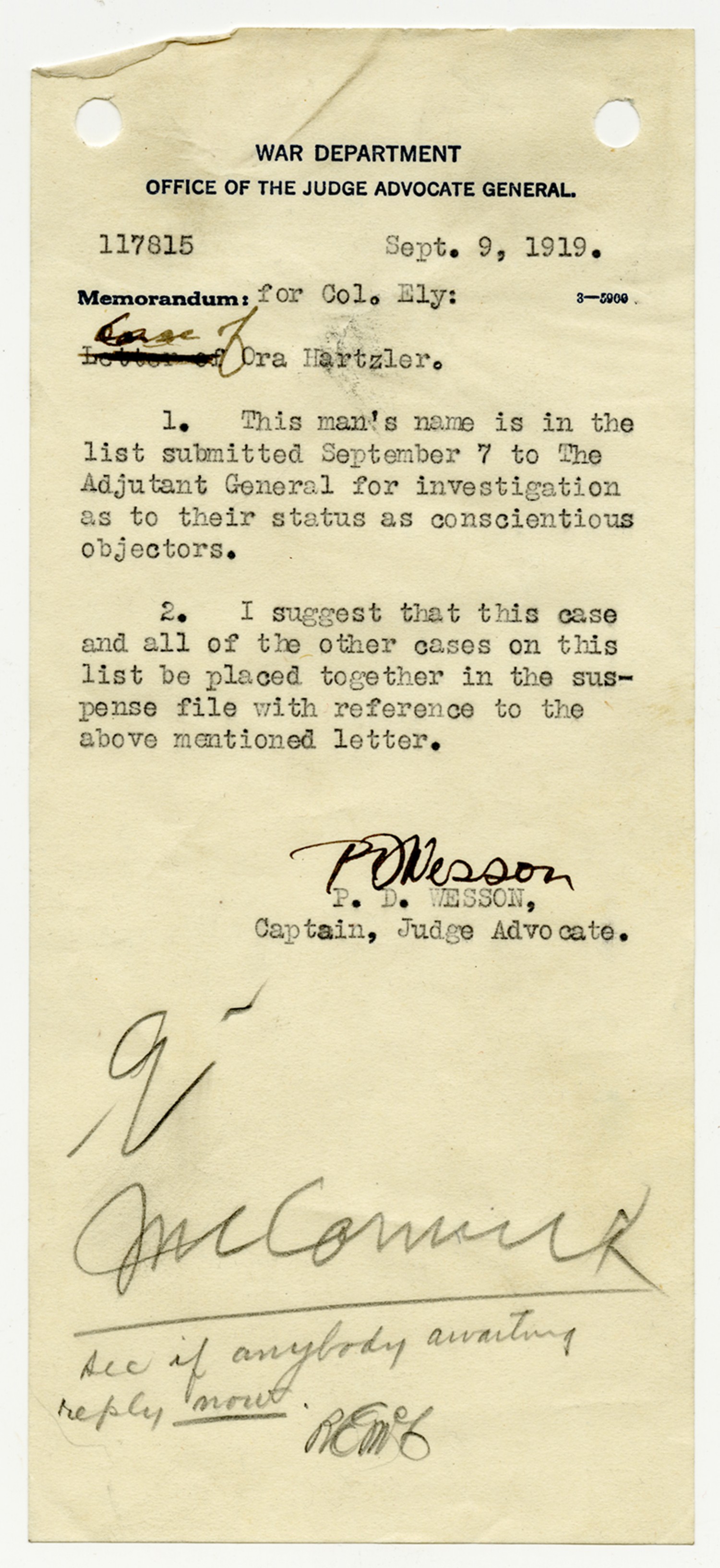 P.D. Wesson Memorandum to Colonel Ely - September 9, 1919