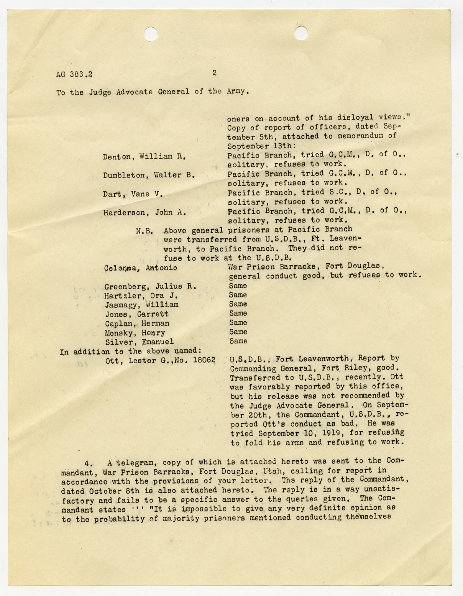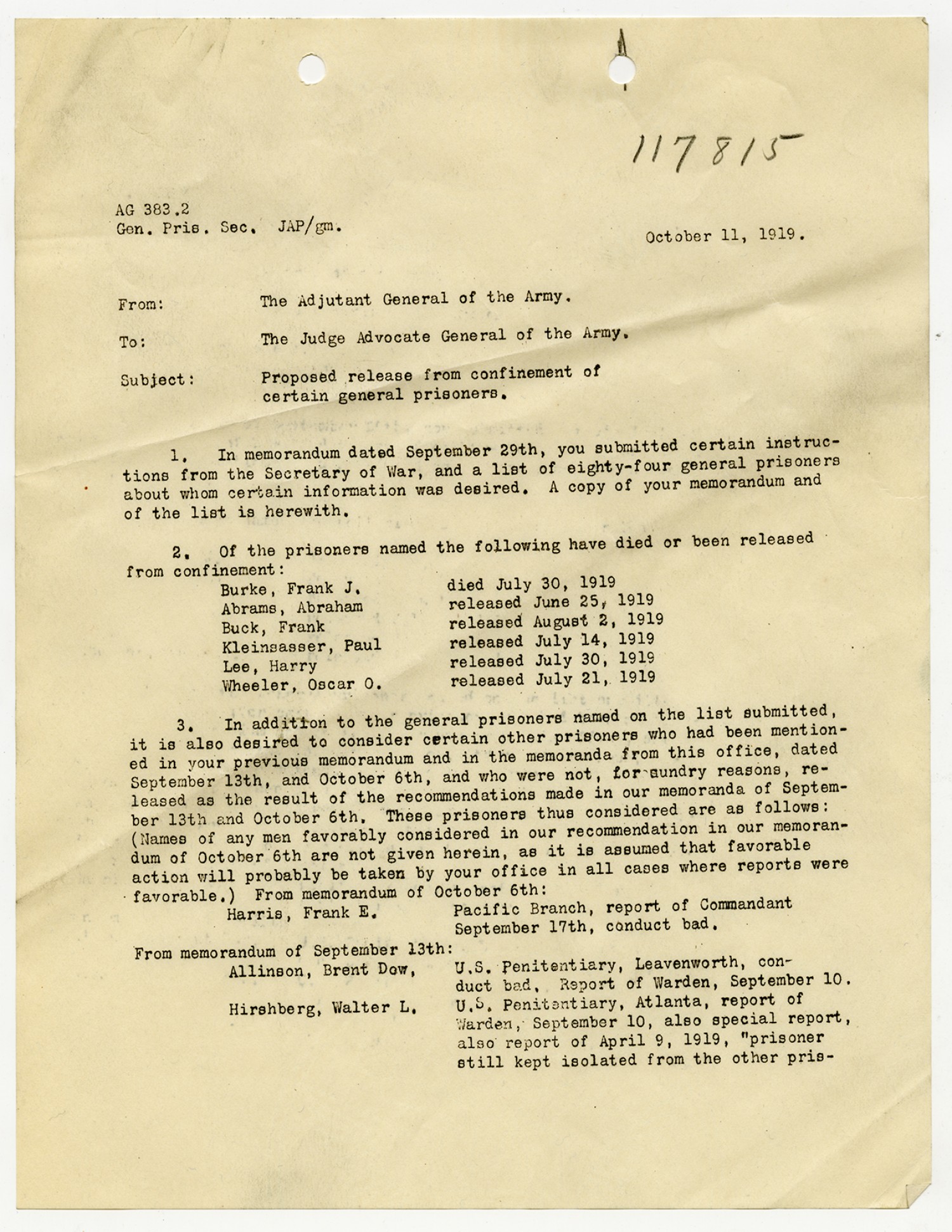 Julius A. Penn letter to the Judge Advocate General - October 11, 1919