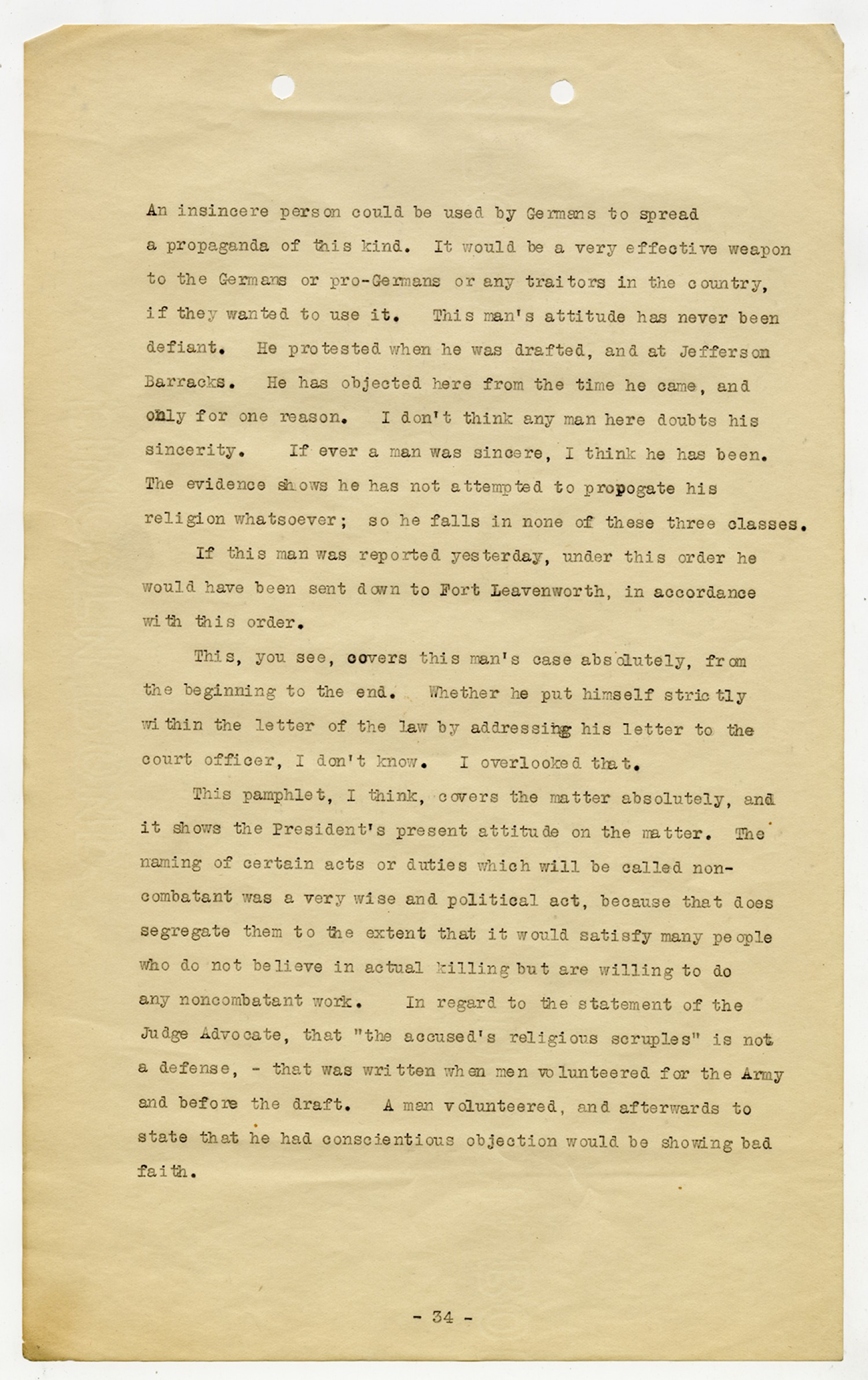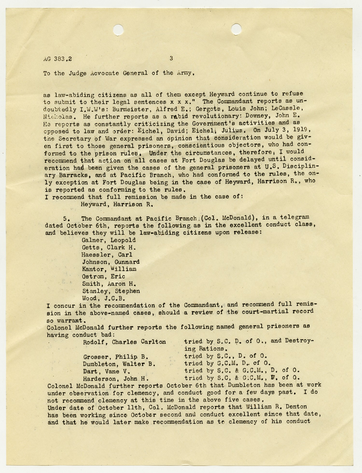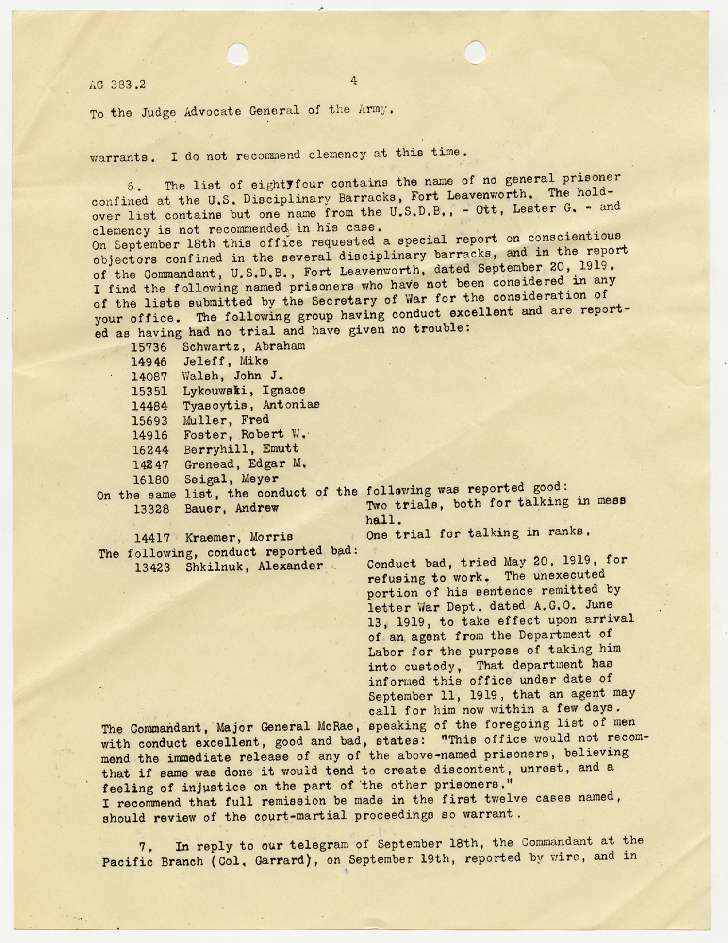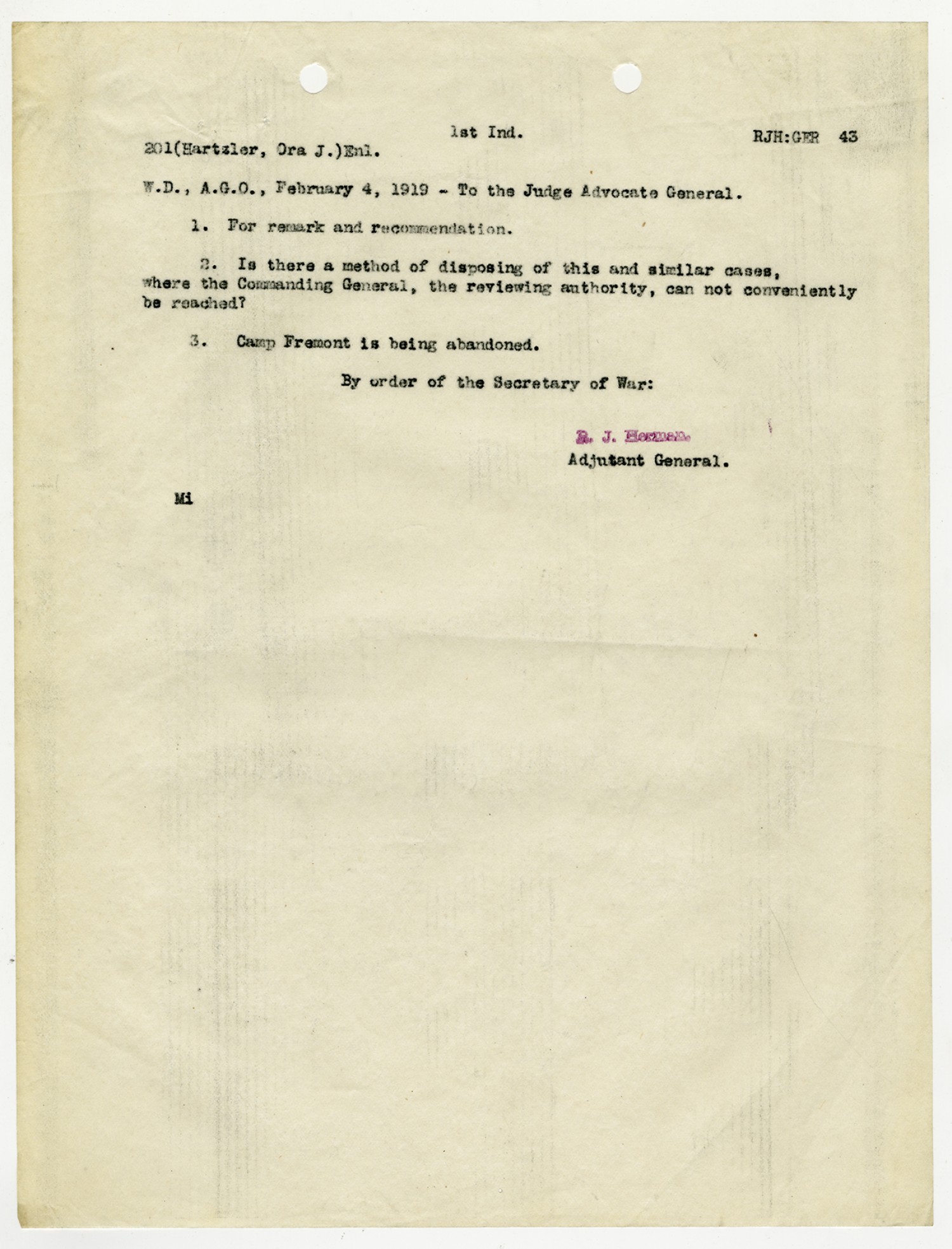 R.J. Herman letter to the Judge Advocate General - February 4, 1919