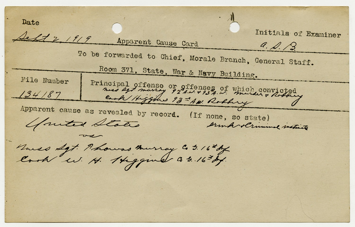 Apparent Cause Card - September 2, 1919