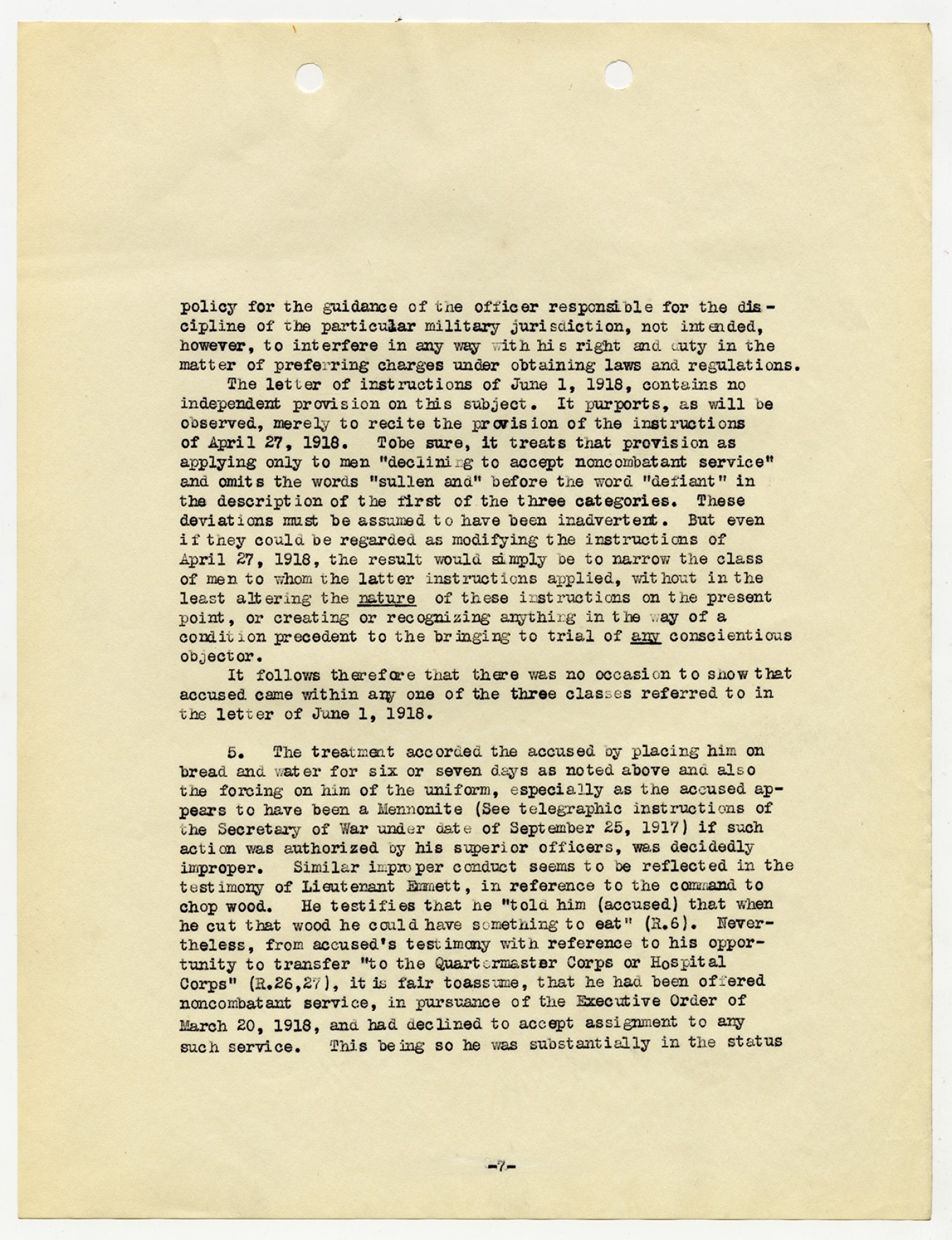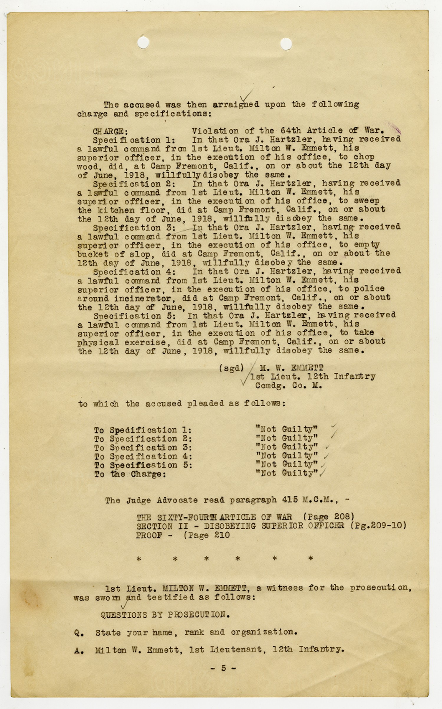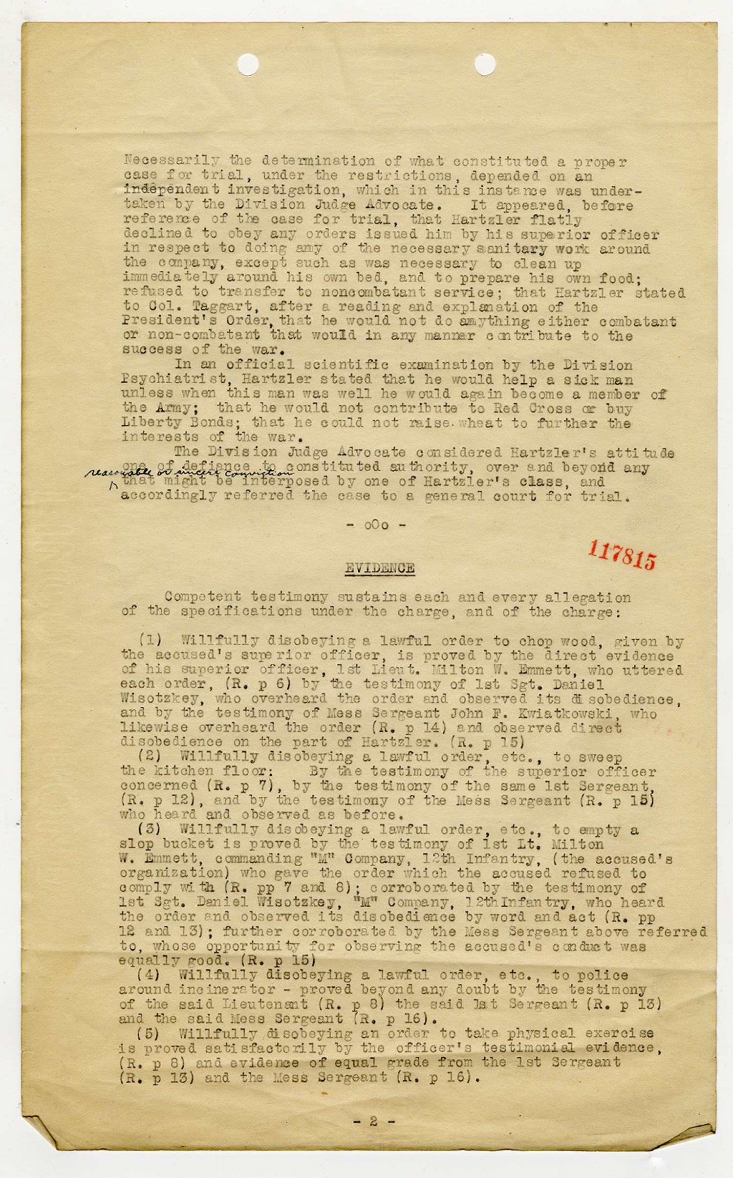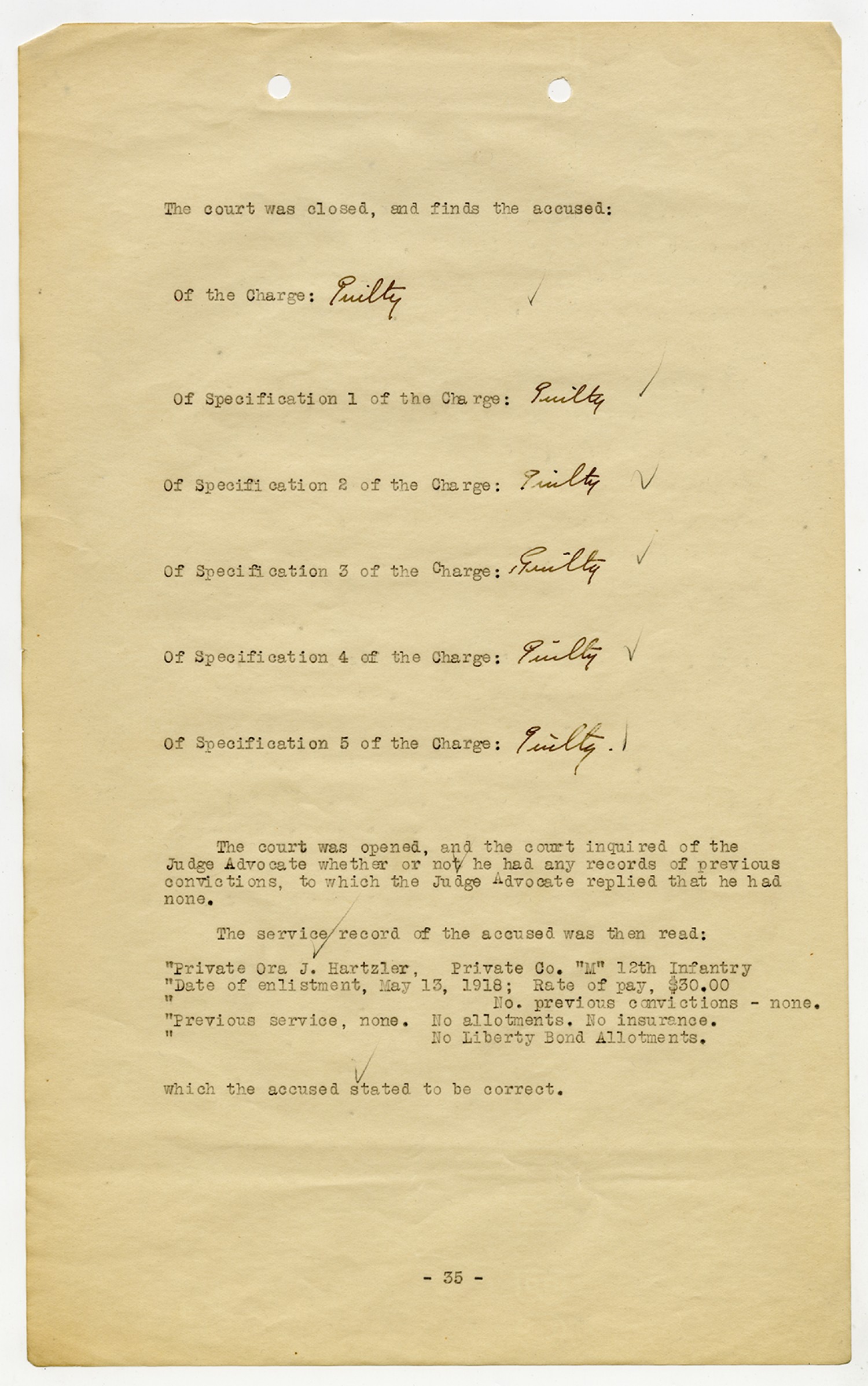 Ora Hartzler Charges and Findings - November 5, 1918