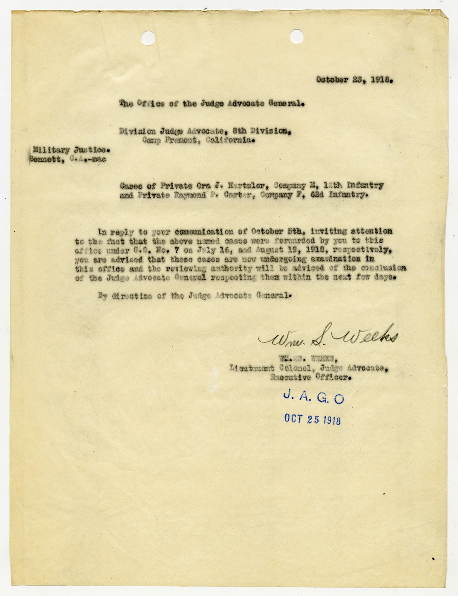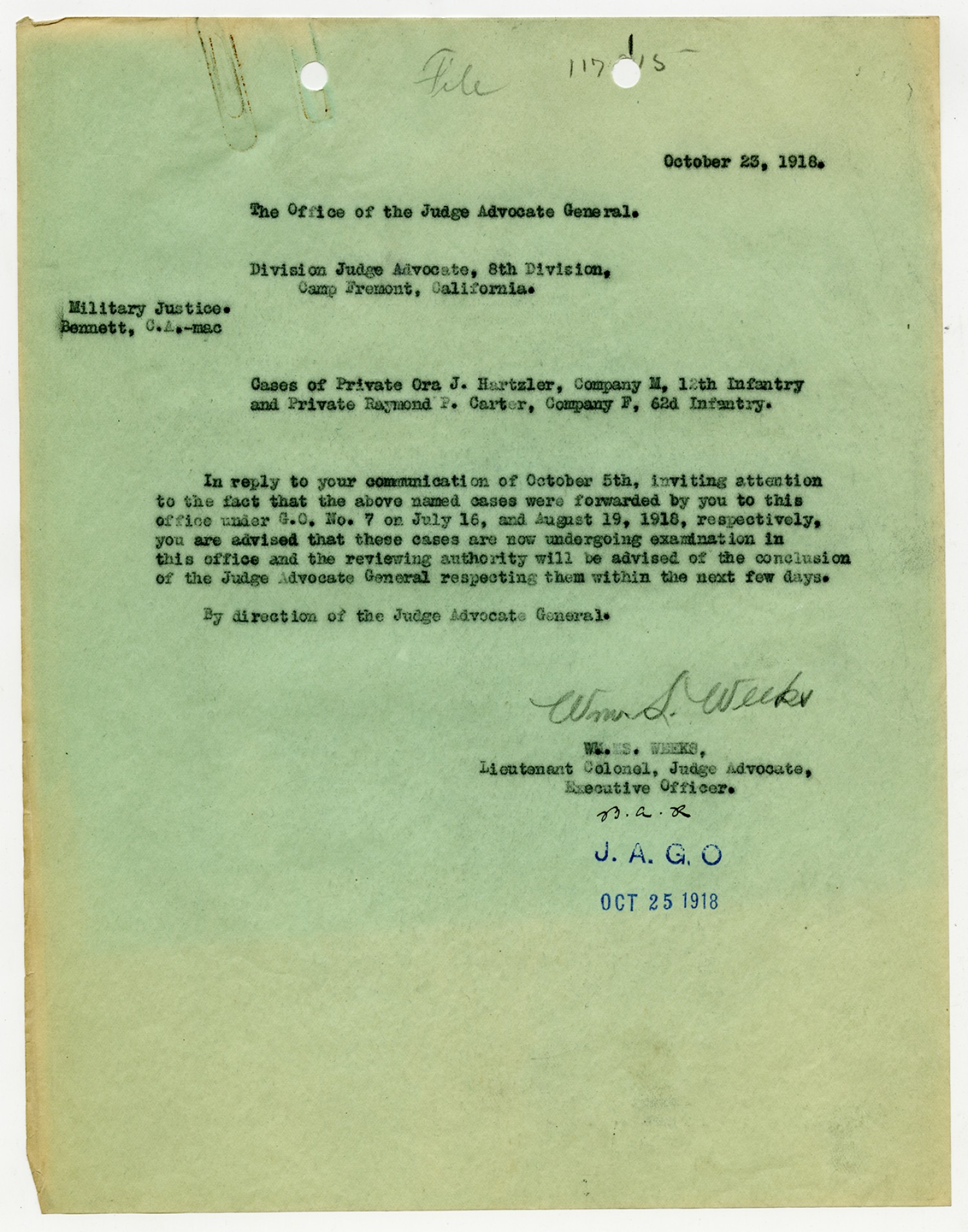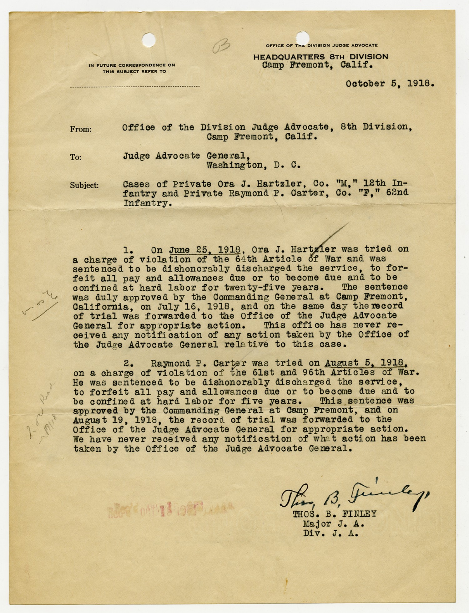 Thomas B. Finley letter to the Judge Advocate General - October 5, 1918