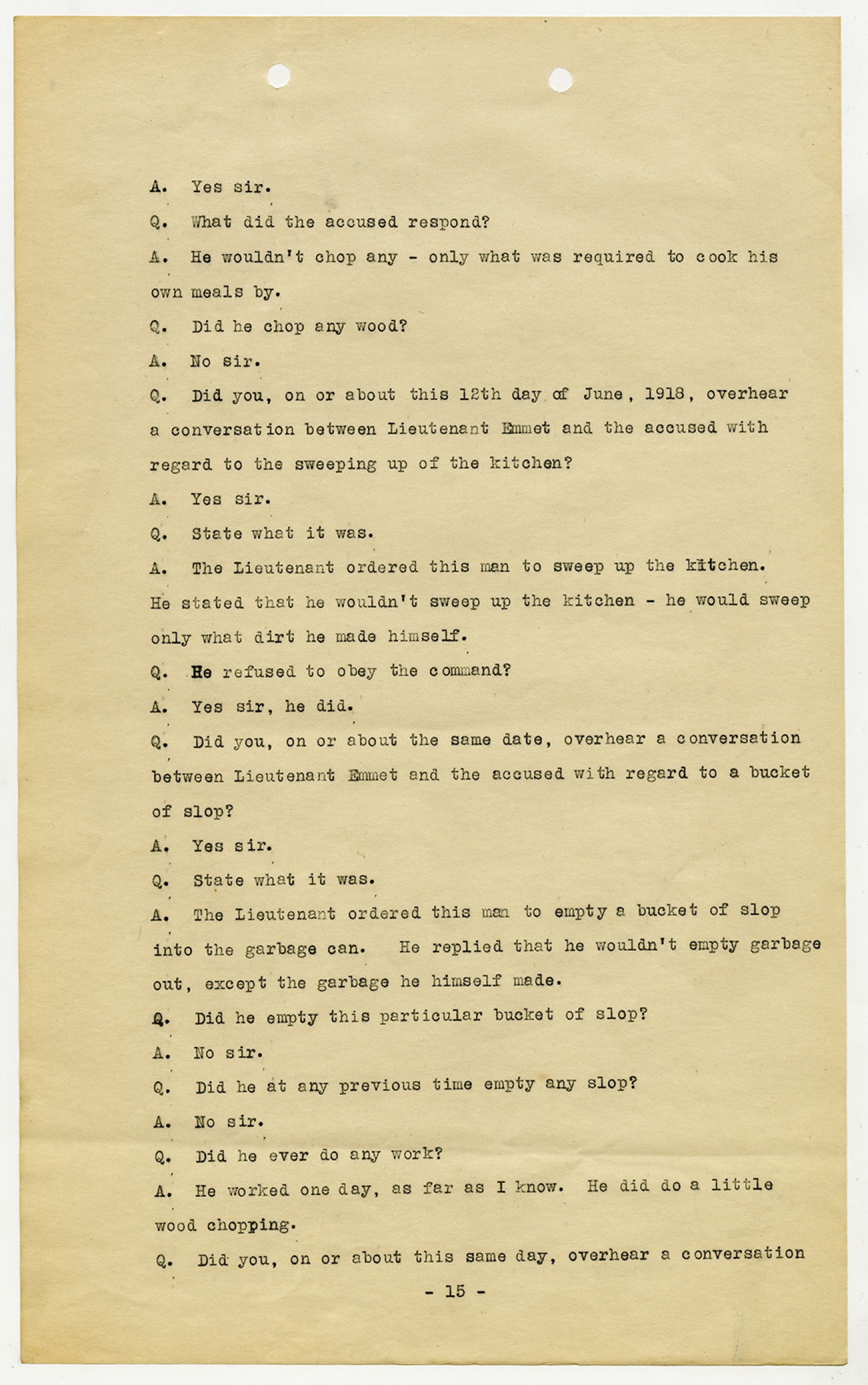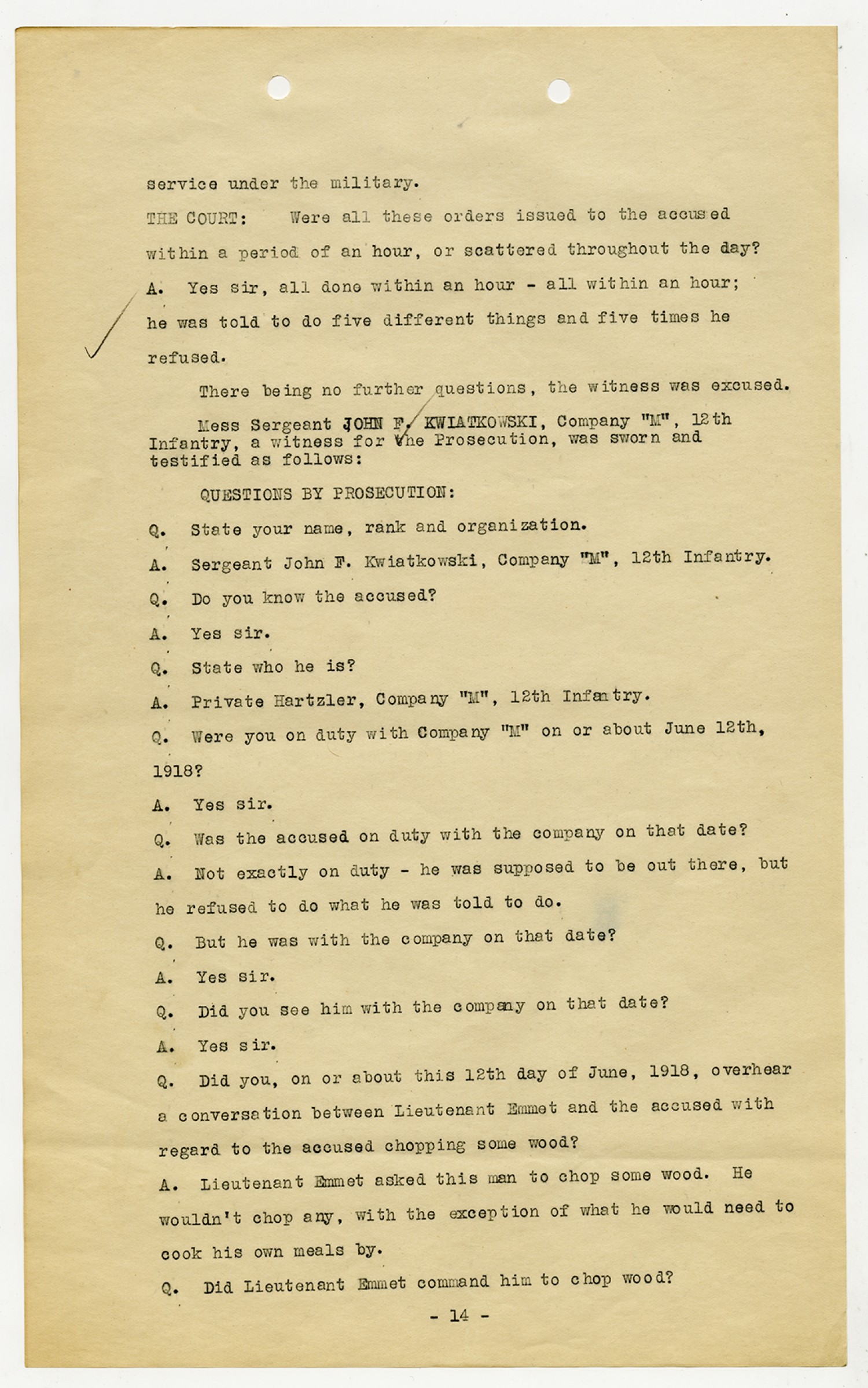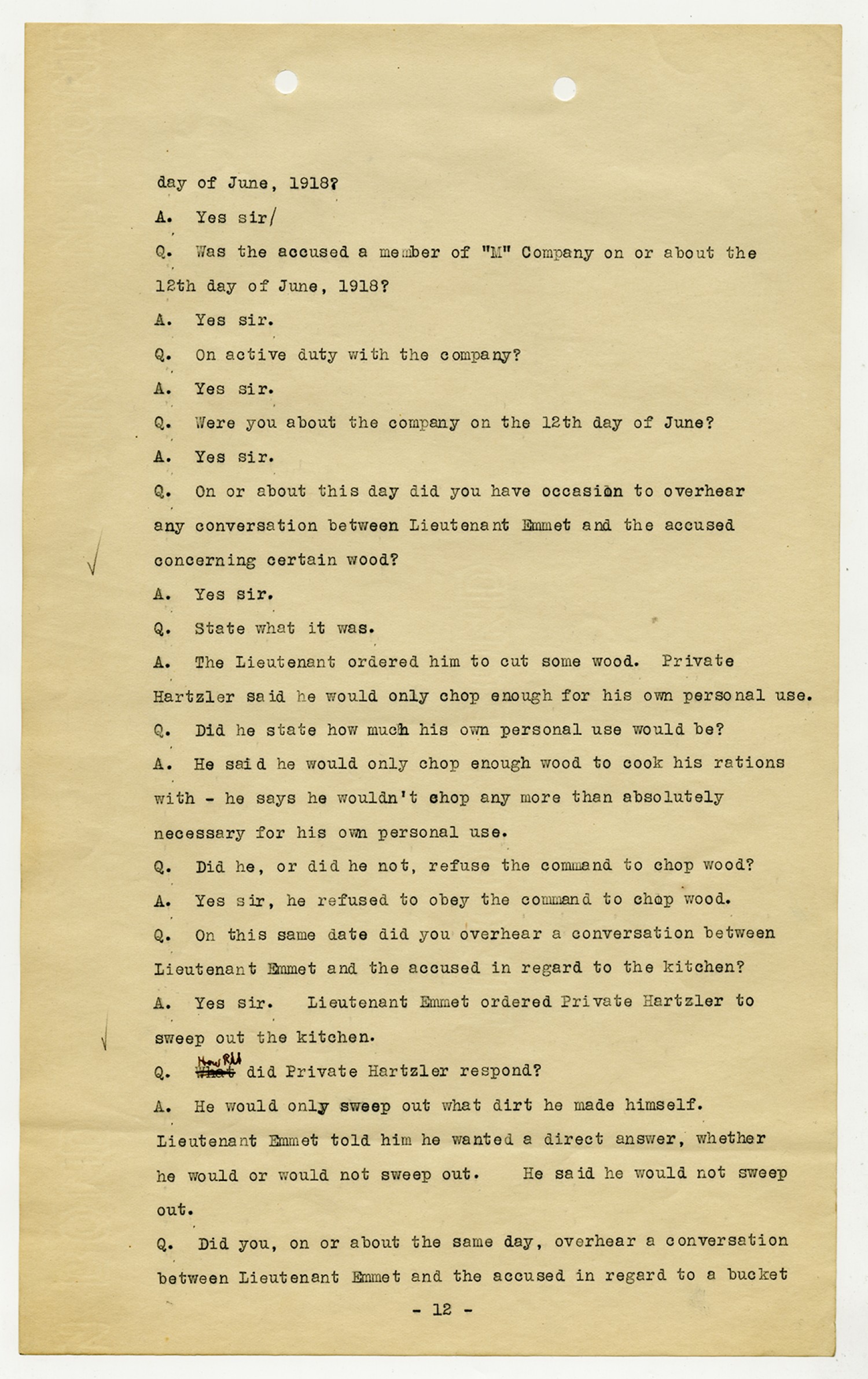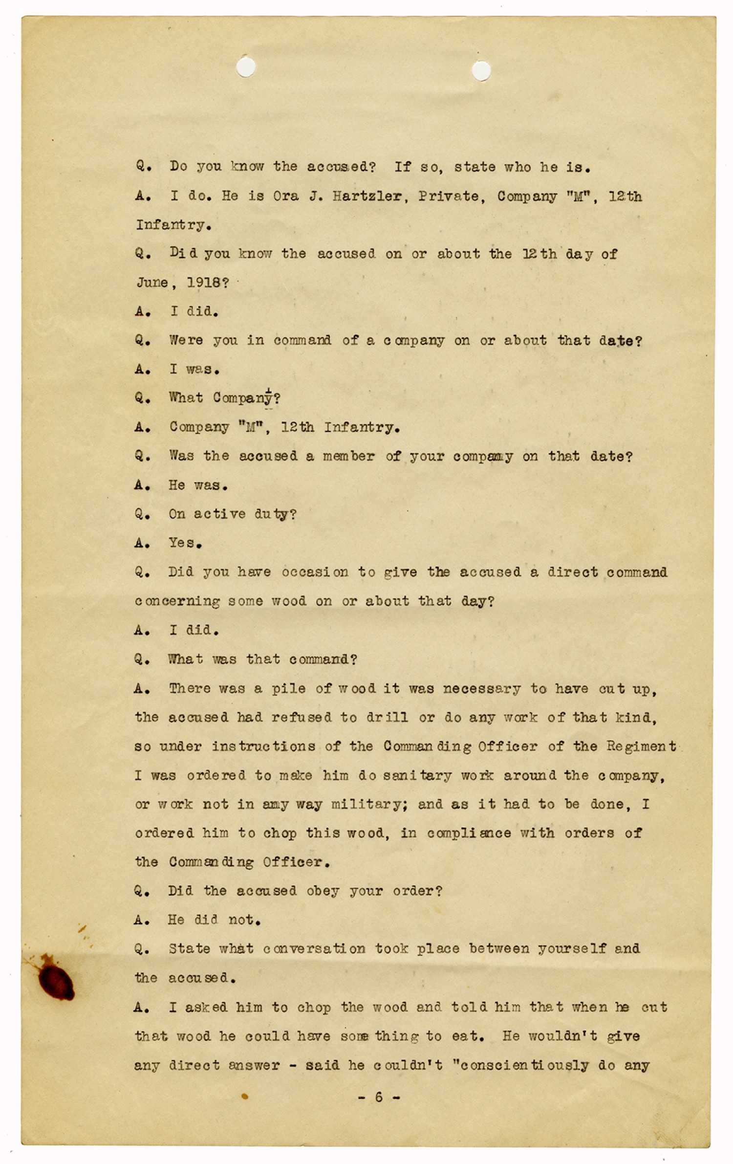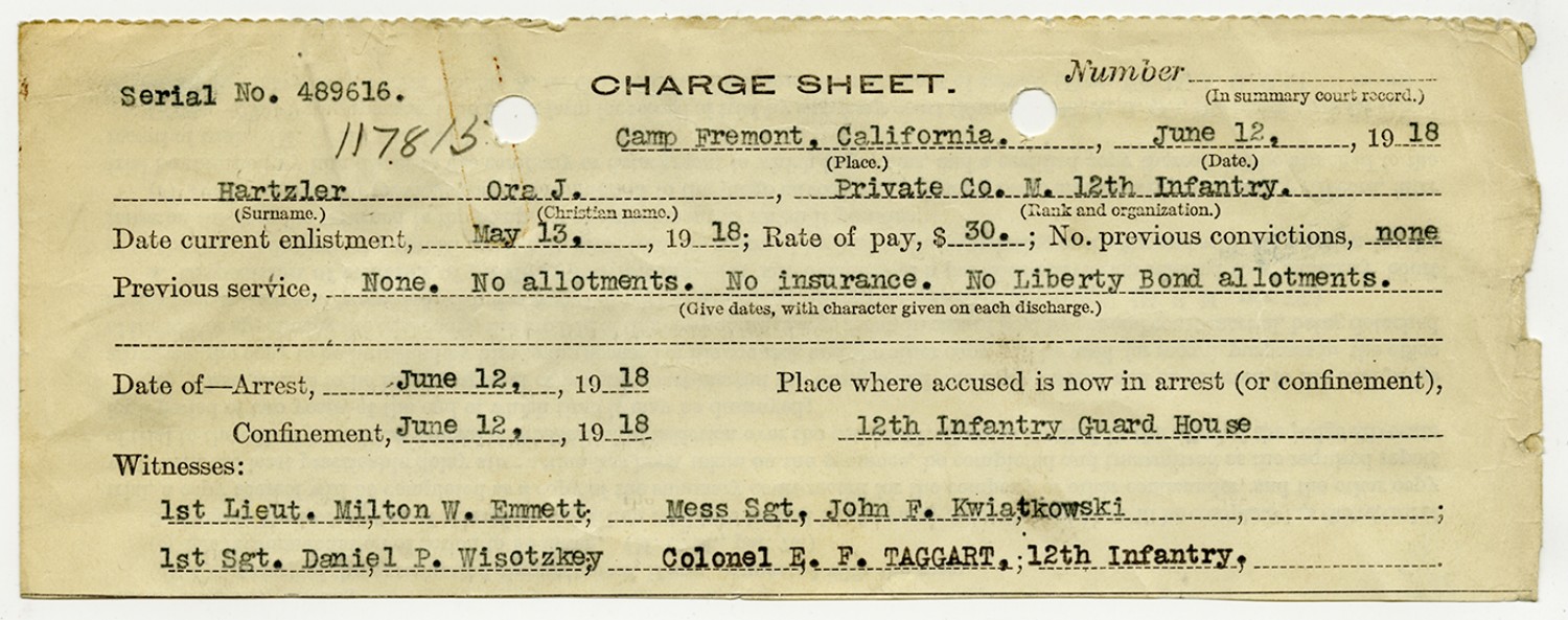 Ora Hartzler Charge Sheet - June 12, 1918