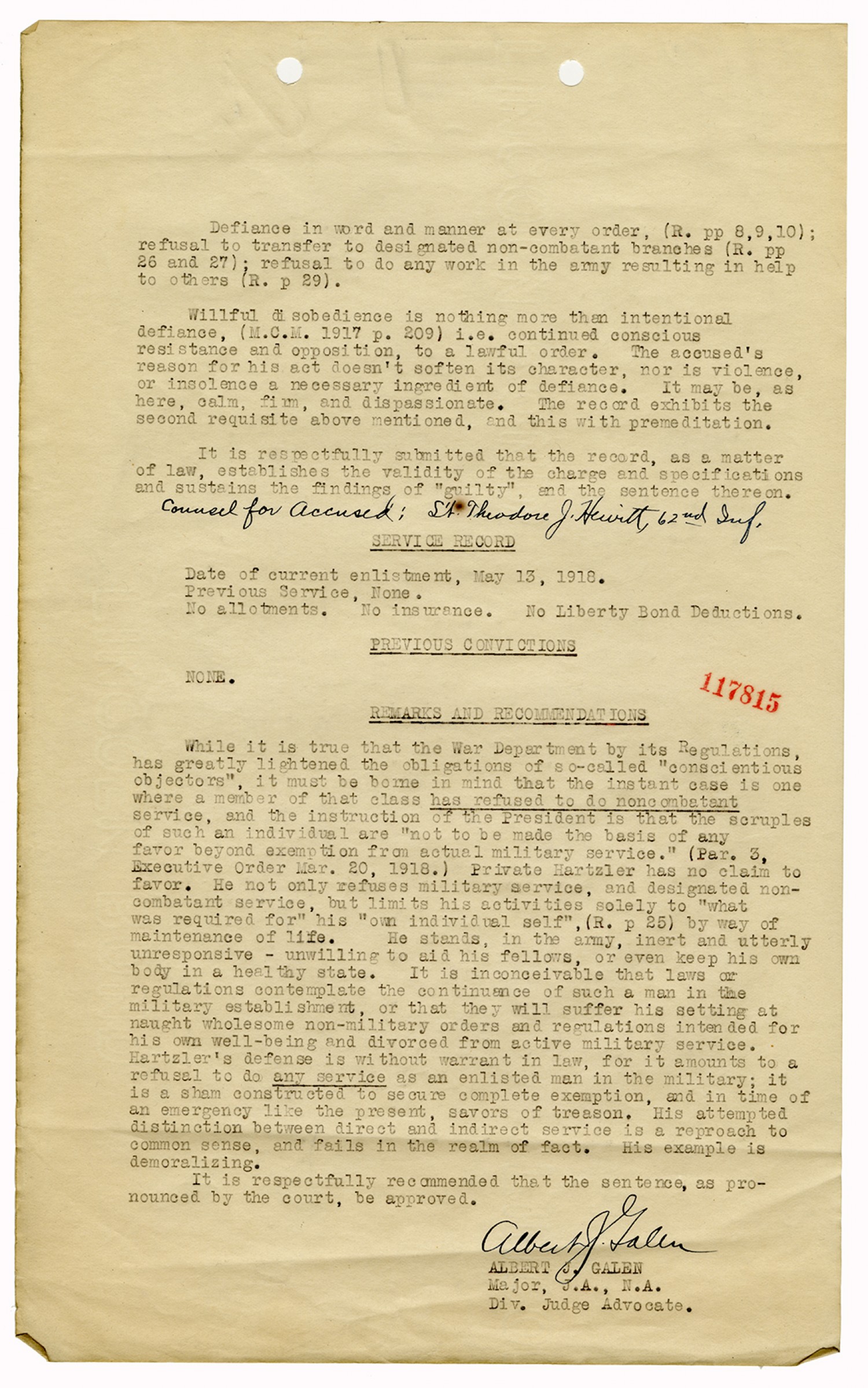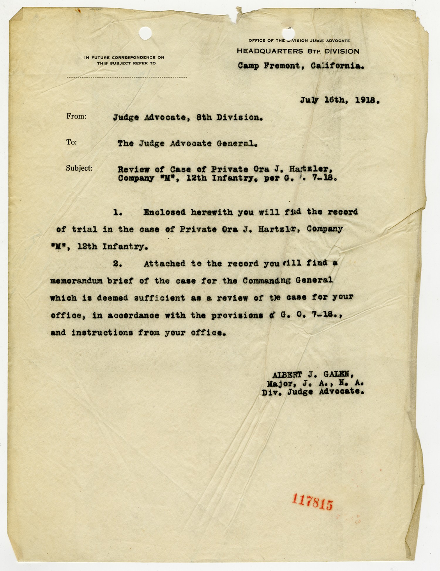 Albert J. Galen letter to the Judge Advocate General - July 16, 1918