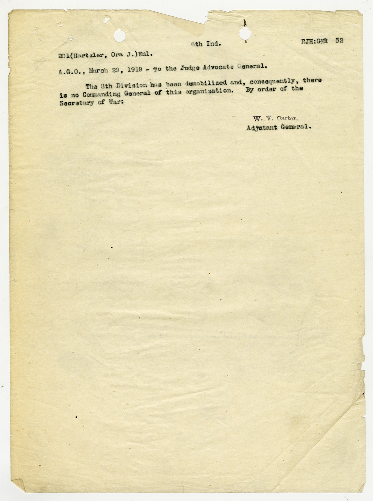 W.V. Carter letter to the Judge Advocate General - March 29, 1919