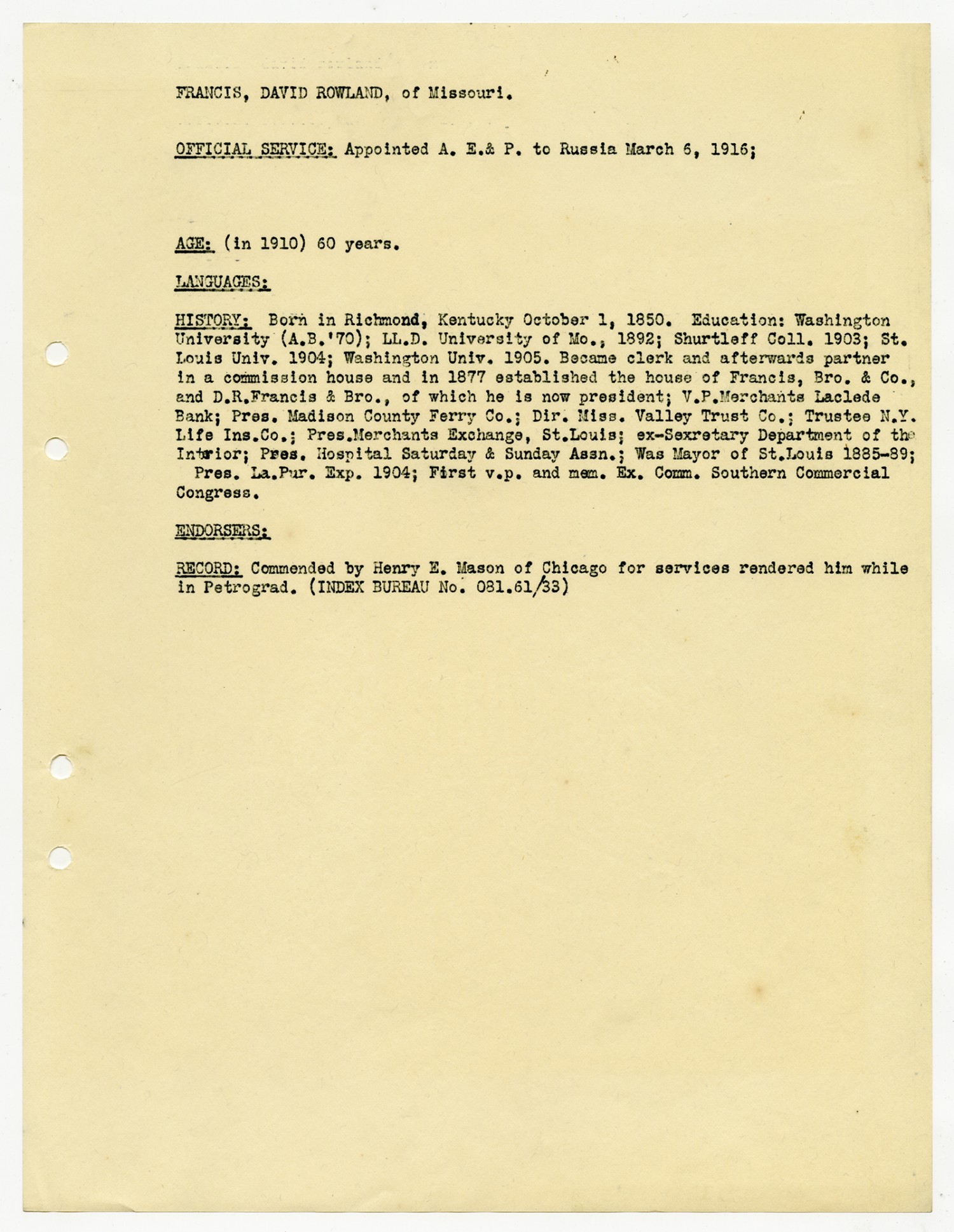 David R. Francis Resume - March 6, 1916