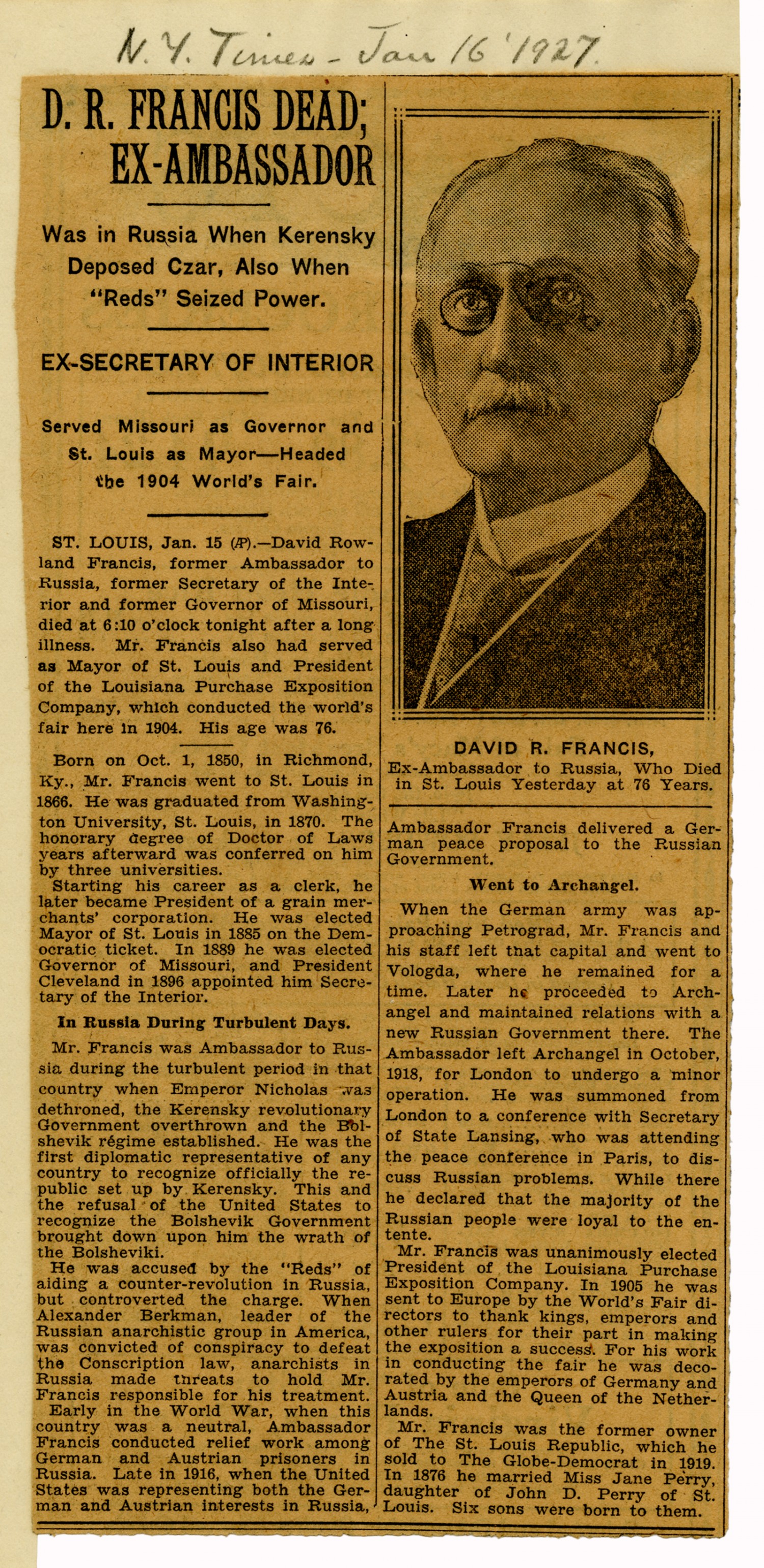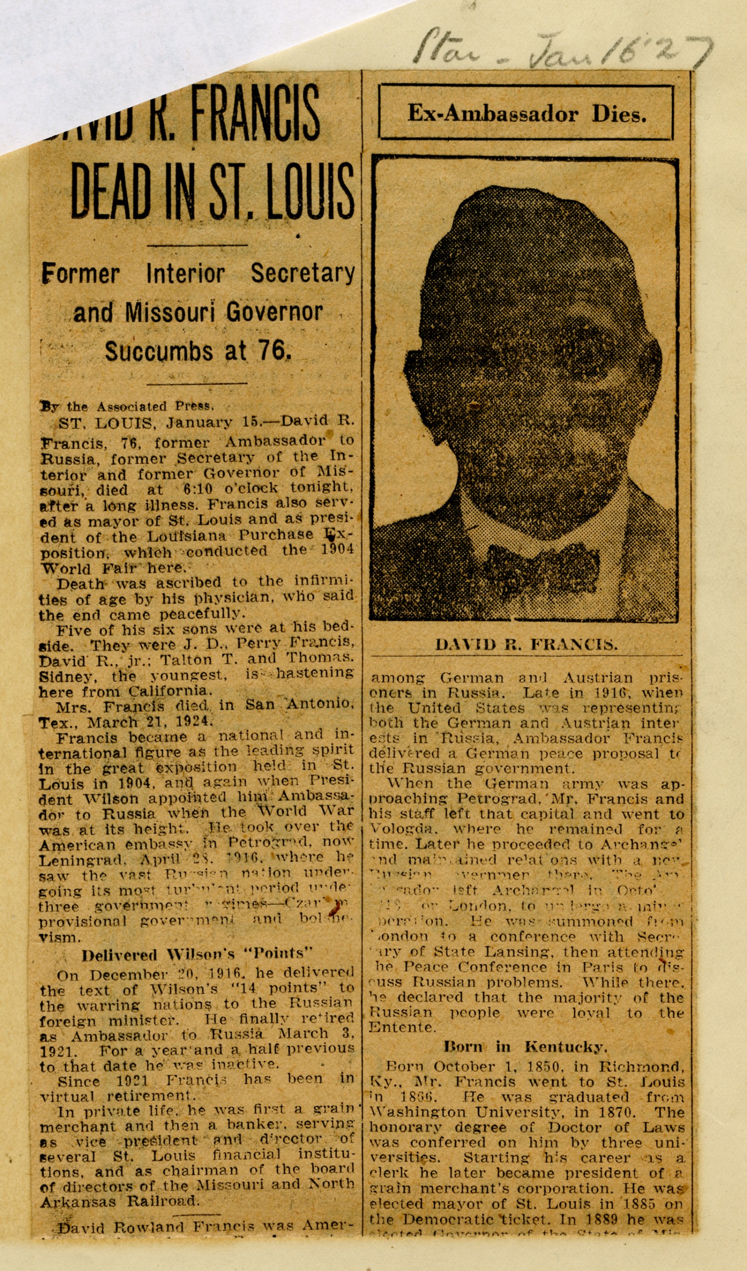 David R. Francis Obituary - January 16, 1927