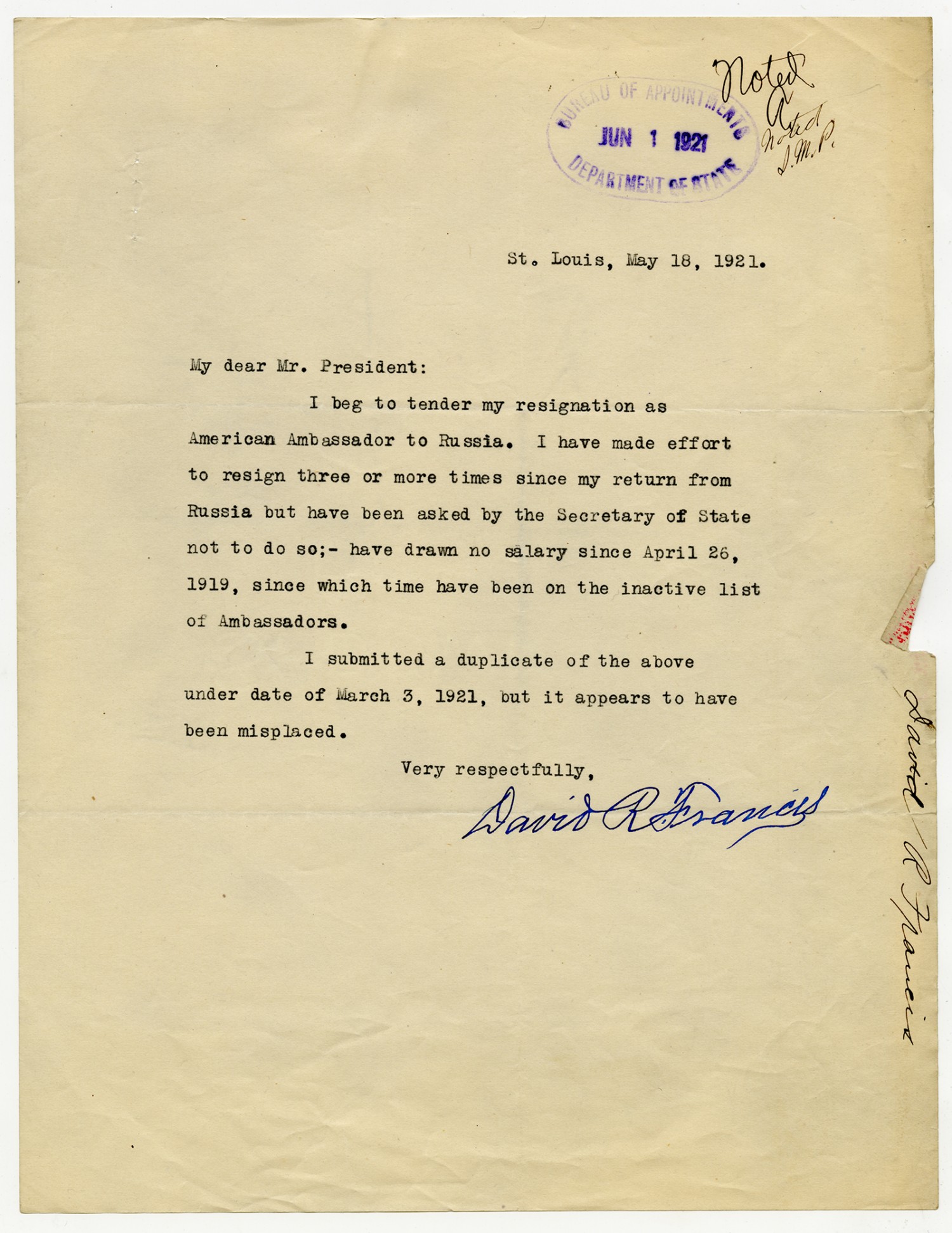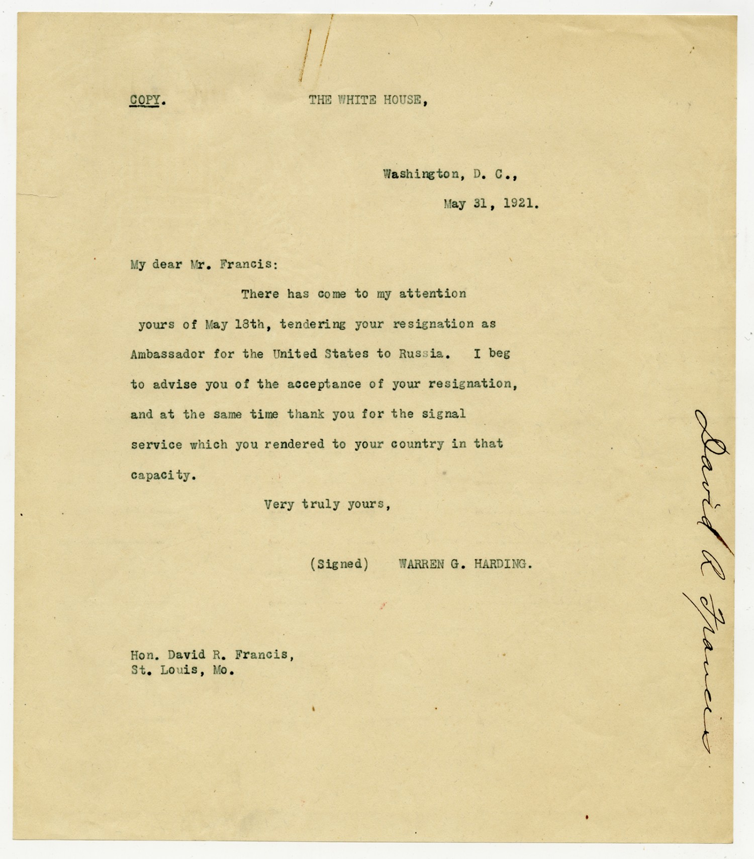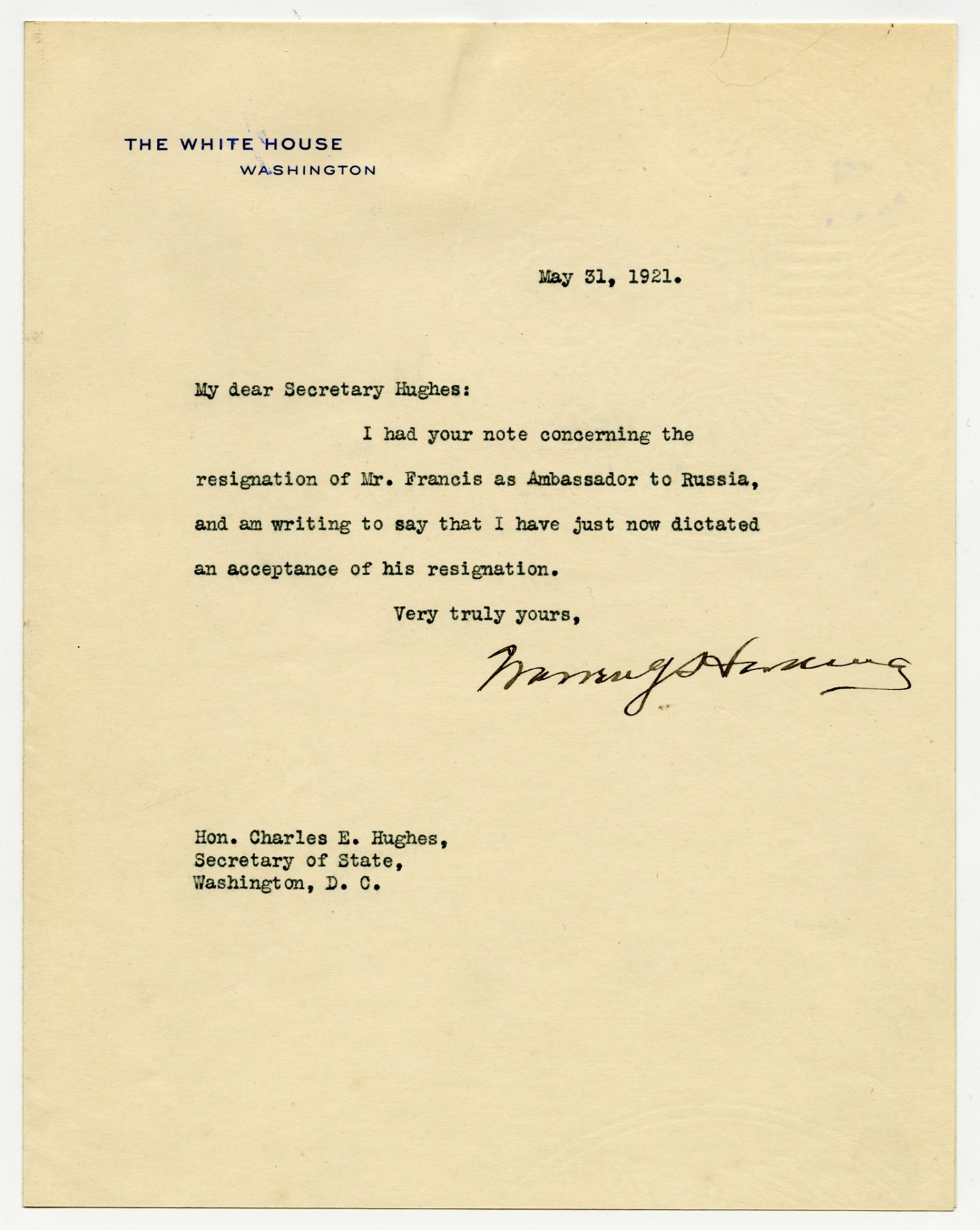 Warren G. Harding letter to David Francis - May 31, 1921