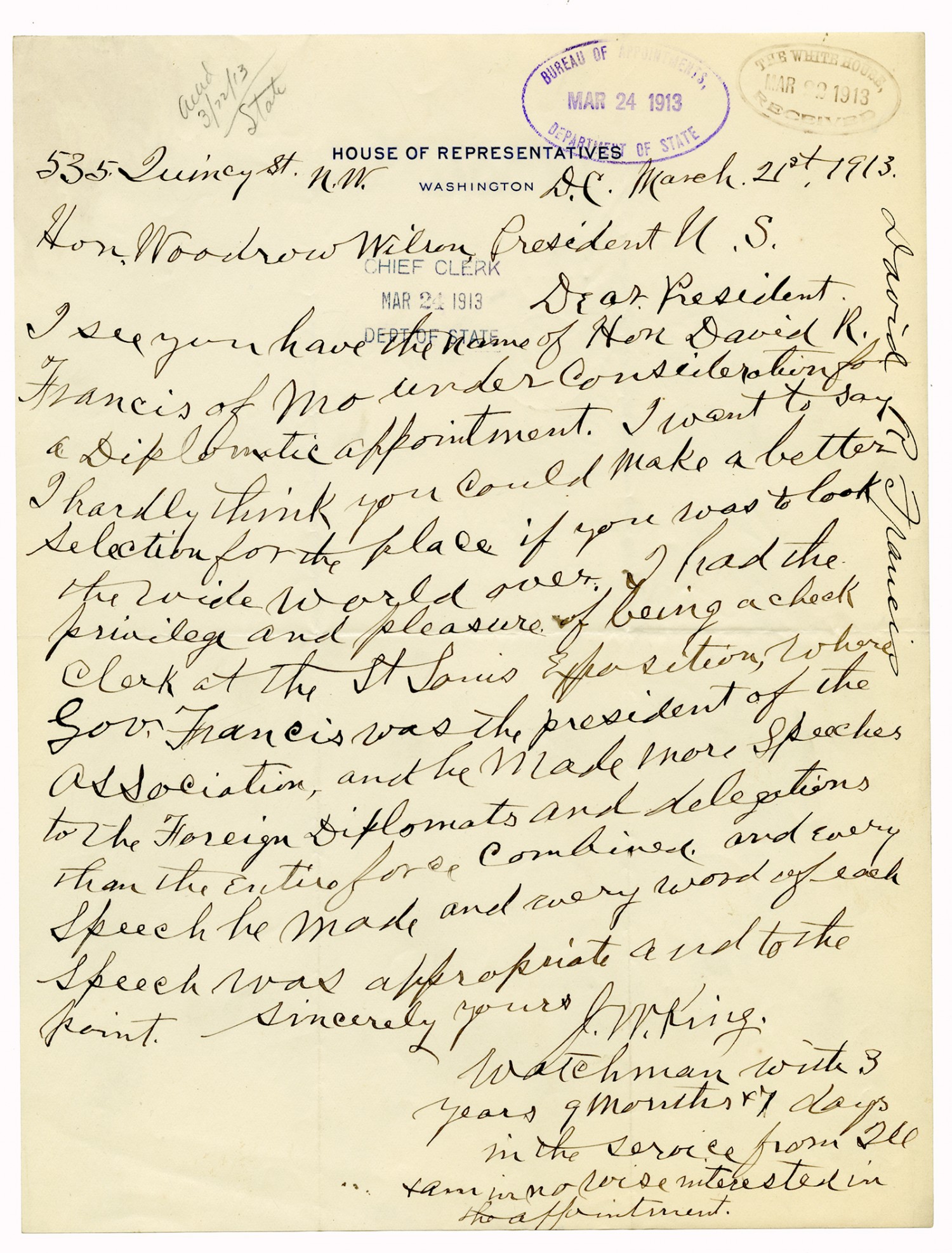 J.W. King letter to Woodrow Wilson - March 21, 1913