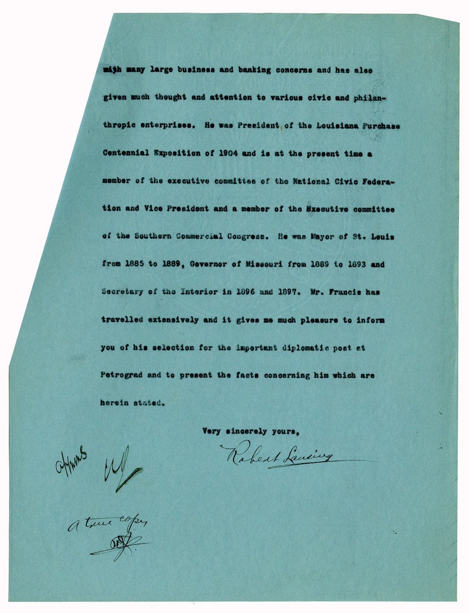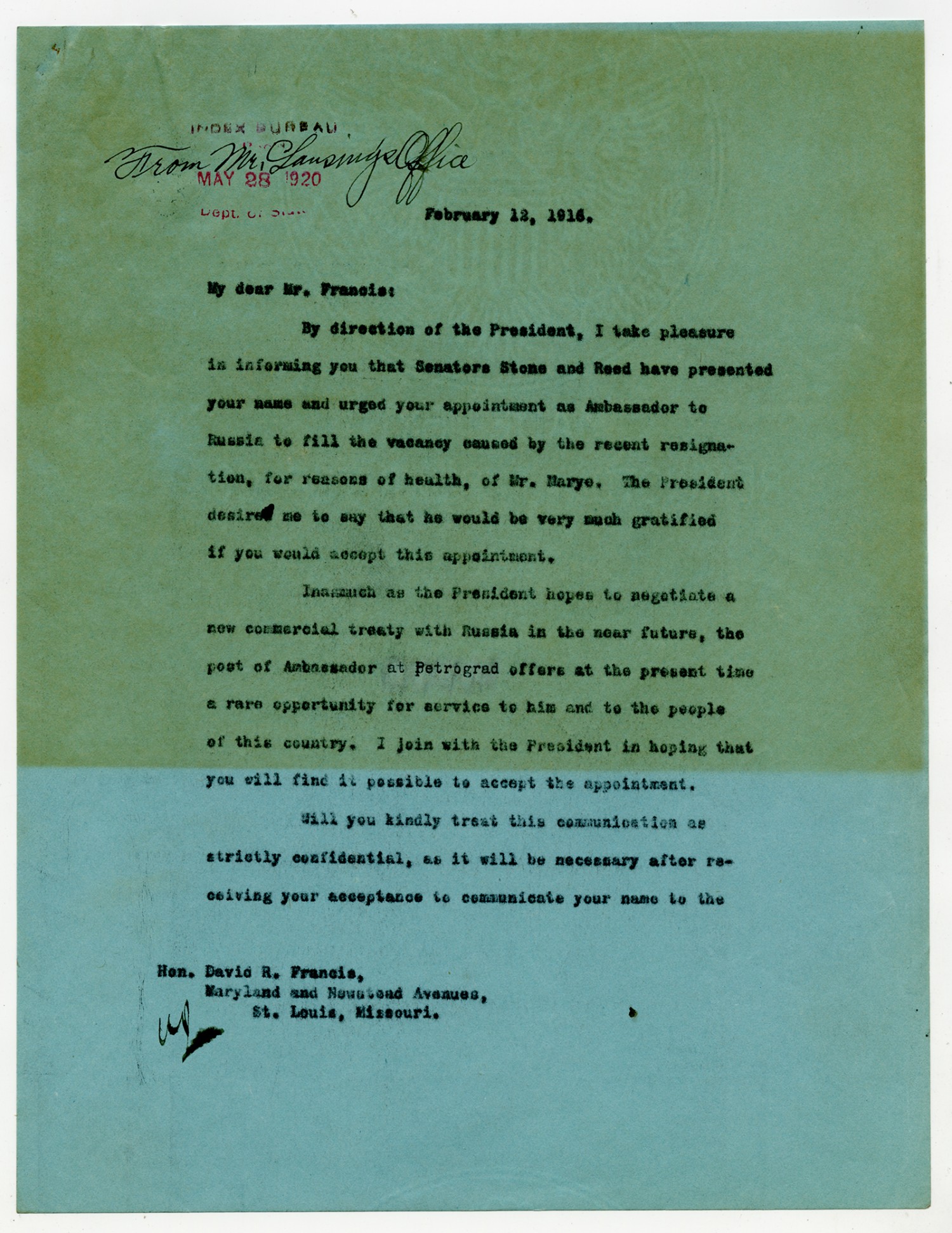Robert Lansing letter to David R. Francis - February 12, 1916