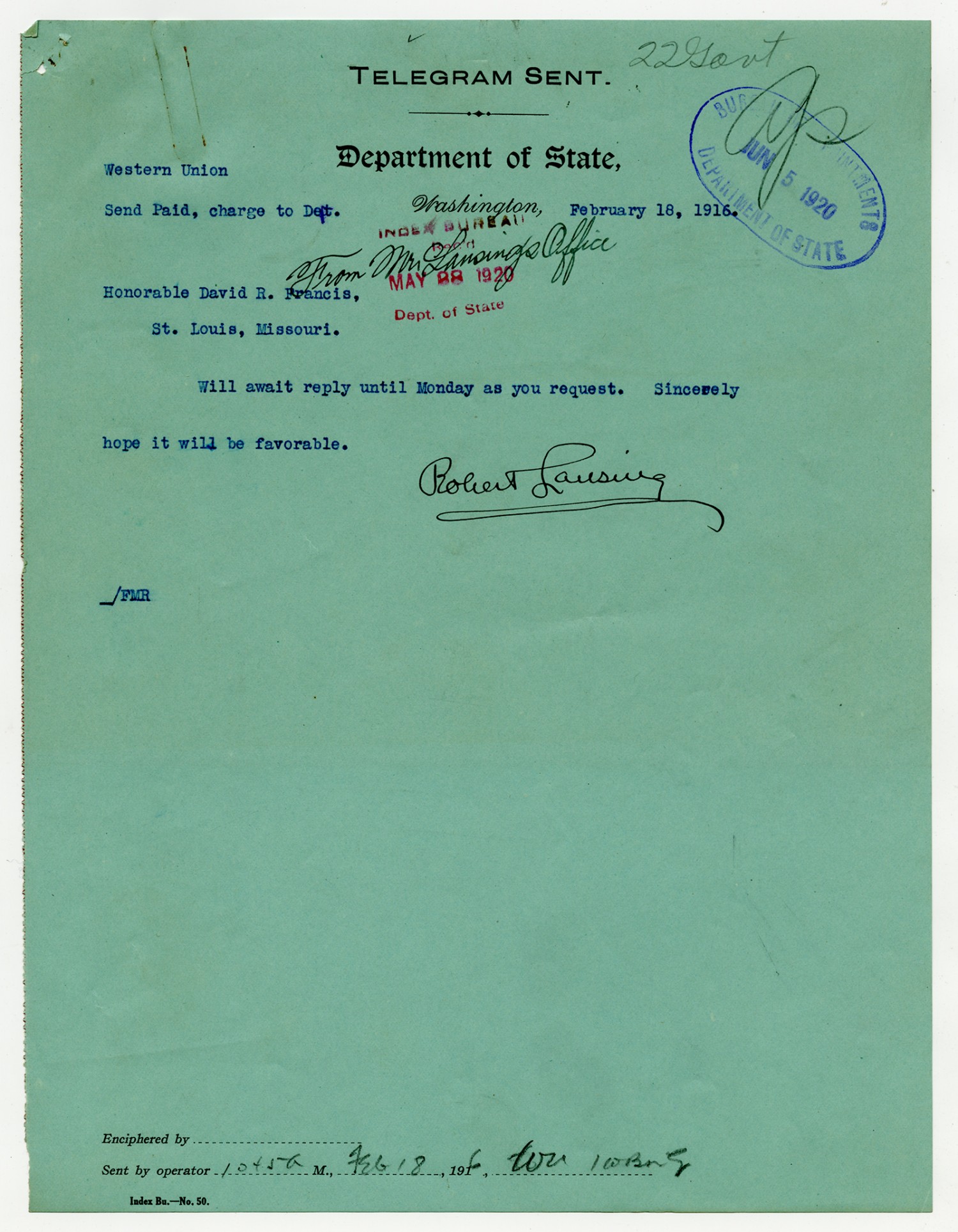 Robert Lansing telegram to David R. Francis - February 18, 1916