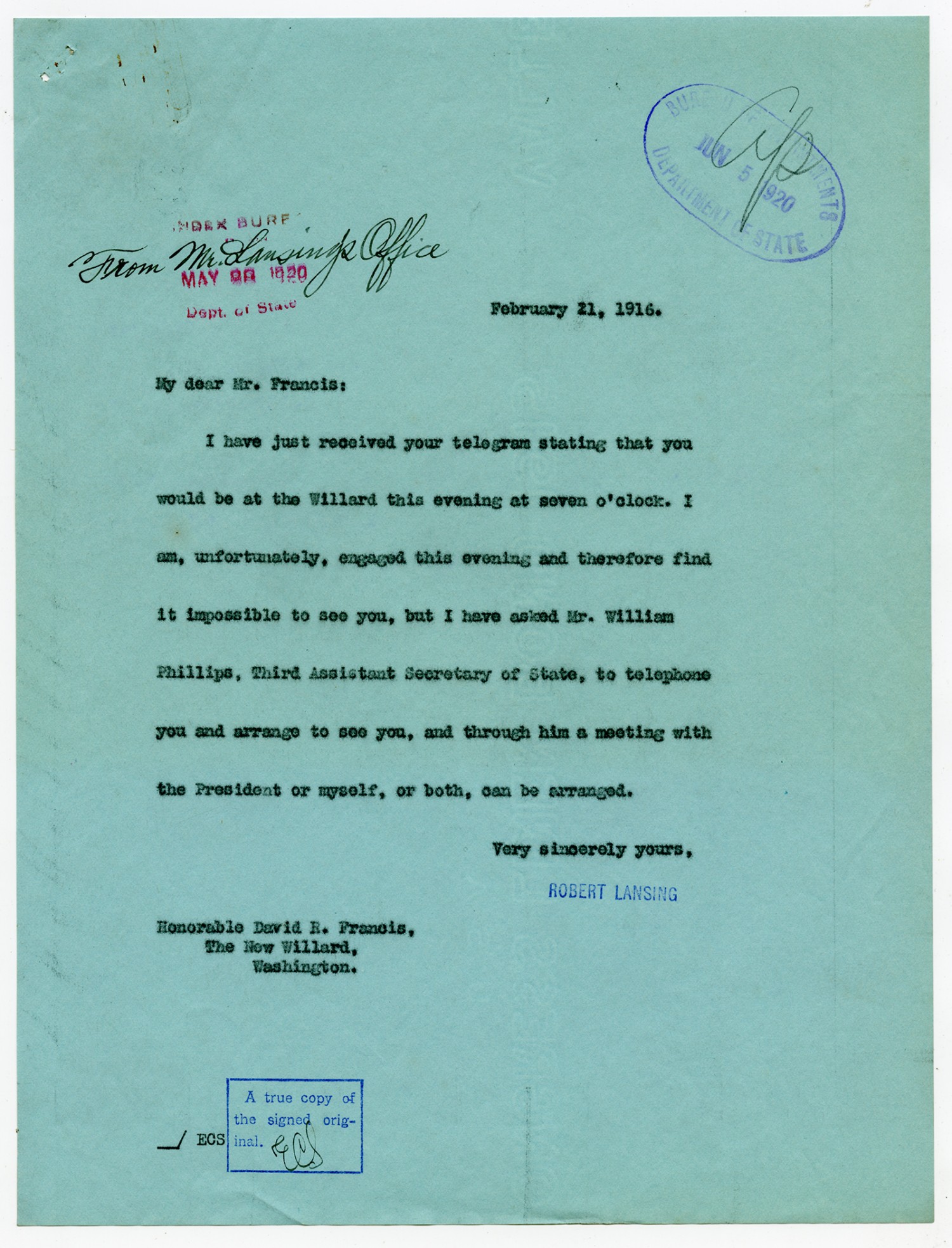 Secretary of State letter to David R. Francis - March 7, 1916