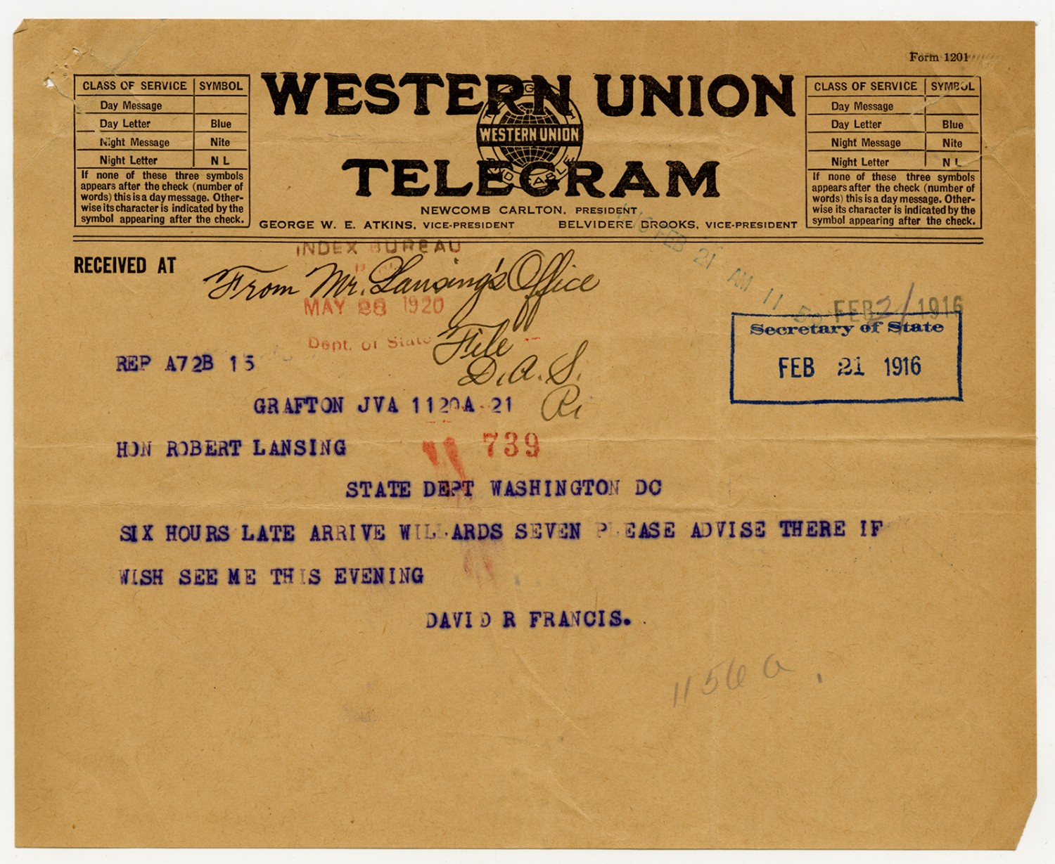 Robert Lansing letter to David R. Francis - February 21, 1916