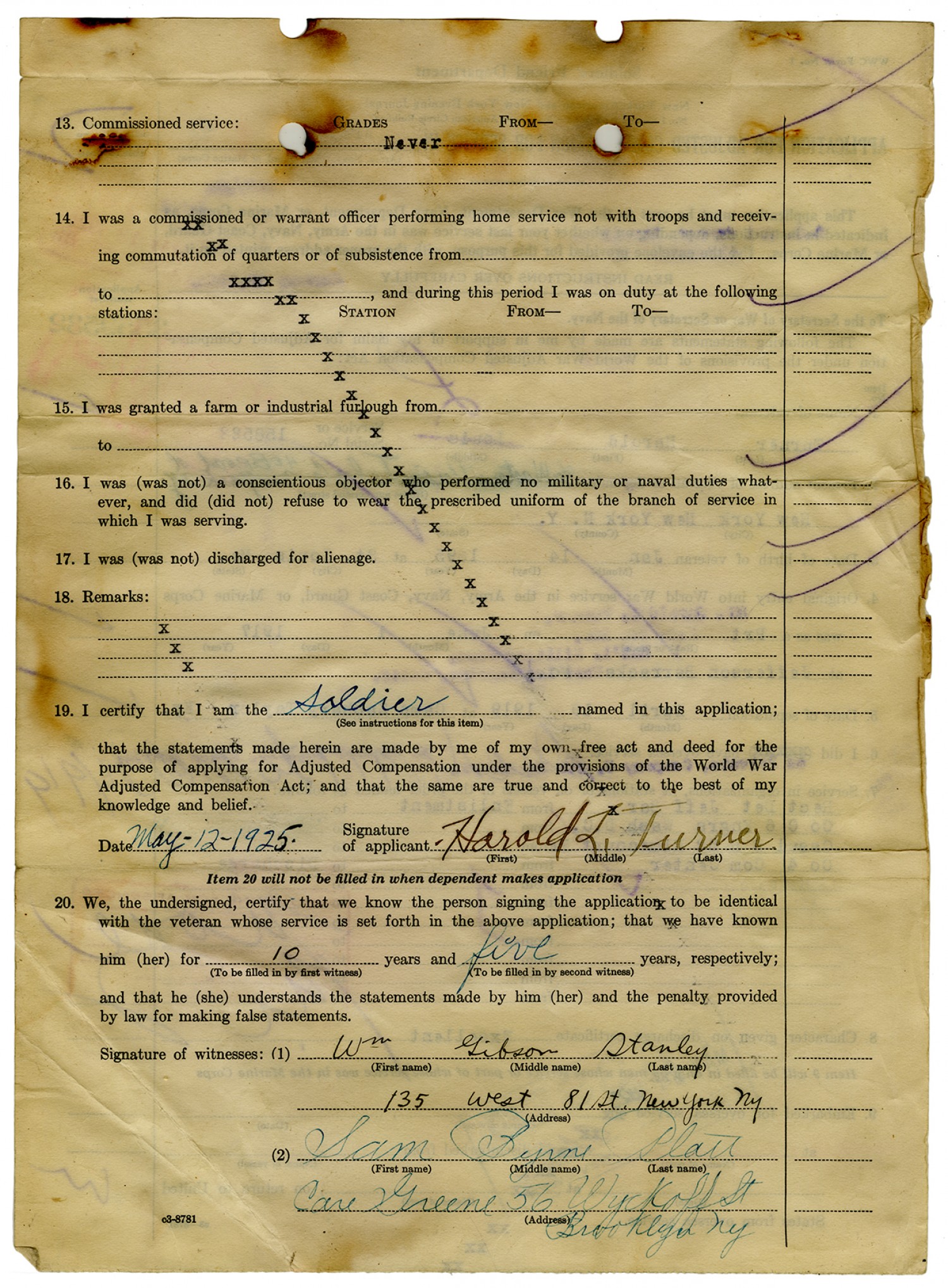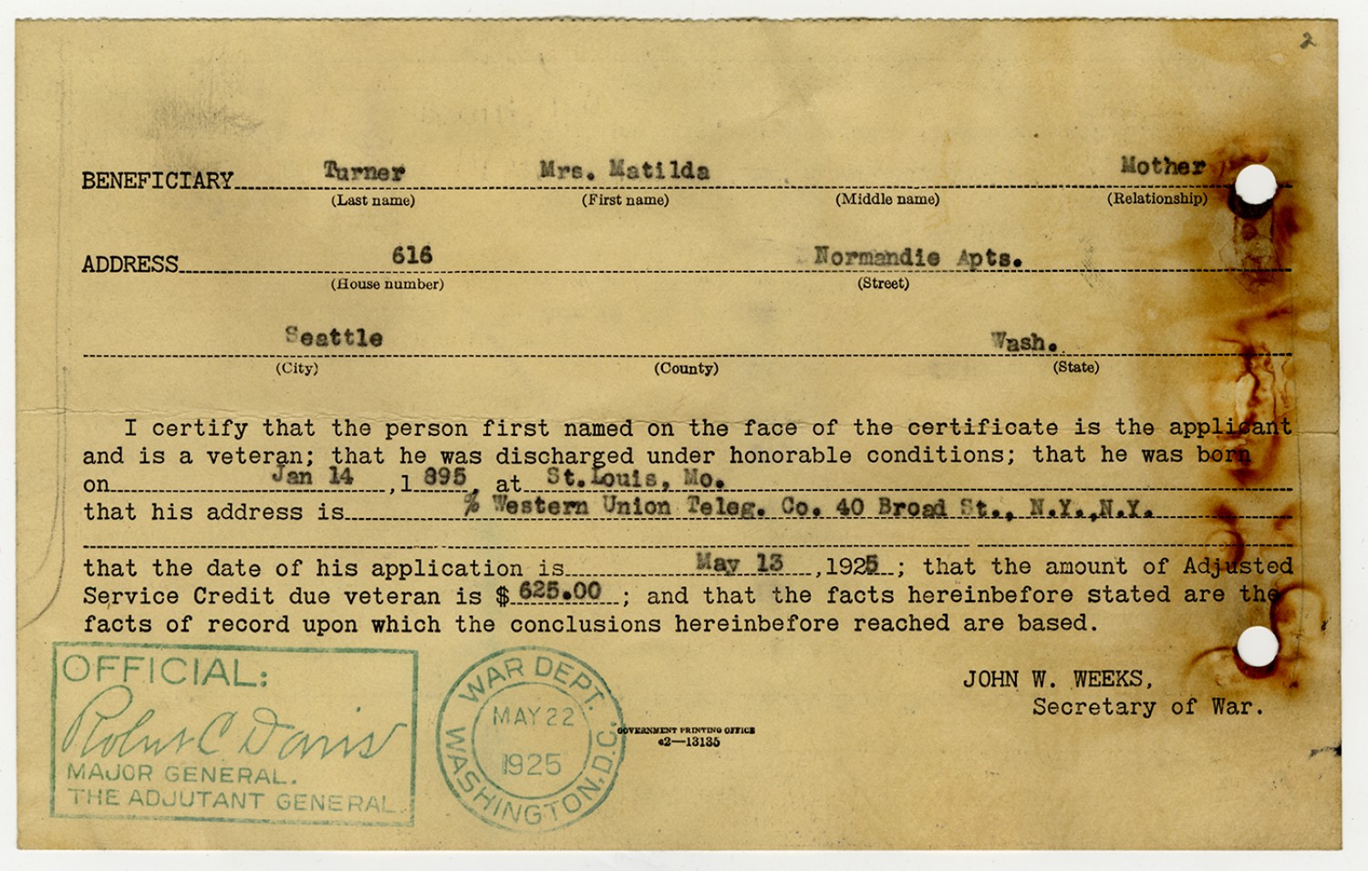 Application for Adjusted Compensation - May 12, 1925