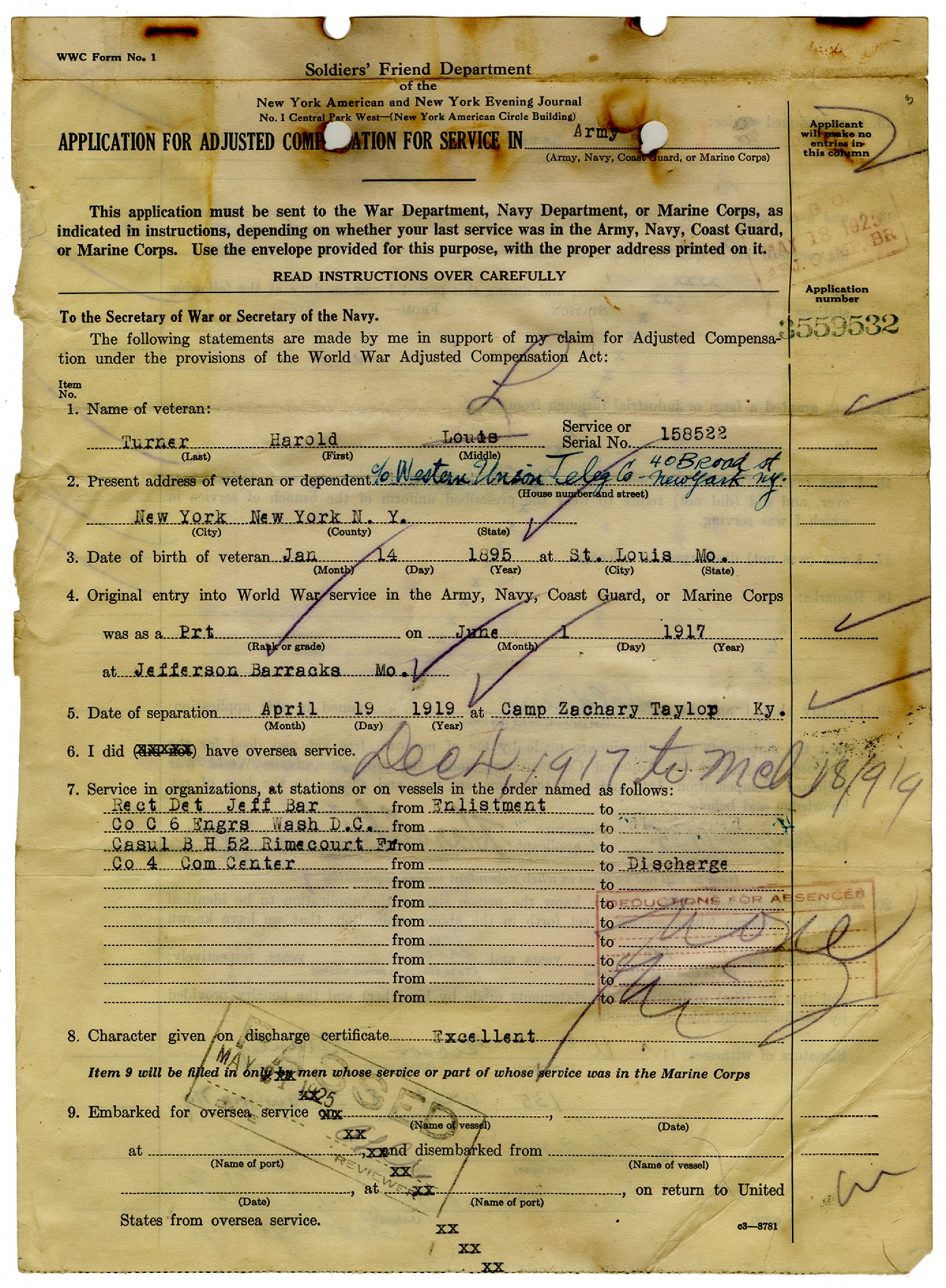 | Source | Turner, Harold; Official Military Personnel Files, 1912-1998; Records of the Army Staff, 1903-2009, Record Group 319; National Archives and Records Administration-National Personnel Records Center (St. Louis). |