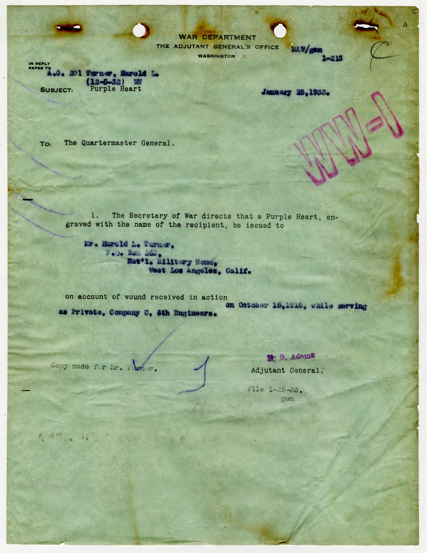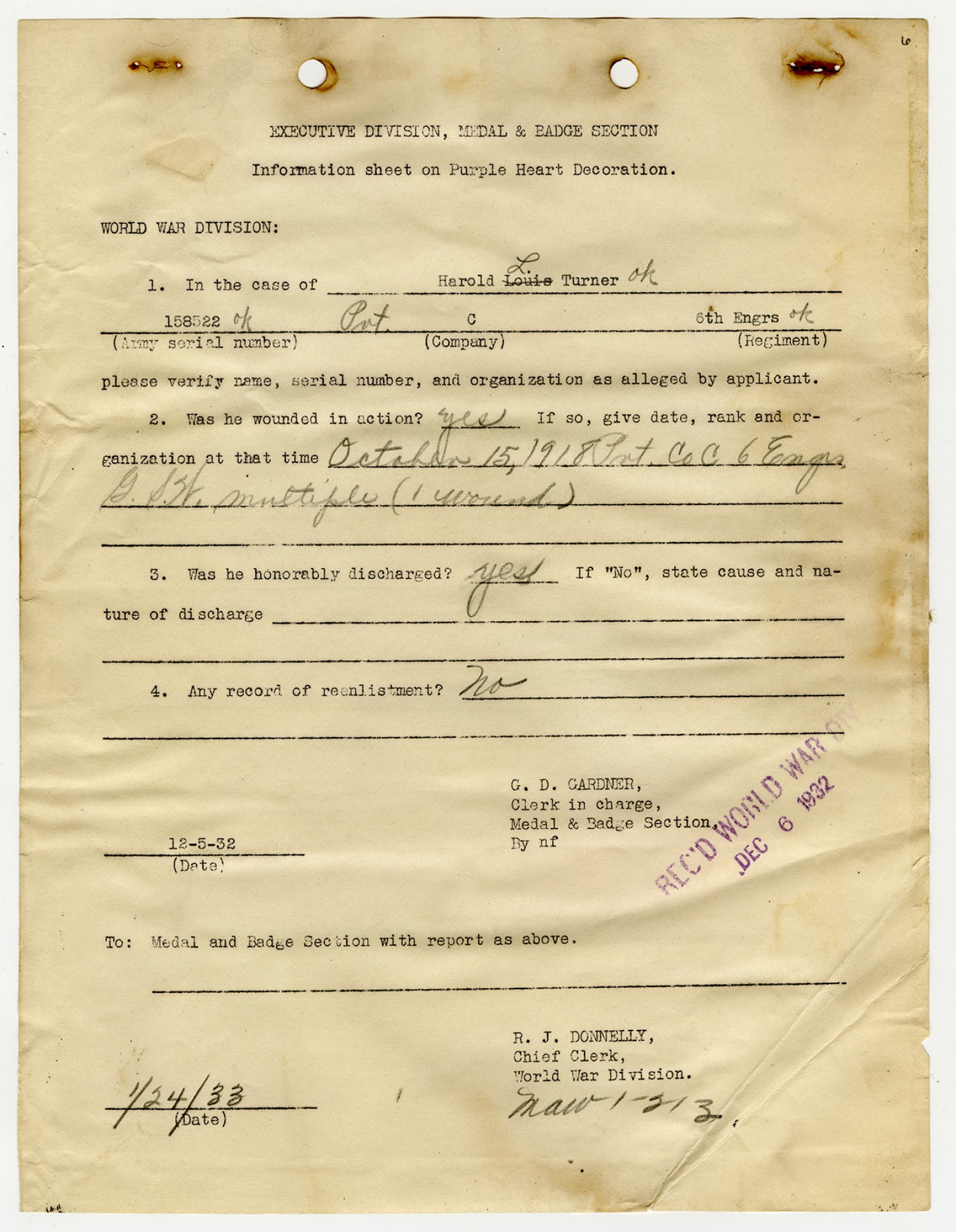 | Description | <p>Personnel record files for Harold Turner containing his service record, enlistment record, and information pertaining to his purple heart. Harold Turner served with Company C, 6th Engineers. He received the Purple Heart for his heroism while fighting in the Meuse-Argonne offensive.</p> |