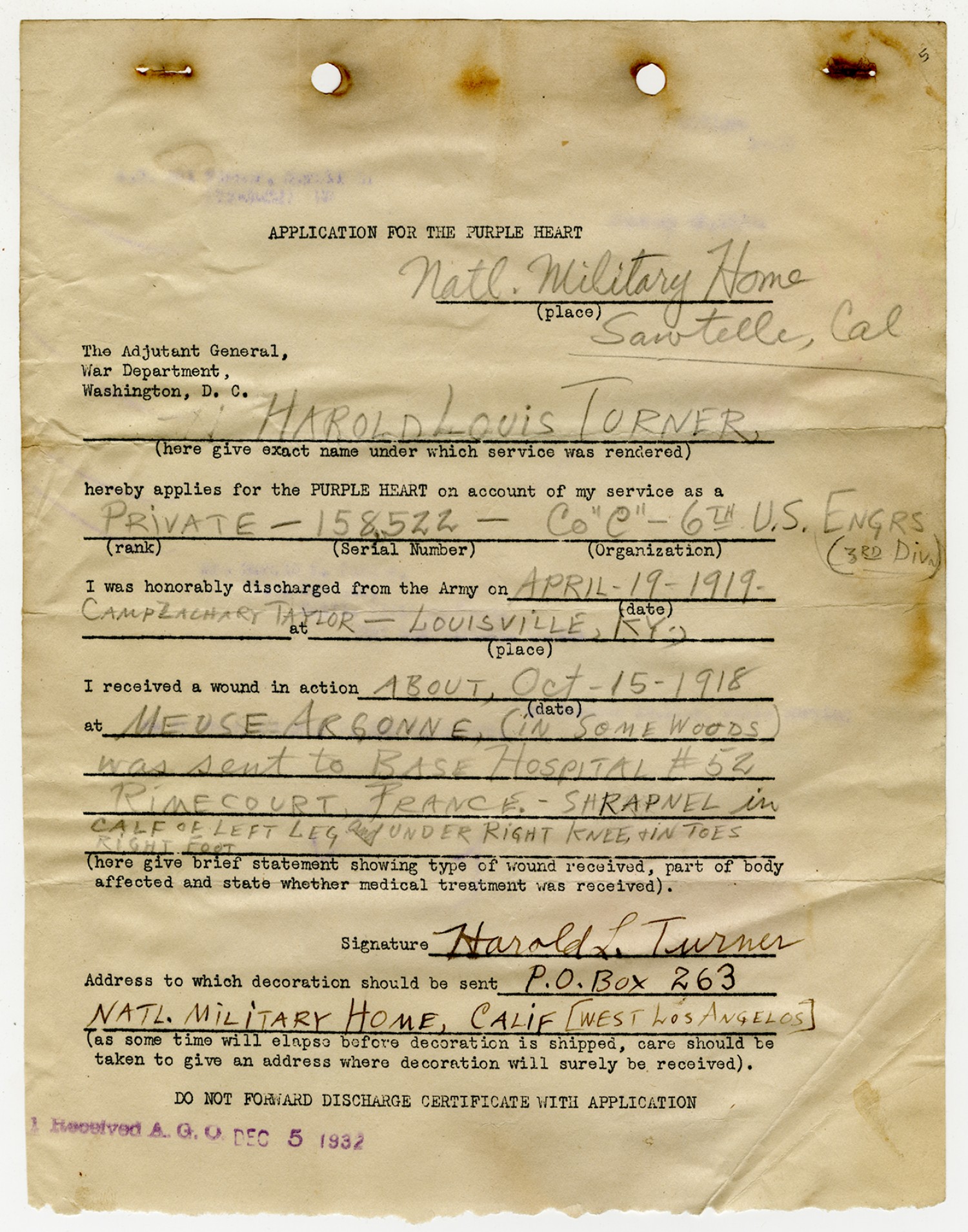 Purple Heart Application - December 5, 1932