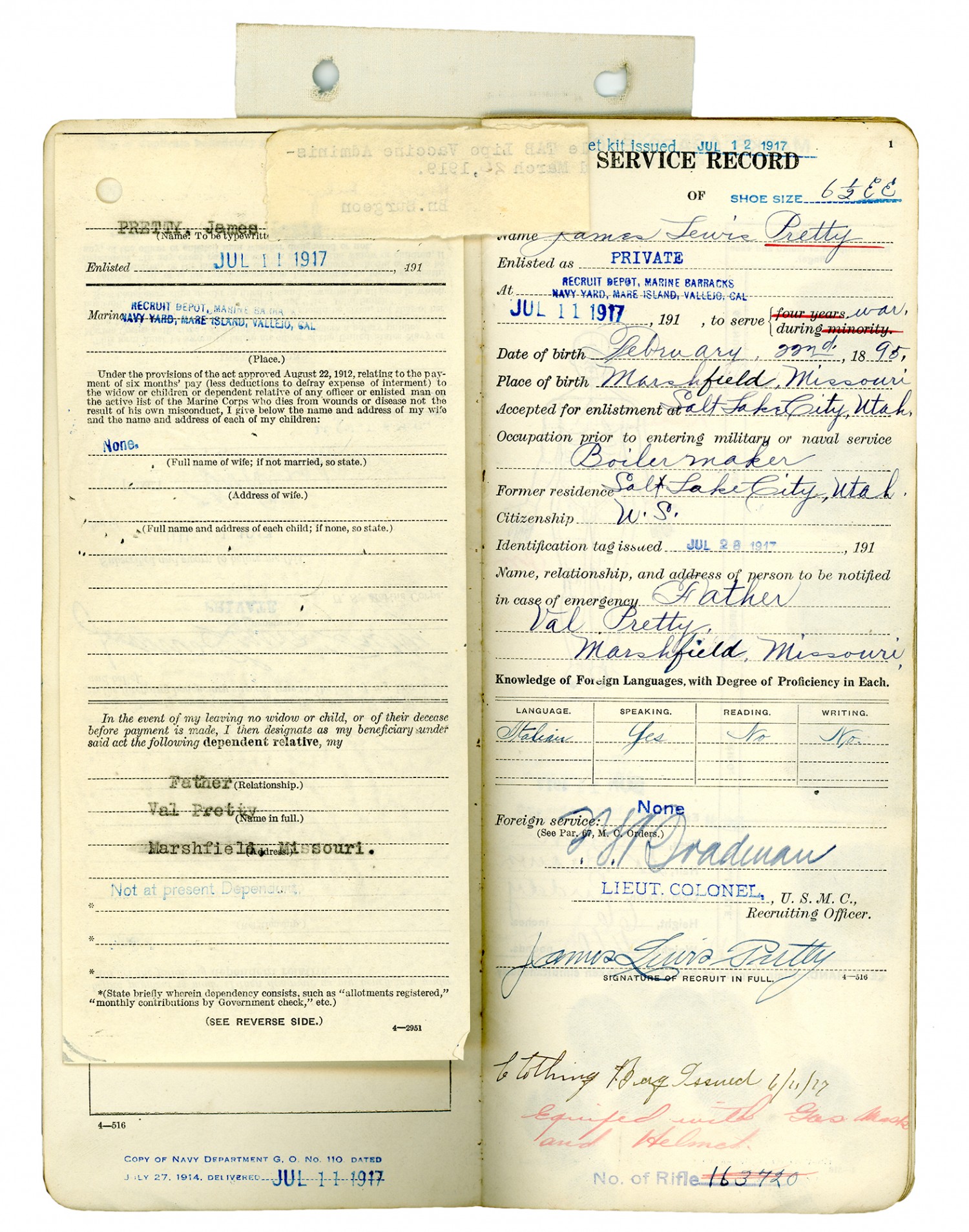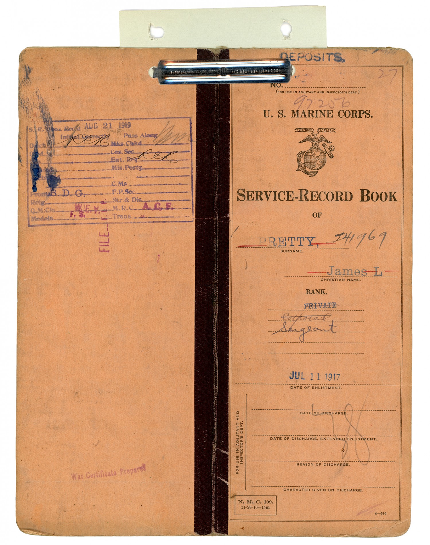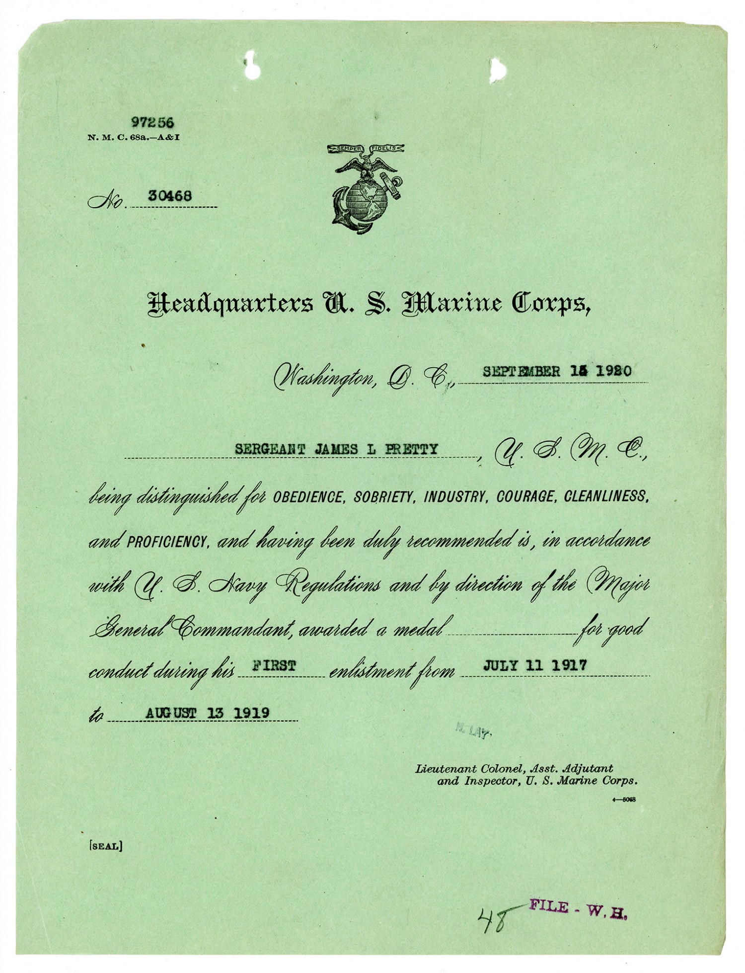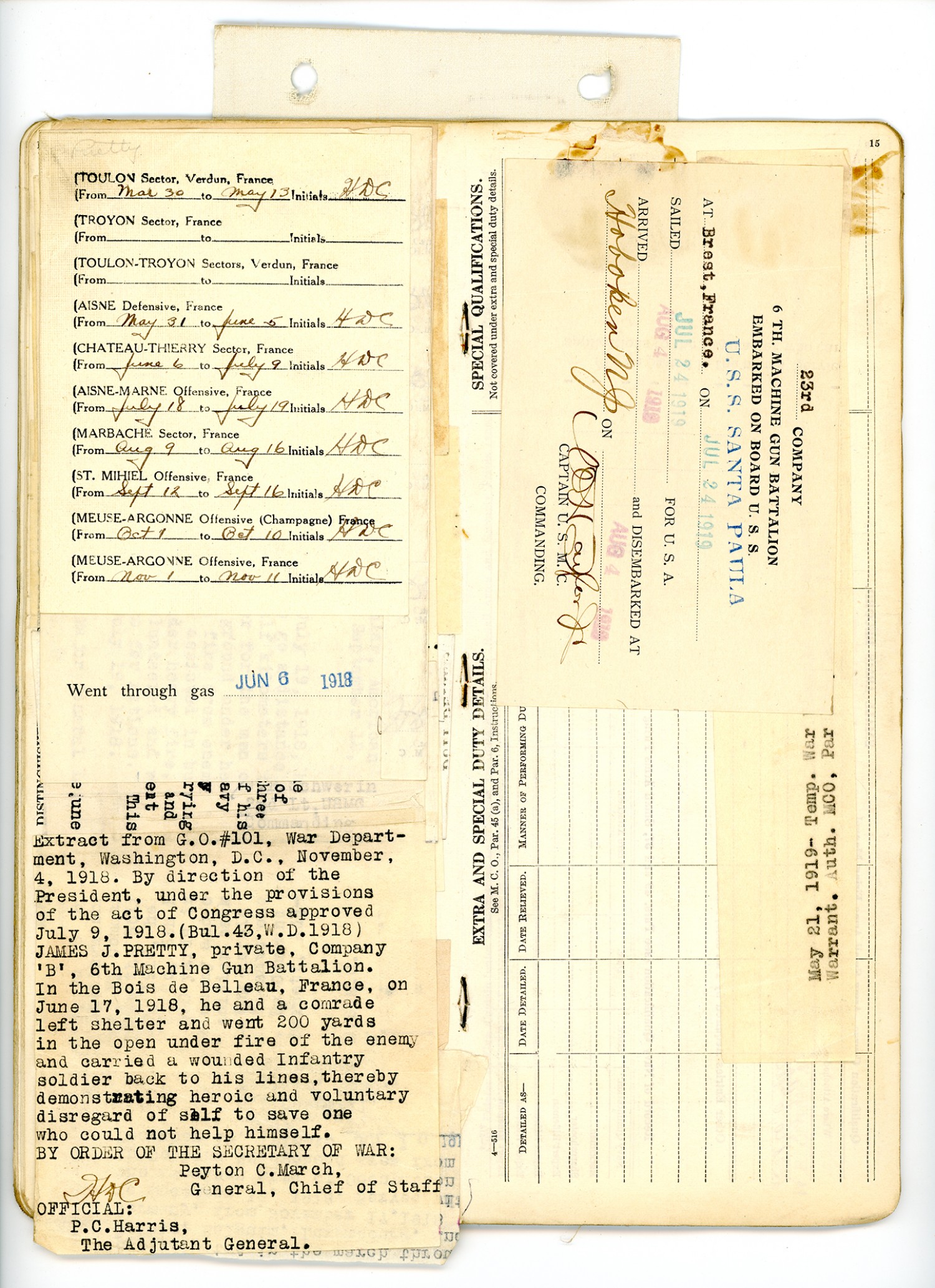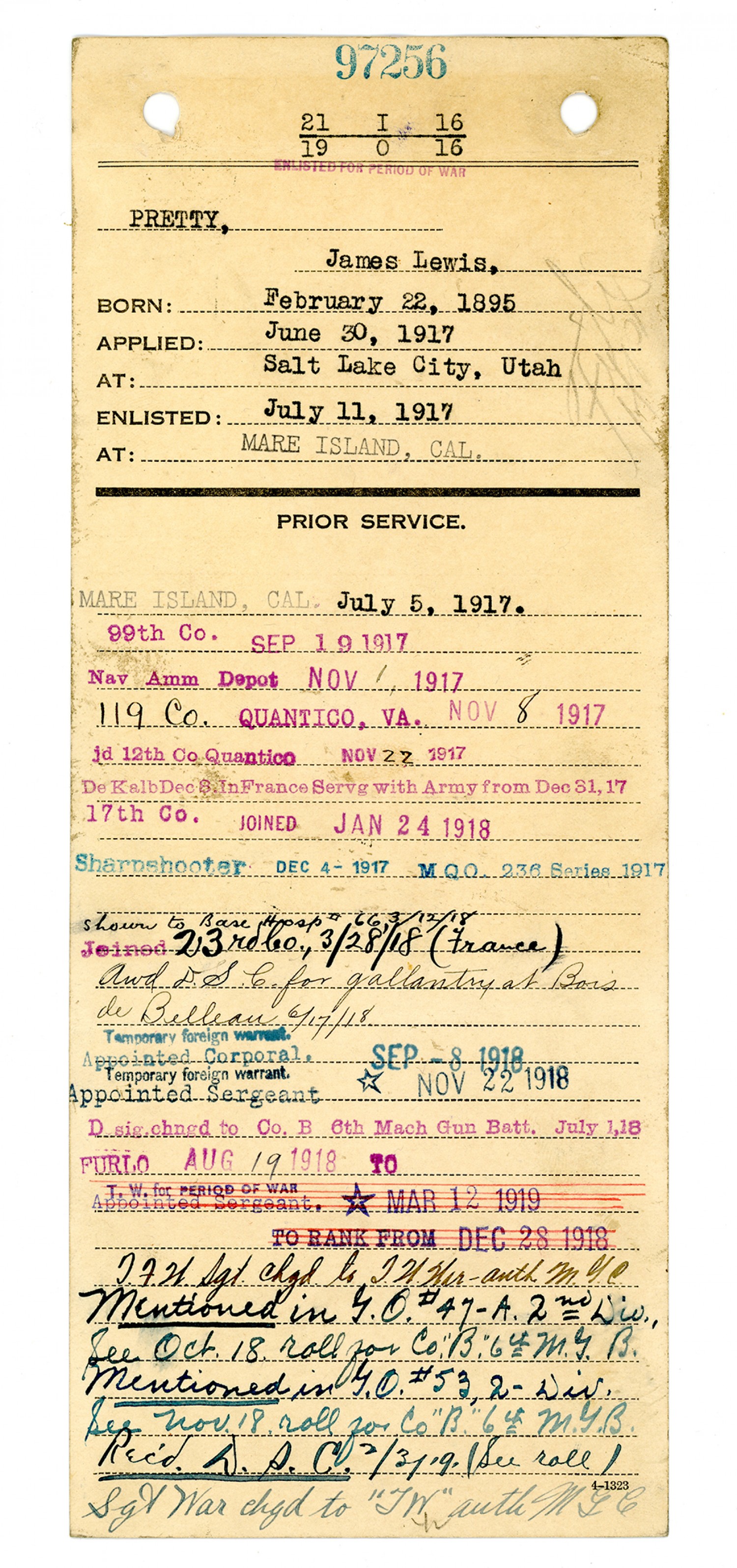 | Description | <p>Personnel record files for James L. Pretty containing service records, letters awarding medals of honor, records of payment and transferal requests. James Lewis Pretty was a Private and later Sergeant who served in the 23rd Company, 6th Machine Gun Battalion, 2nd Division of the U.S. Marine Corps, Expeditionary Forces. He was born on June 30, 1917 in Marshfield, Missouri and enlisted to the military on July 11, 1917 at MB, Mare Island, California until August 13, 1919 at MB, Quantico, Virginia. He was awarded the distinguished service cross for his service in the Bois De Belleau or Battle of Belleau Wood near the Marne River in France. </p> |