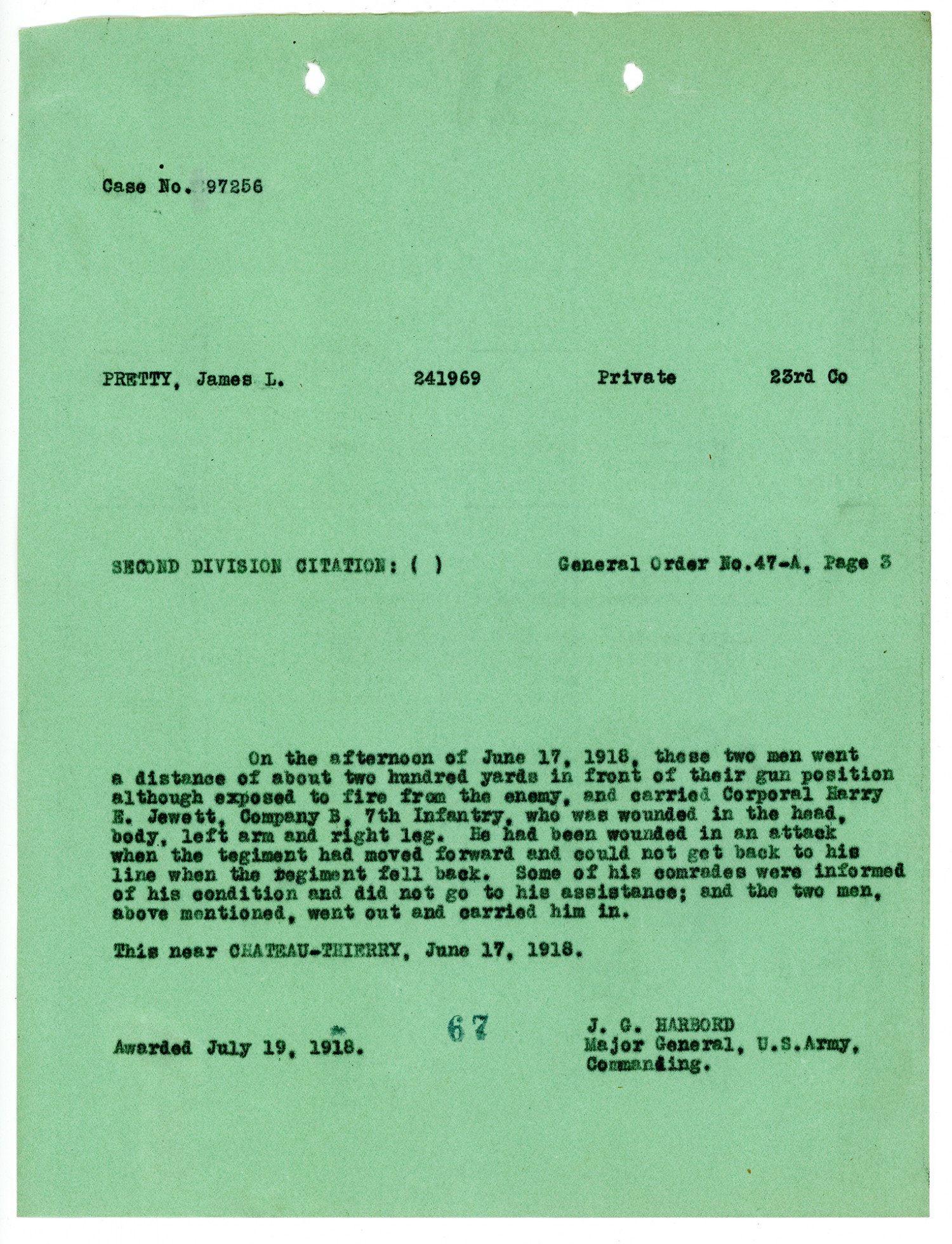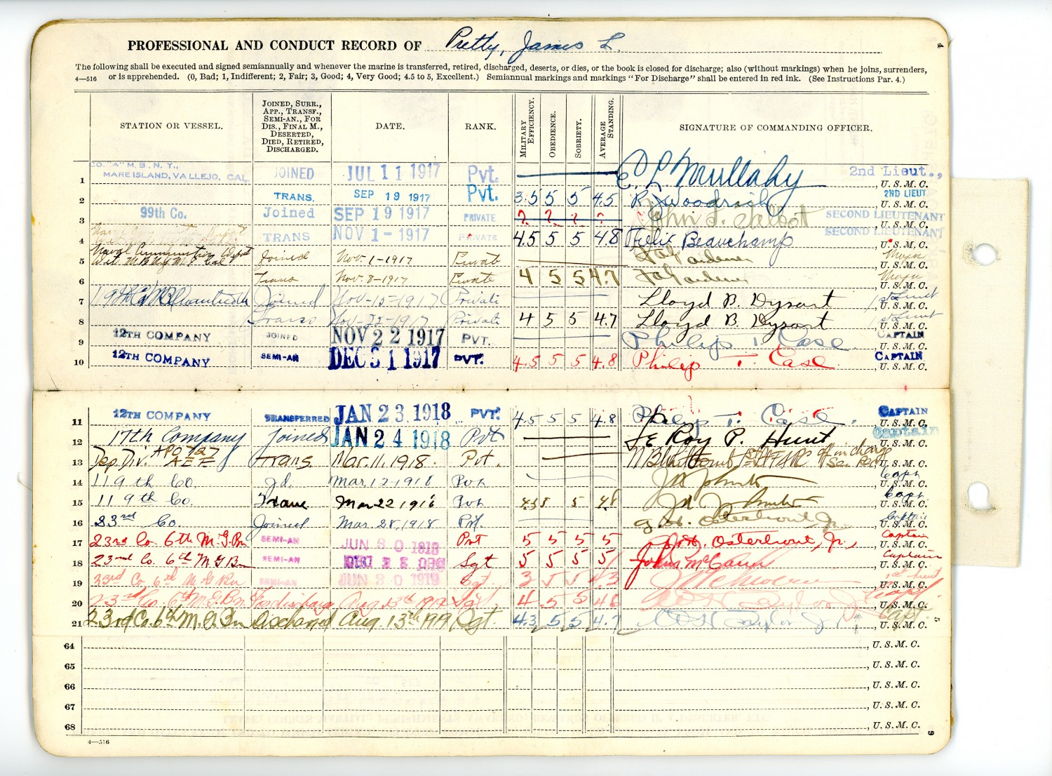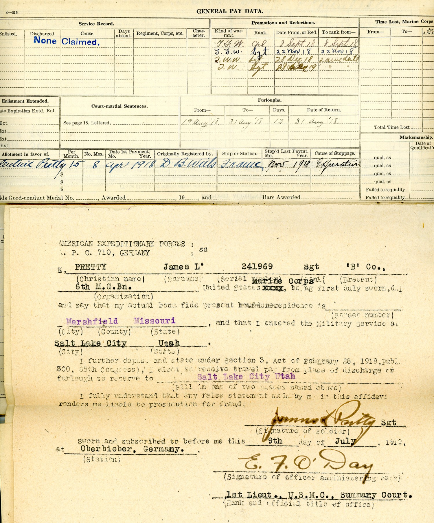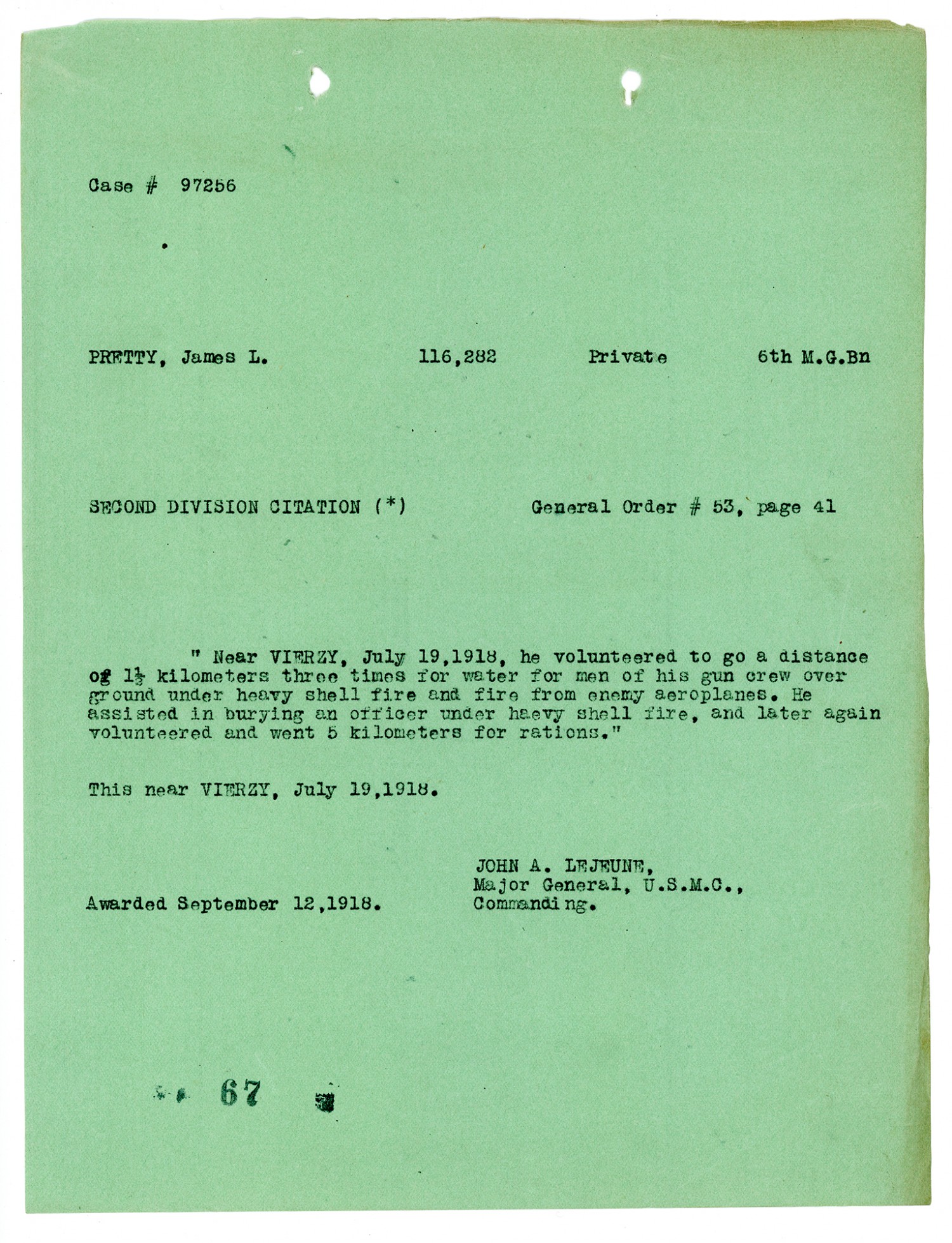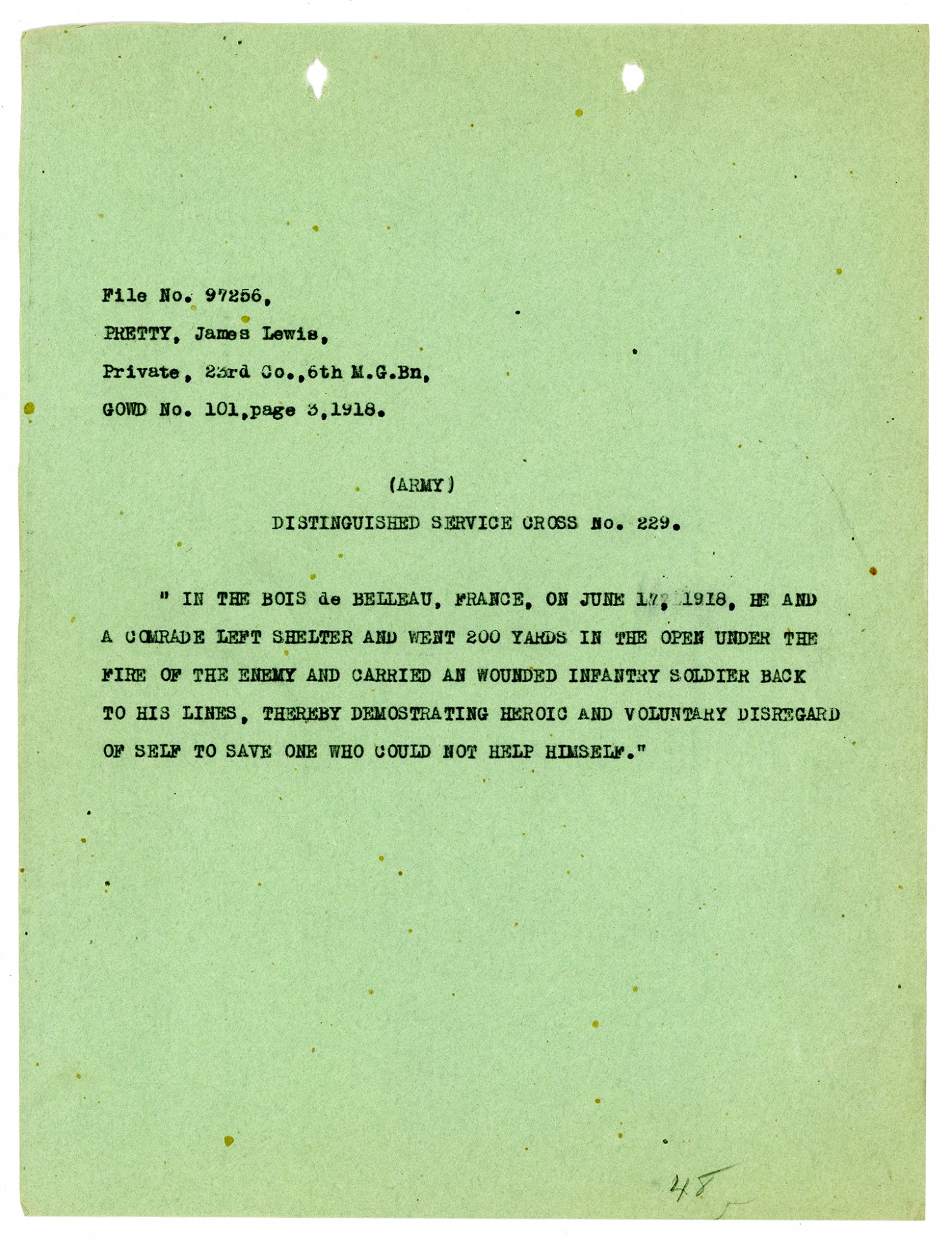 | Description | <p>Personnel record files for James L. Pretty containing service records, letters awarding medals of honor, records of payment and transferal requests. James Lewis Pretty was a Private and later Sergeant who served in the 23rd Company, 6th Machine Gun Battalion, 2nd Division of the U.S. Marine Corps, Expeditionary Forces. He was born on June 30, 1917 in Marshfield, Missouri and enlisted to the military on July 11, 1917 at MB, Mare Island, California until August 13, 1919 at MB, Quantico, Virginia. He was awarded the distinguished service cross for his service in the Bois De Belleau or Battle of Belleau Wood near the Marne River in France. </p> |