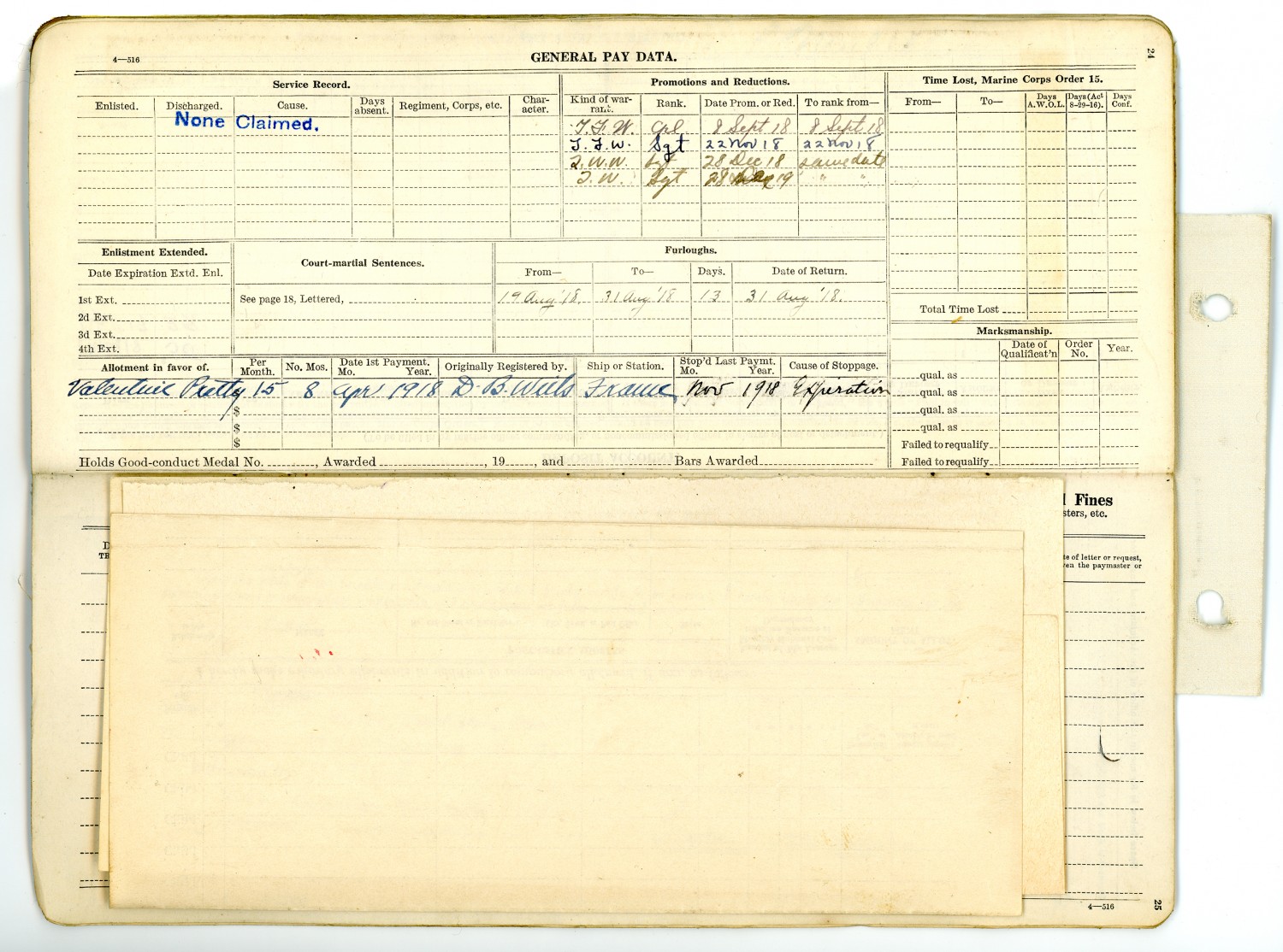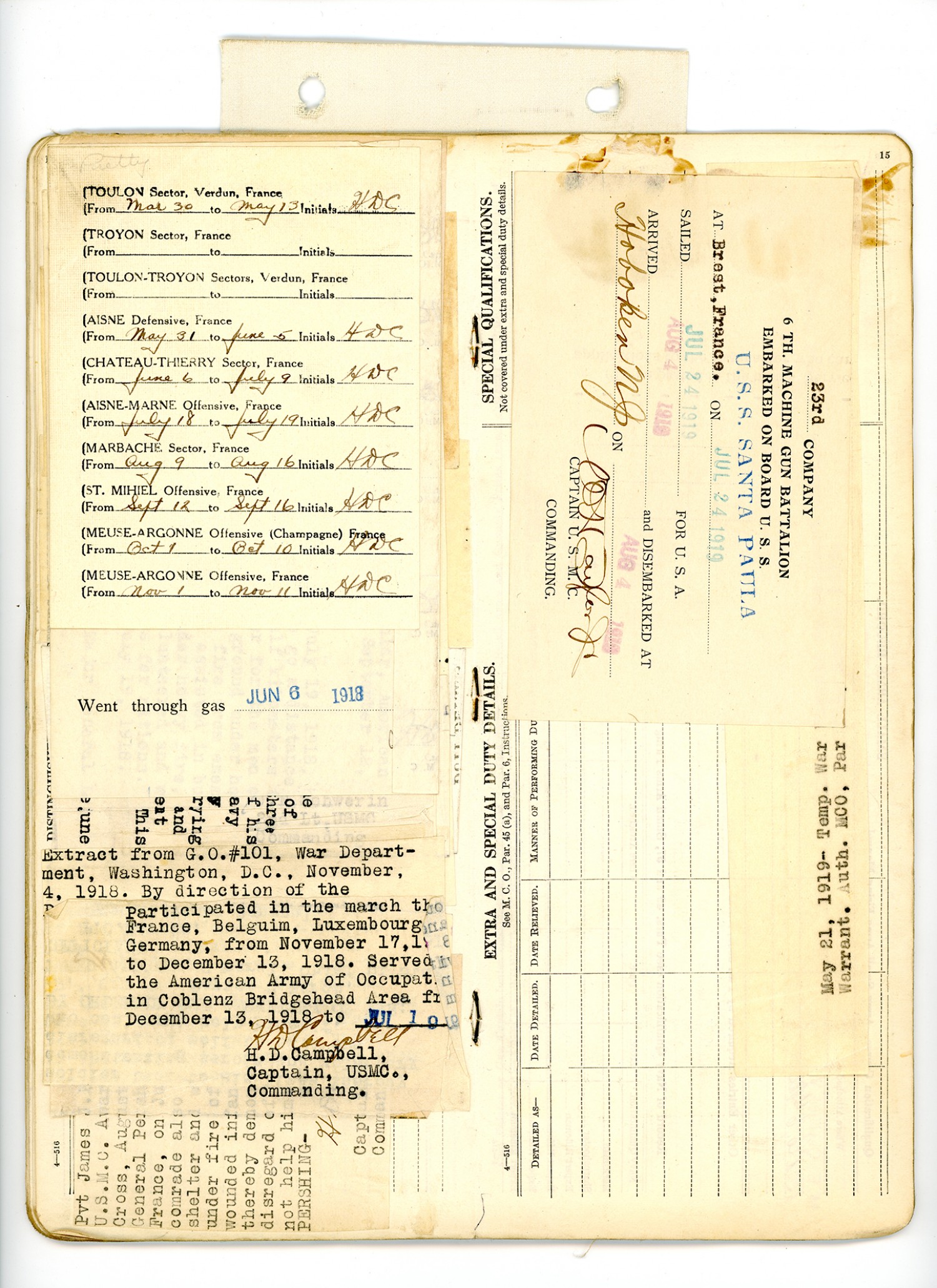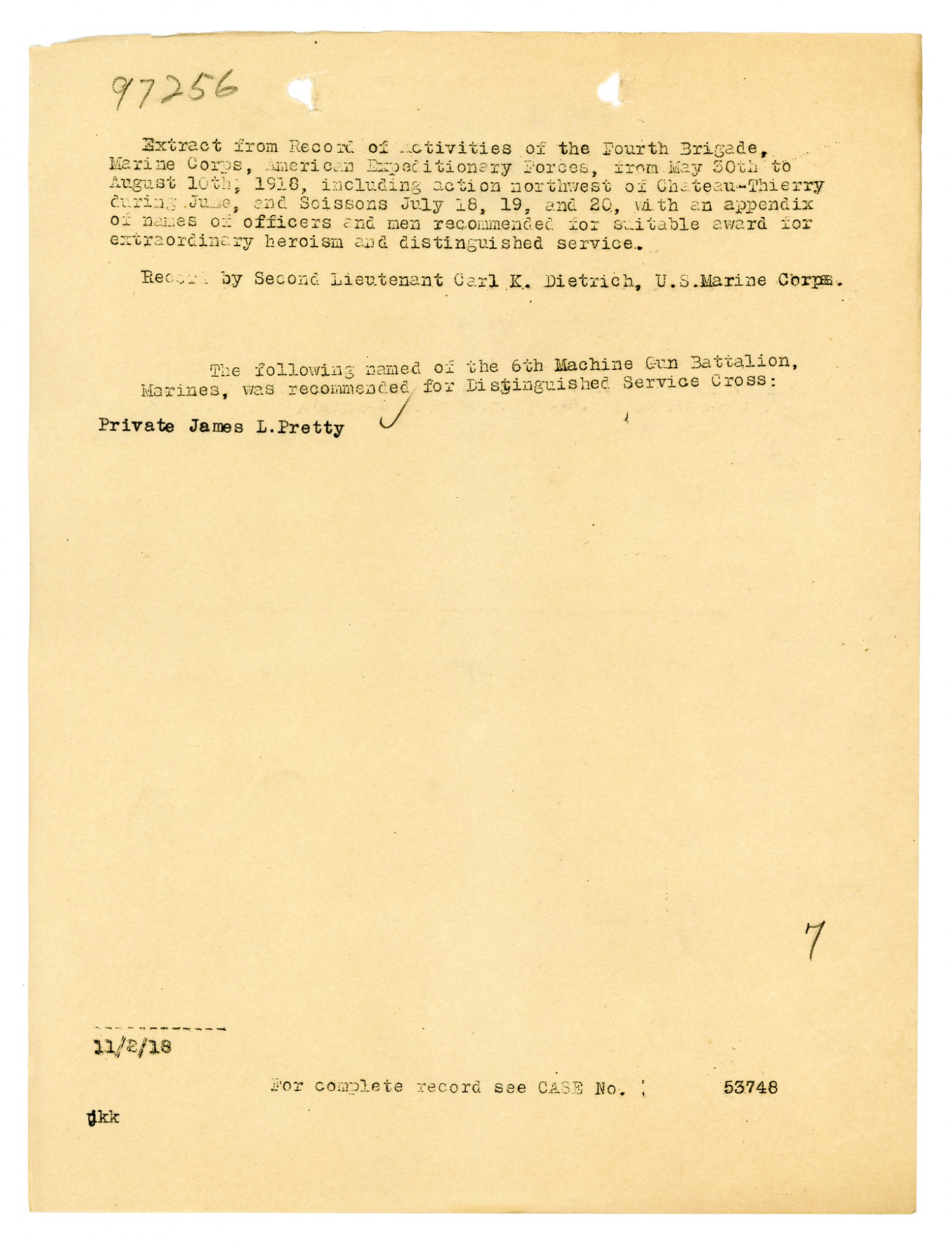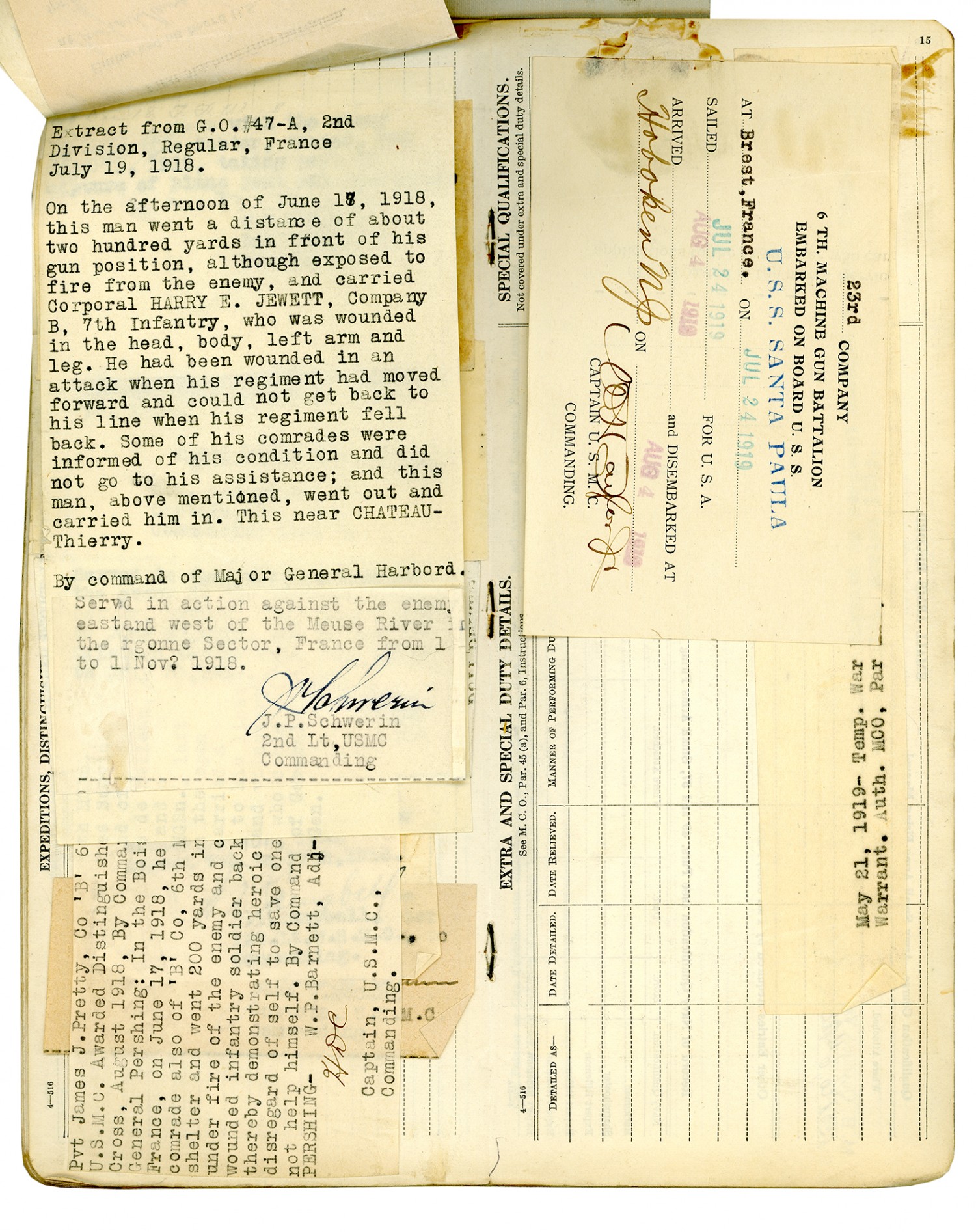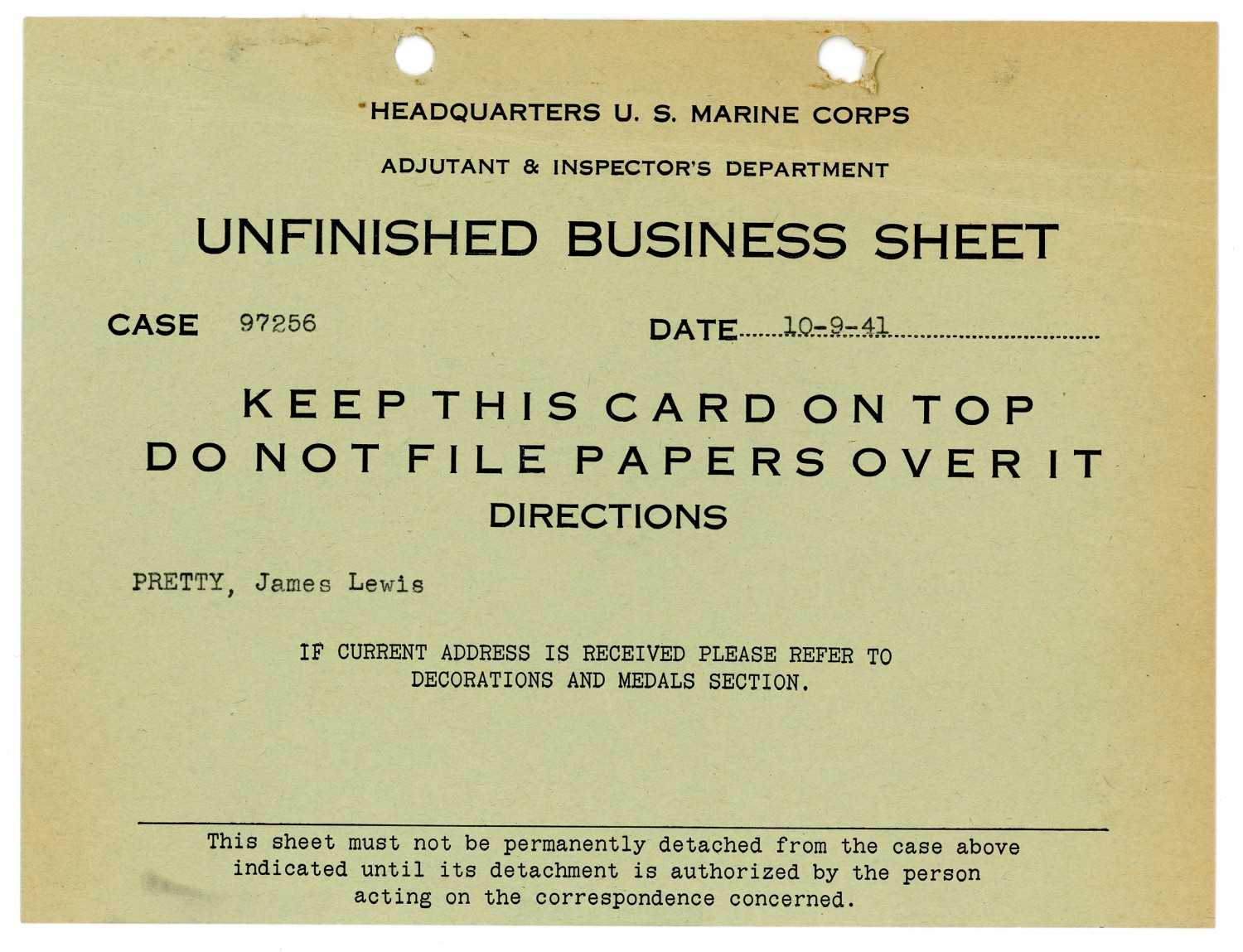 | Description | <p>Personnel record files for James L. Pretty containing service records, letters awarding medals of honor, records of payment and transferal requests. James Lewis Pretty was a Private and later Sergeant who served in the 23rd Company, 6th Machine Gun Battalion, 2nd Division of the U.S. Marine Corps, Expeditionary Forces. He was born on June 30, 1917 in Marshfield, Missouri and enlisted to the military on July 11, 1917 at MB, Mare Island, California until August 13, 1919 at MB, Quantico, Virginia. He was awarded the distinguished service cross for his service in the Bois De Belleau or Battle of Belleau Wood near the Marne River in France. </p> |