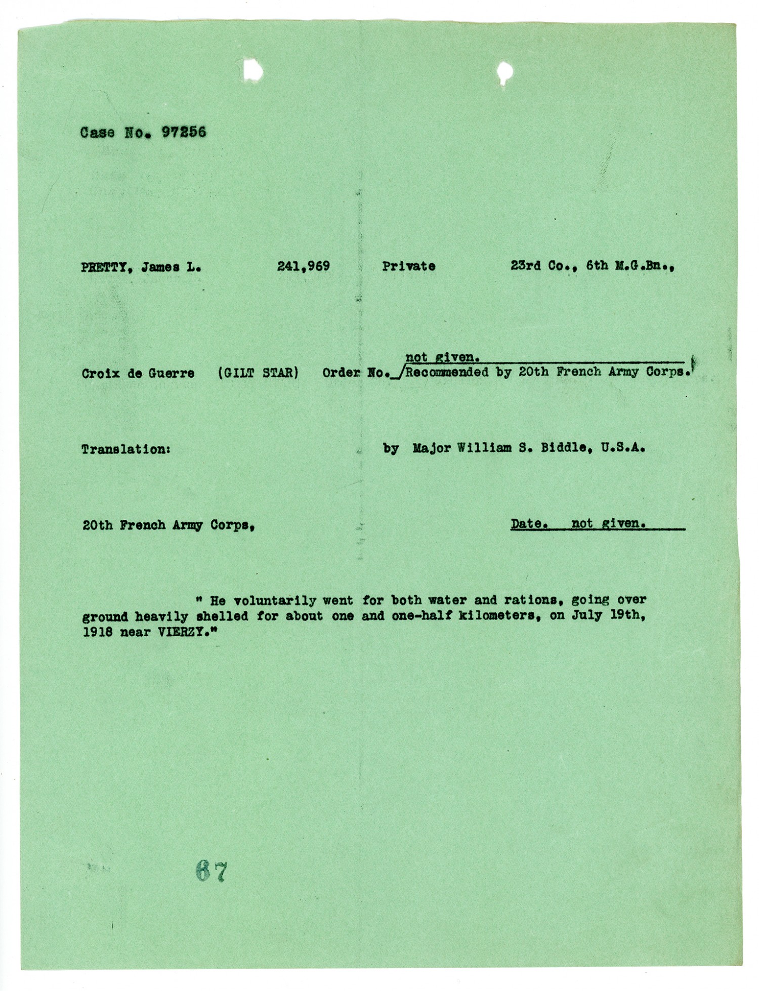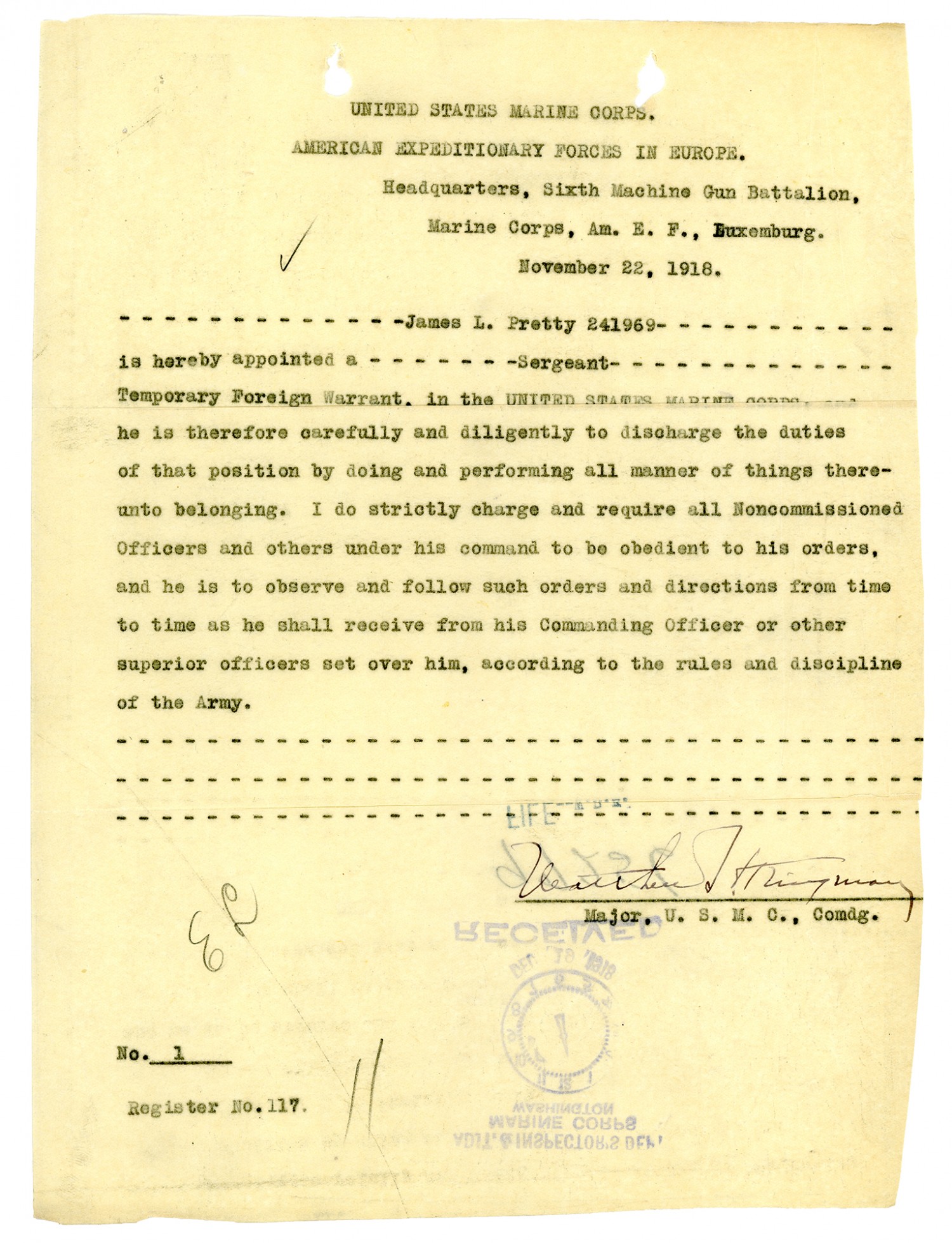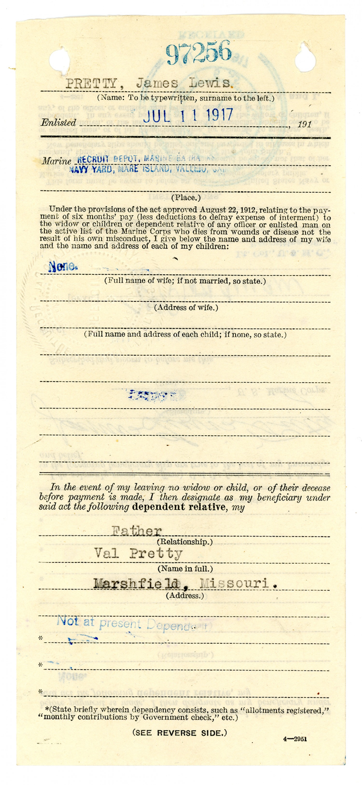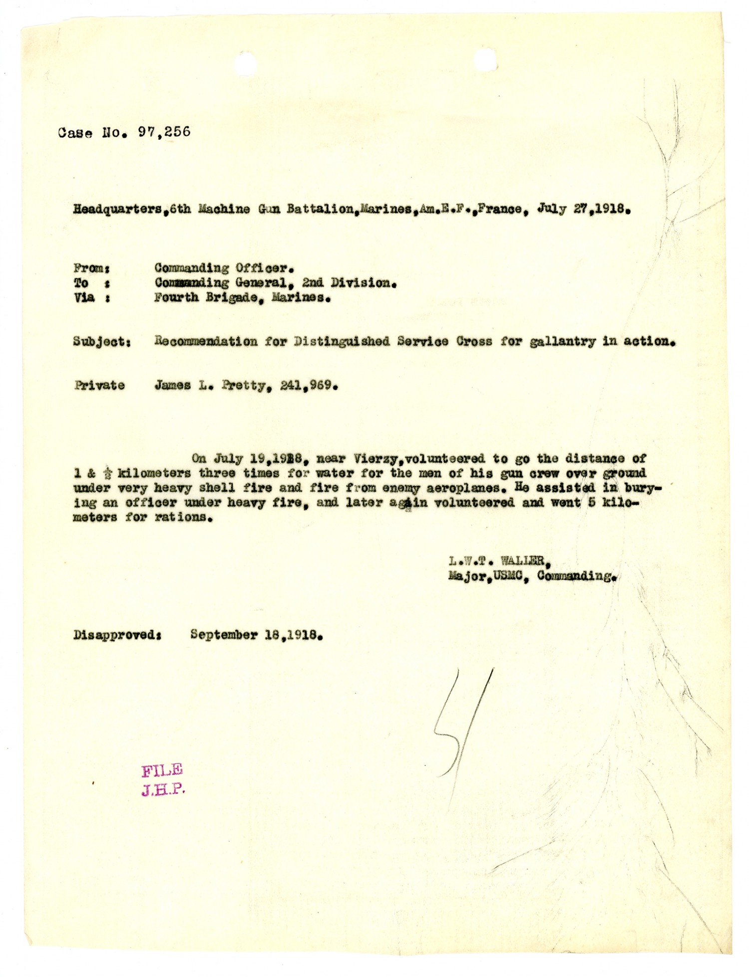| Description | <p>Personnel record files for James L. Pretty containing service records, letters awarding medals of honor, records of payment and transferal requests. James Lewis Pretty was a Private and later Sergeant who served in the 23rd Company, 6th Machine Gun Battalion, 2nd Division of the U.S. Marine Corps, Expeditionary Forces. He was born on June 30, 1917 in Marshfield, Missouri and enlisted to the military on July 11, 1917 at MB, Mare Island, California until August 13, 1919 at MB, Quantico, Virginia. He was awarded the distinguished service cross for his service in the Bois De Belleau or Battle of Belleau Wood near the Marne River in France. </p> |