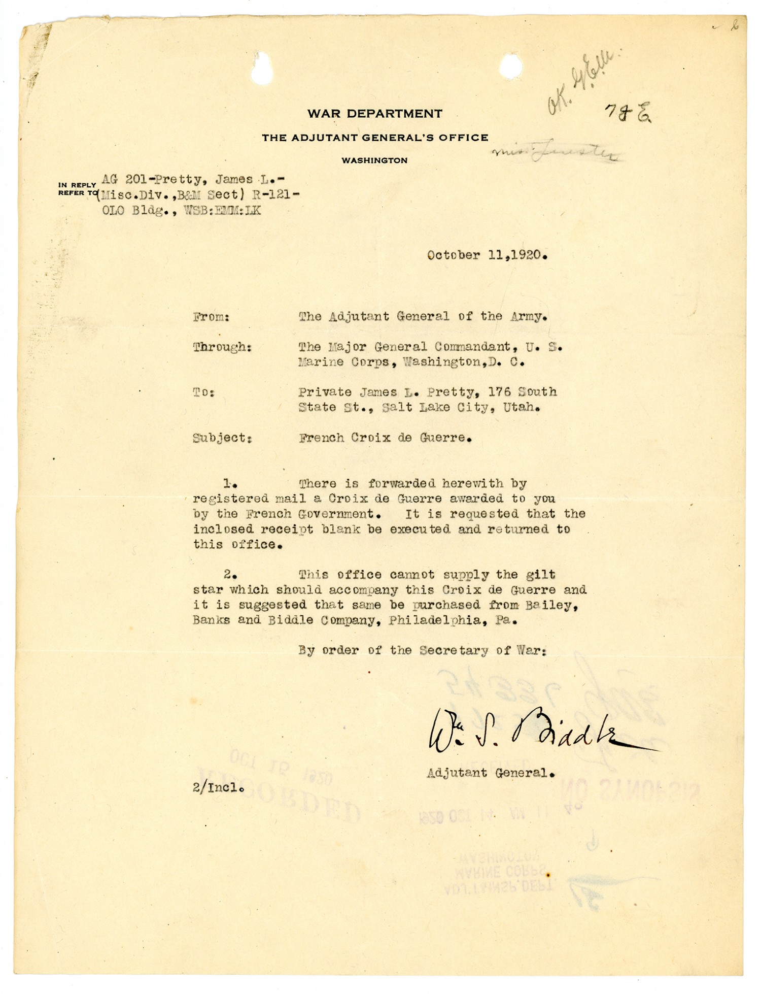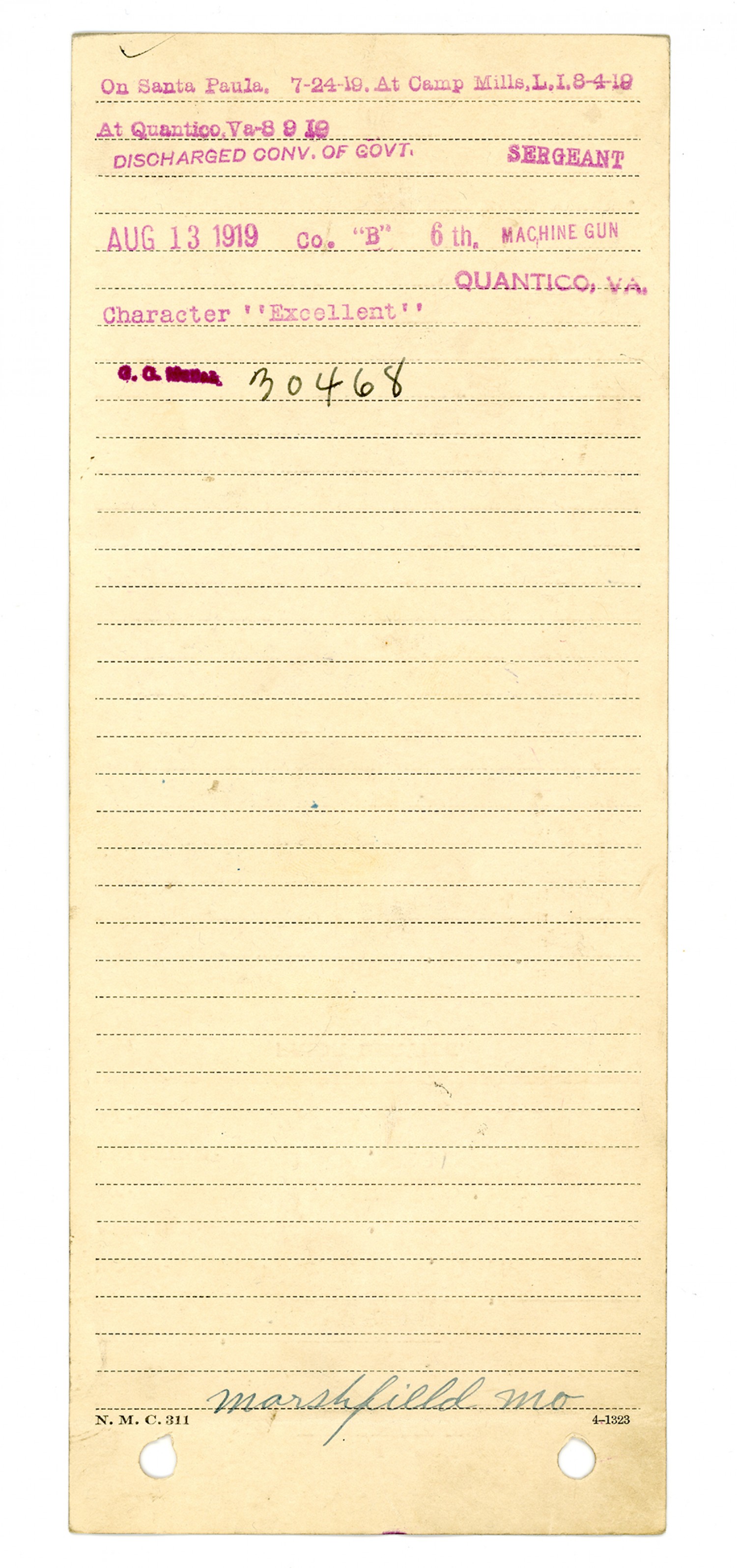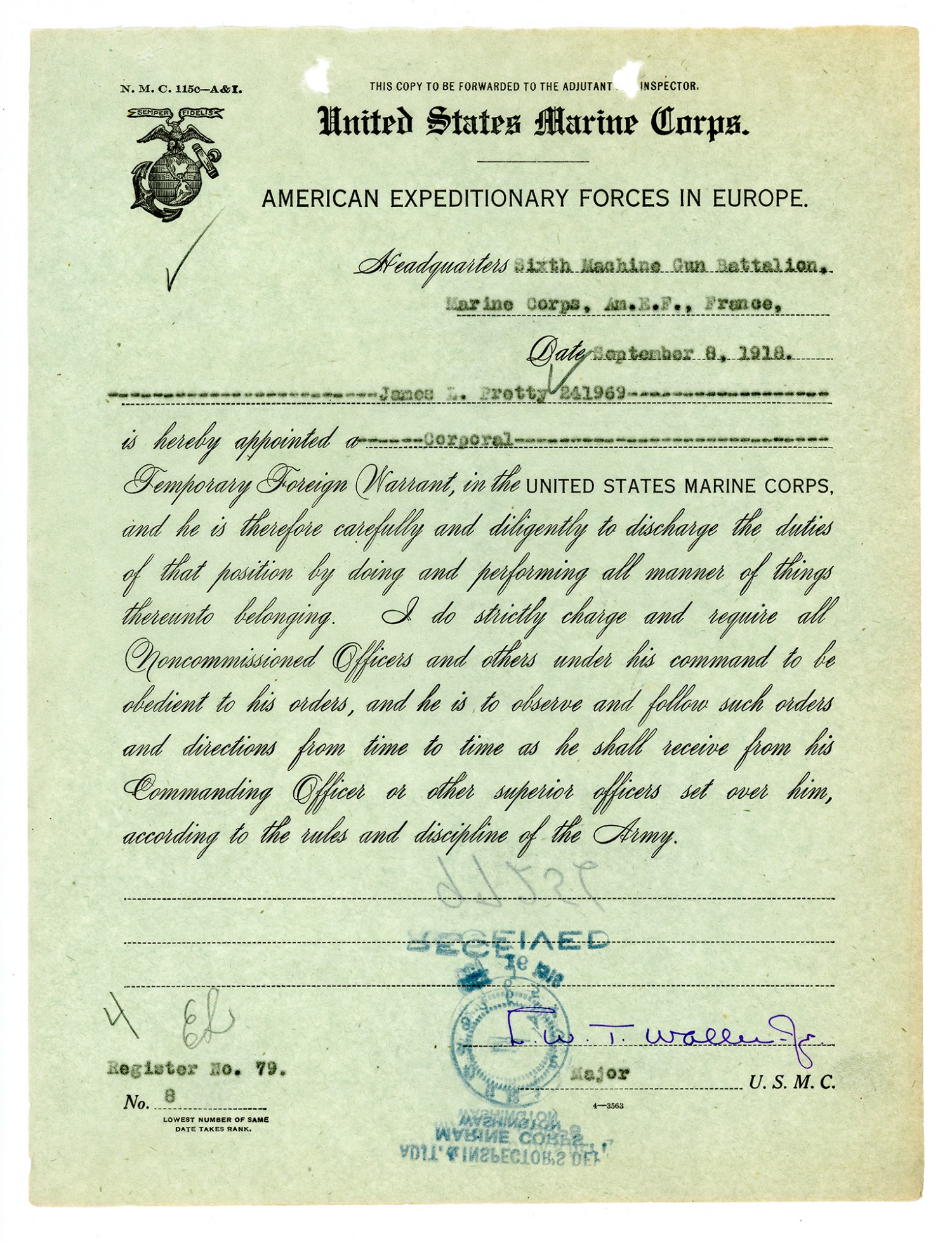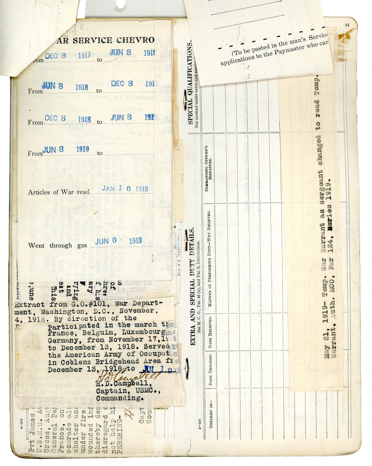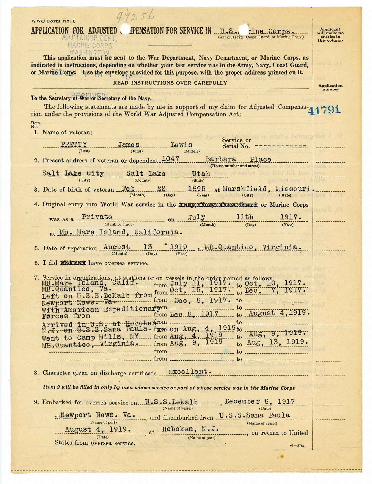| Description | <p>Personnel record files for James L. Pretty containing service records, letters awarding medals of honor, records of payment and transferal requests. James Lewis Pretty was a Private and later Sergeant who served in the 23rd Company, 6th Machine Gun Battalion, 2nd Division of the U.S. Marine Corps, Expeditionary Forces. He was born on June 30, 1917 in Marshfield, Missouri and enlisted to the military on July 11, 1917 at MB, Mare Island, California until August 13, 1919 at MB, Quantico, Virginia. He was awarded the distinguished service cross for his service in the Bois De Belleau or Battle of Belleau Wood near the Marne River in France. </p> |