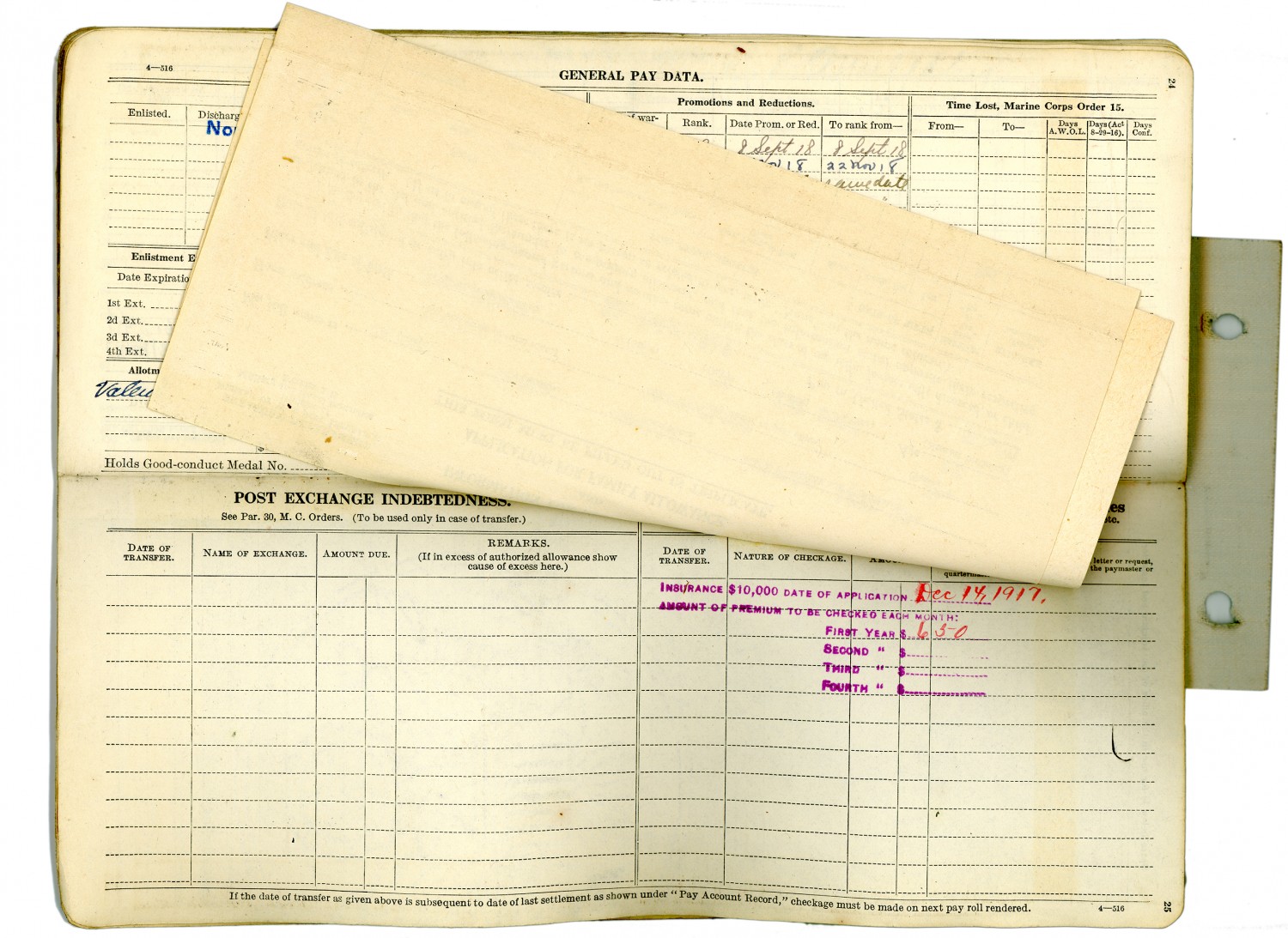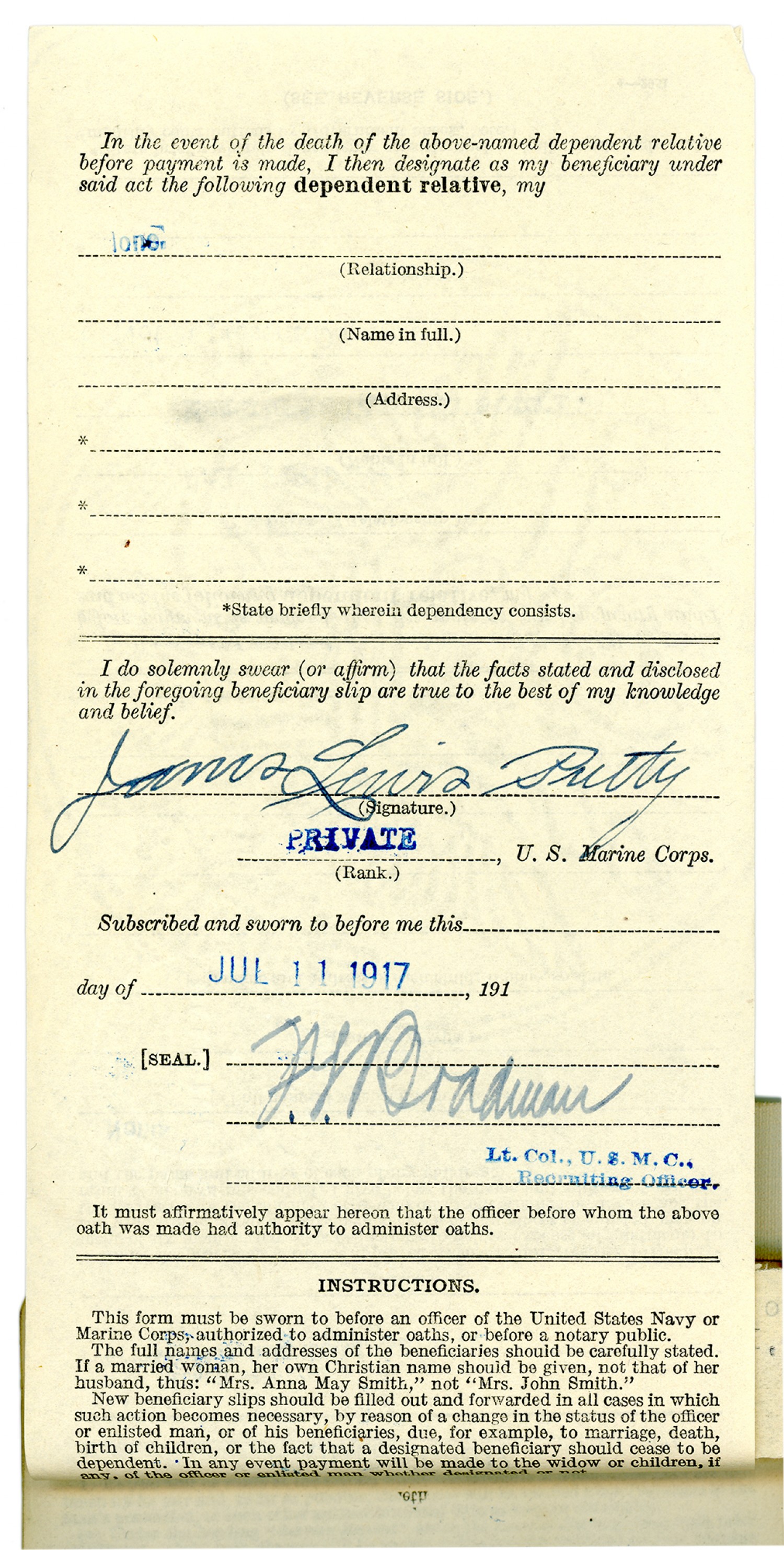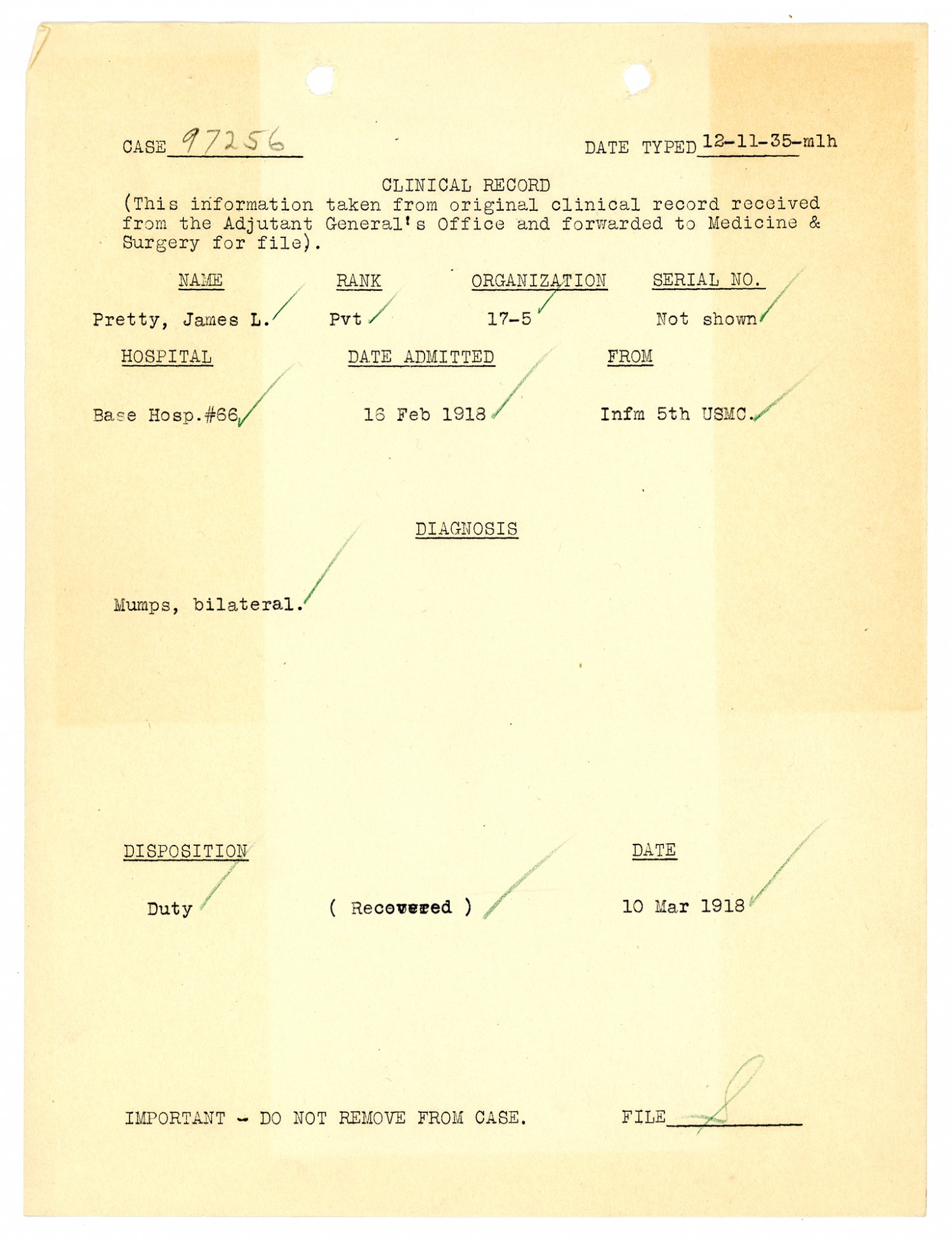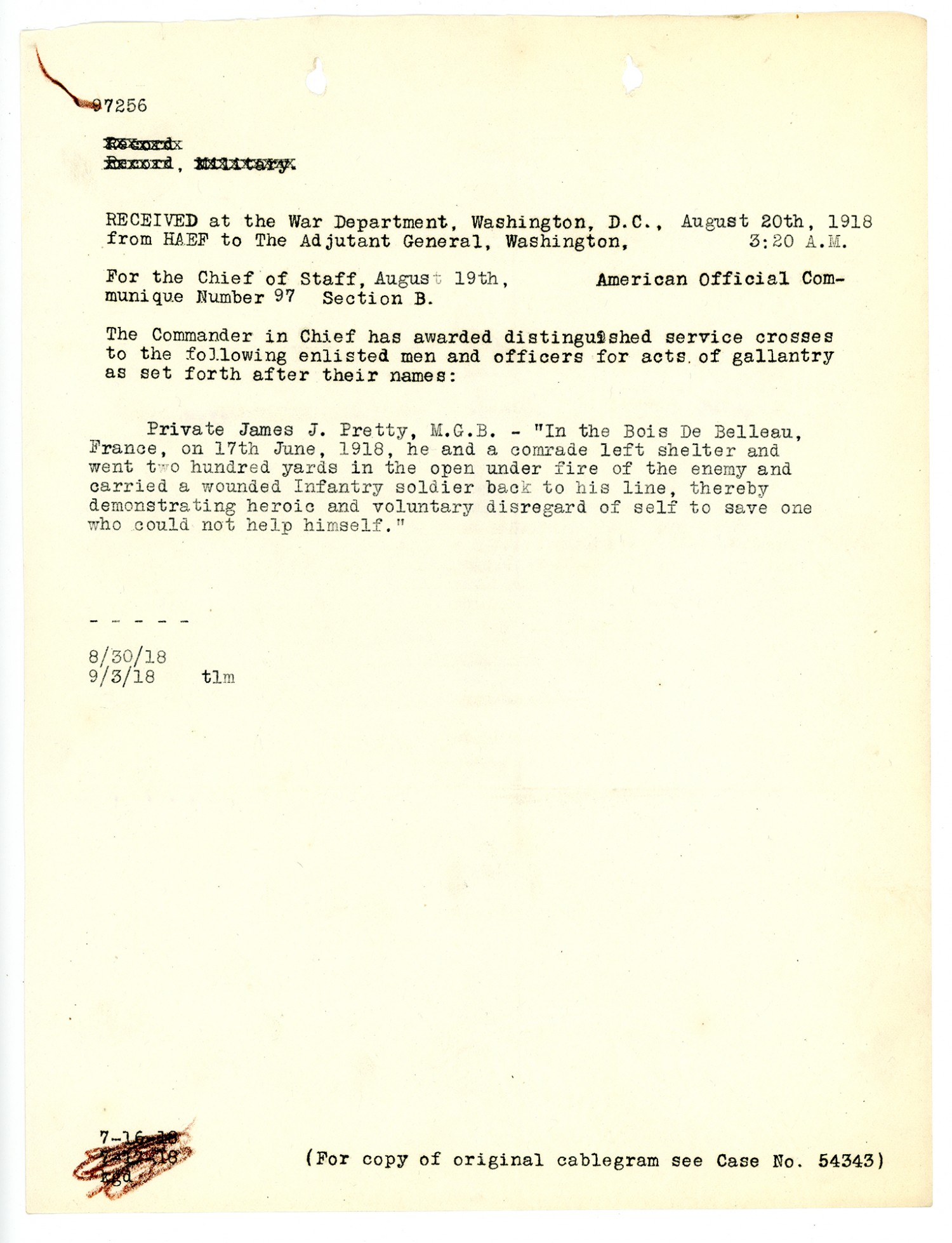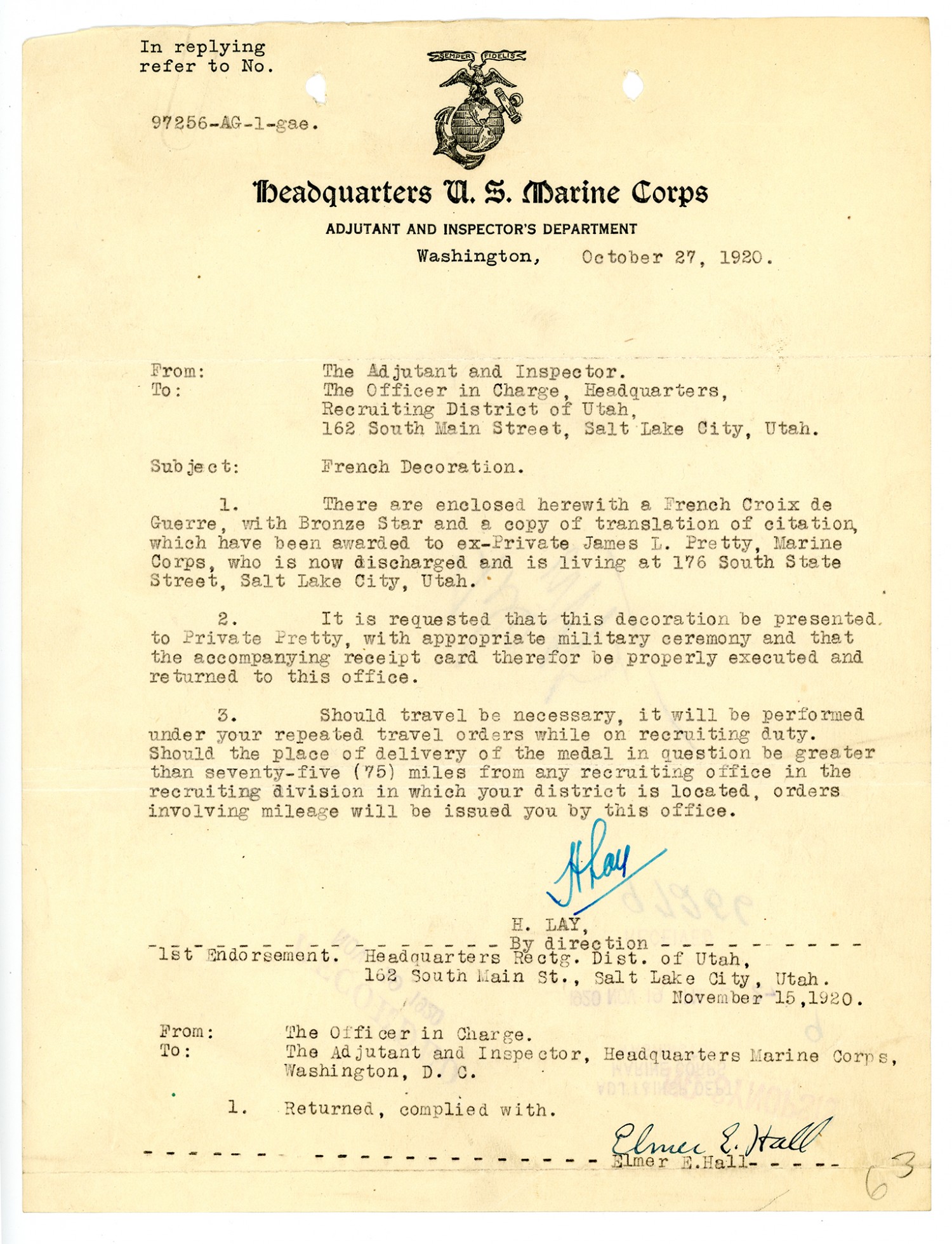 | Description | <p>Personnel record files for James L. Pretty containing service records, letters awarding medals of honor, records of payment and transferal requests. James Lewis Pretty was a Private and later Sergeant who served in the 23rd Company, 6th Machine Gun Battalion, 2nd Division of the U.S. Marine Corps, Expeditionary Forces. He was born on June 30, 1917 in Marshfield, Missouri and enlisted to the military on July 11, 1917 at MB, Mare Island, California until August 13, 1919 at MB, Quantico, Virginia. He was awarded the distinguished service cross for his service in the Bois De Belleau or Battle of Belleau Wood near the Marne River in France. </p> |