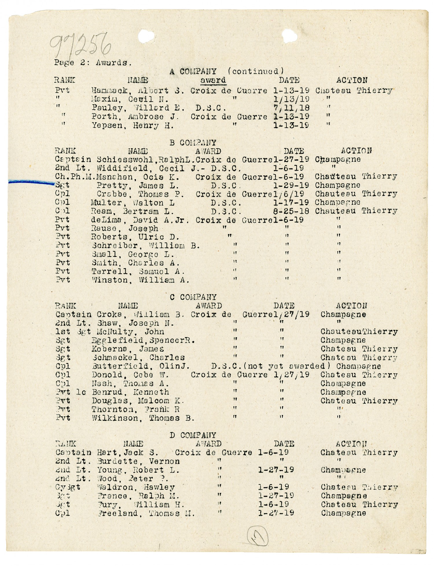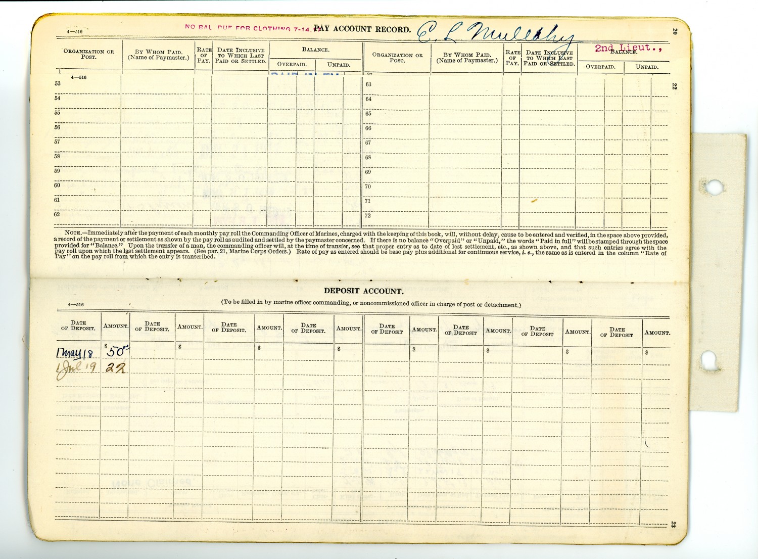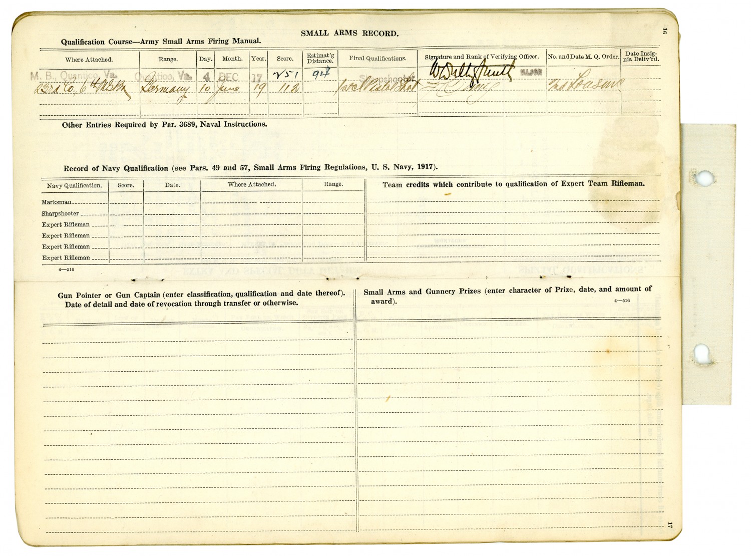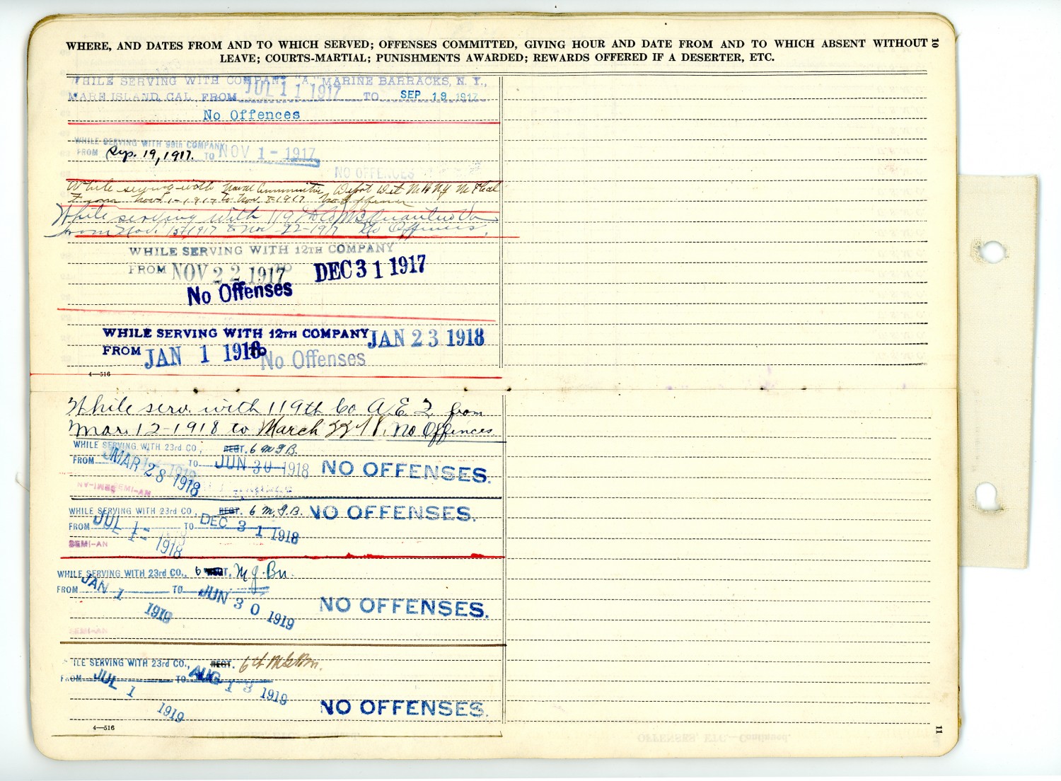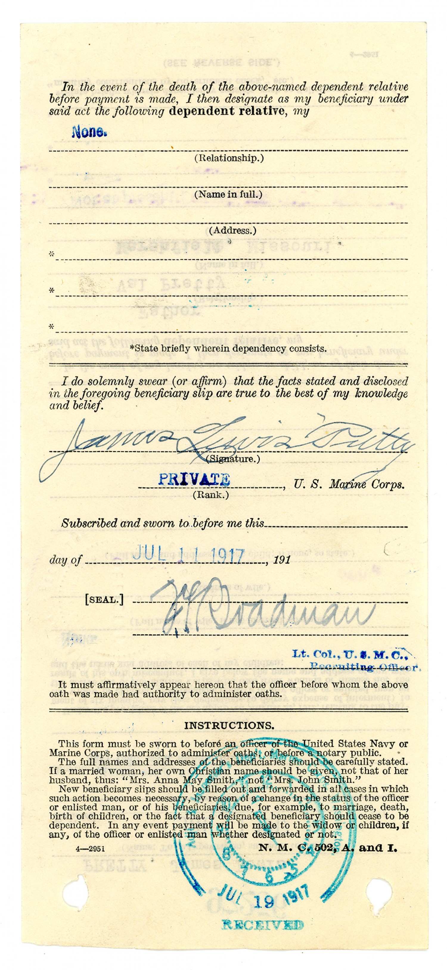 | Description | <p>Personnel record files for James L. Pretty containing service records, letters awarding medals of honor, records of payment and transferal requests. James Lewis Pretty was a Private and later Sergeant who served in the 23rd Company, 6th Machine Gun Battalion, 2nd Division of the U.S. Marine Corps, Expeditionary Forces. He was born on June 30, 1917 in Marshfield, Missouri and enlisted to the military on July 11, 1917 at MB, Mare Island, California until August 13, 1919 at MB, Quantico, Virginia. He was awarded the distinguished service cross for his service in the Bois De Belleau or Battle of Belleau Wood near the Marne River in France. </p> |