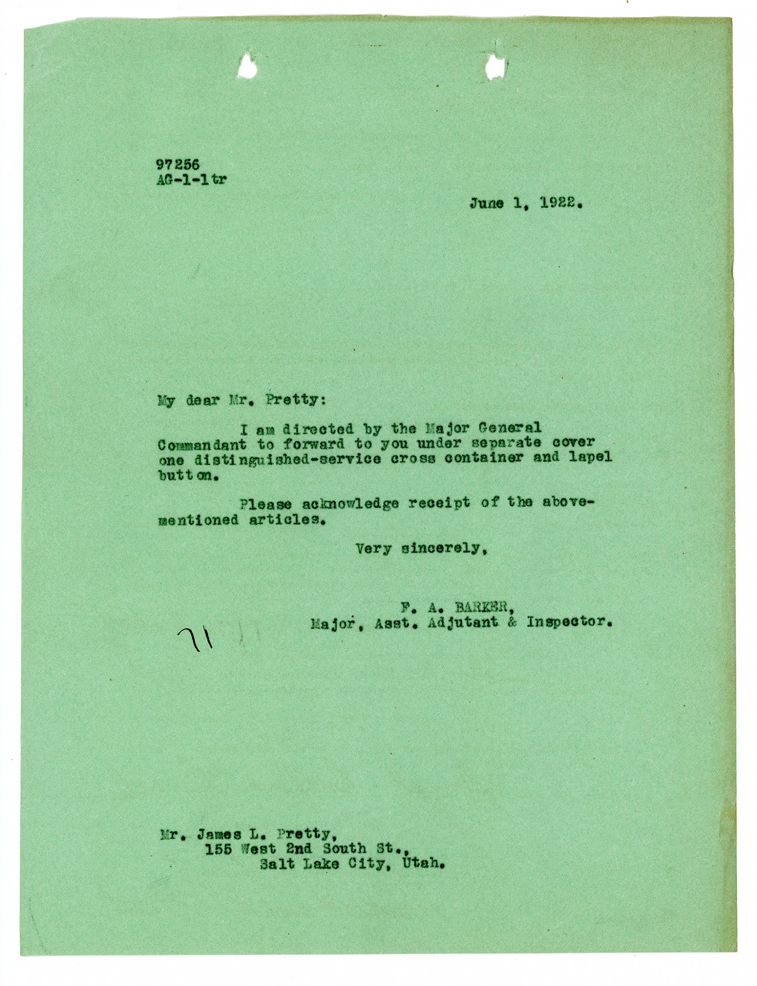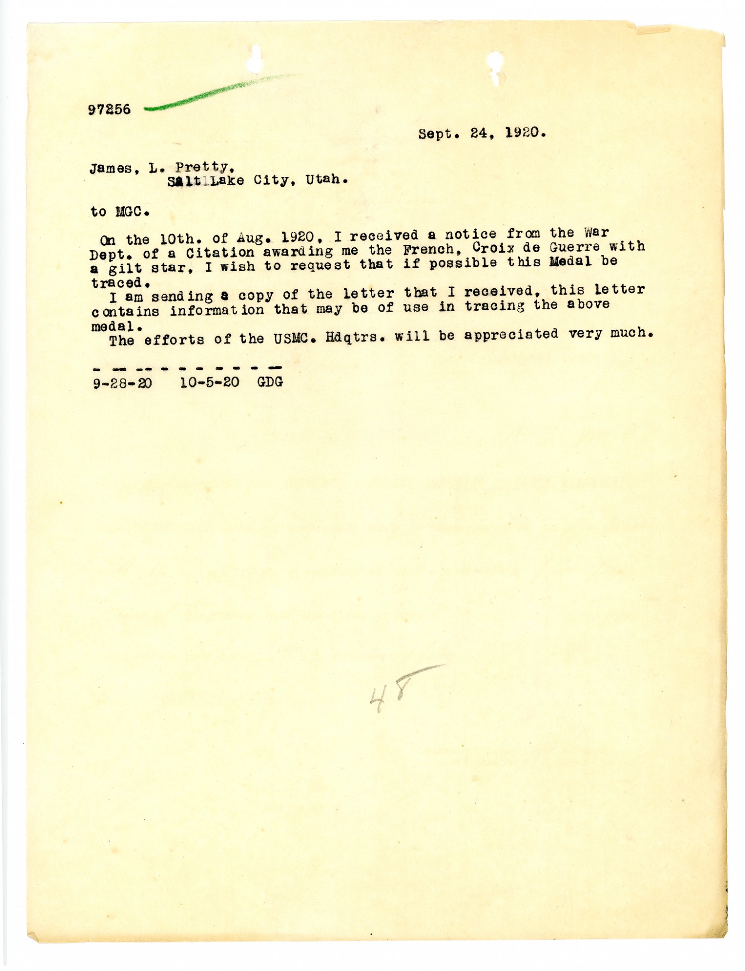 James L. Pretty letter to the Machine Gun Corps - September 24, 1920