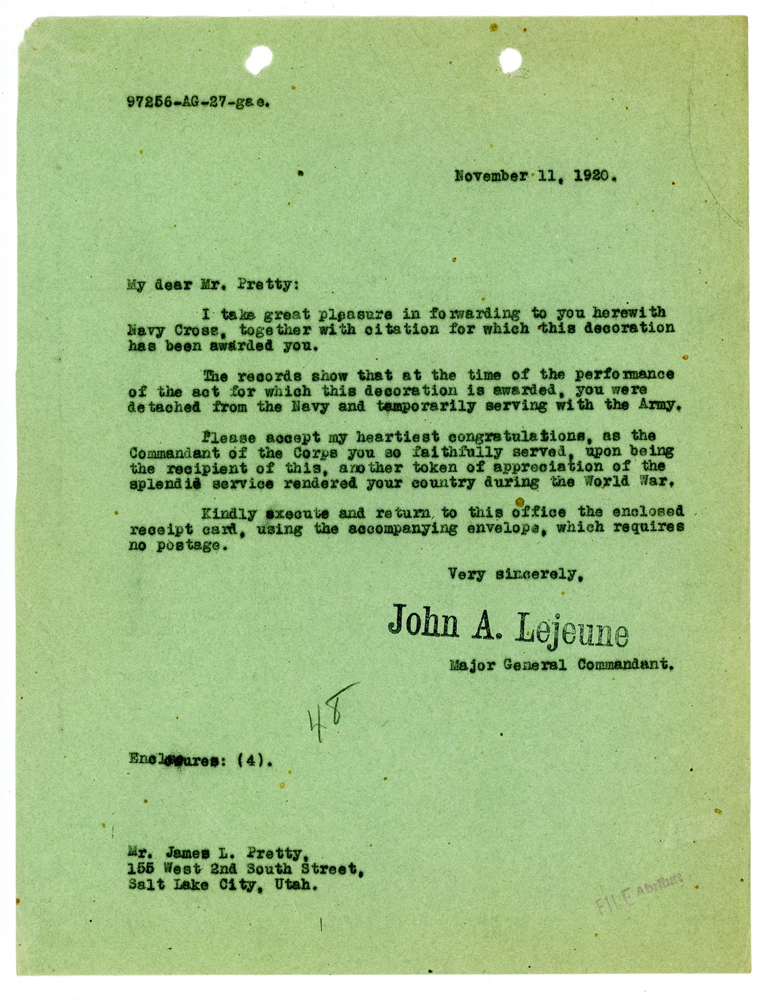 John A. Lejeune letter to James L. Pretty - November 11, 1920