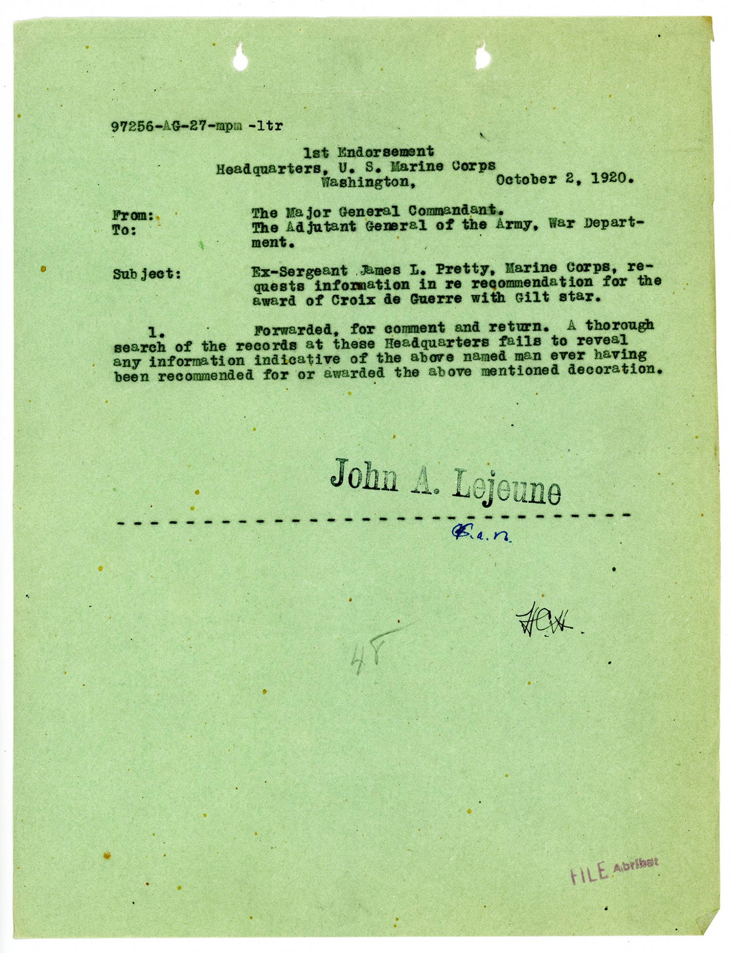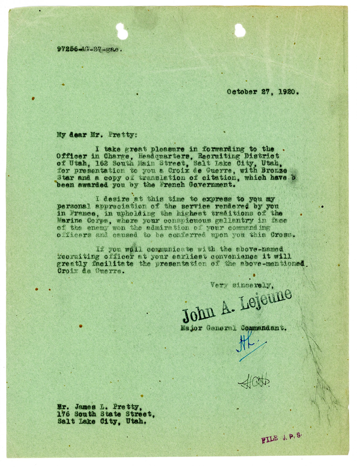 John A. Lejeune letter to James L. Pretty - October 27, 1920