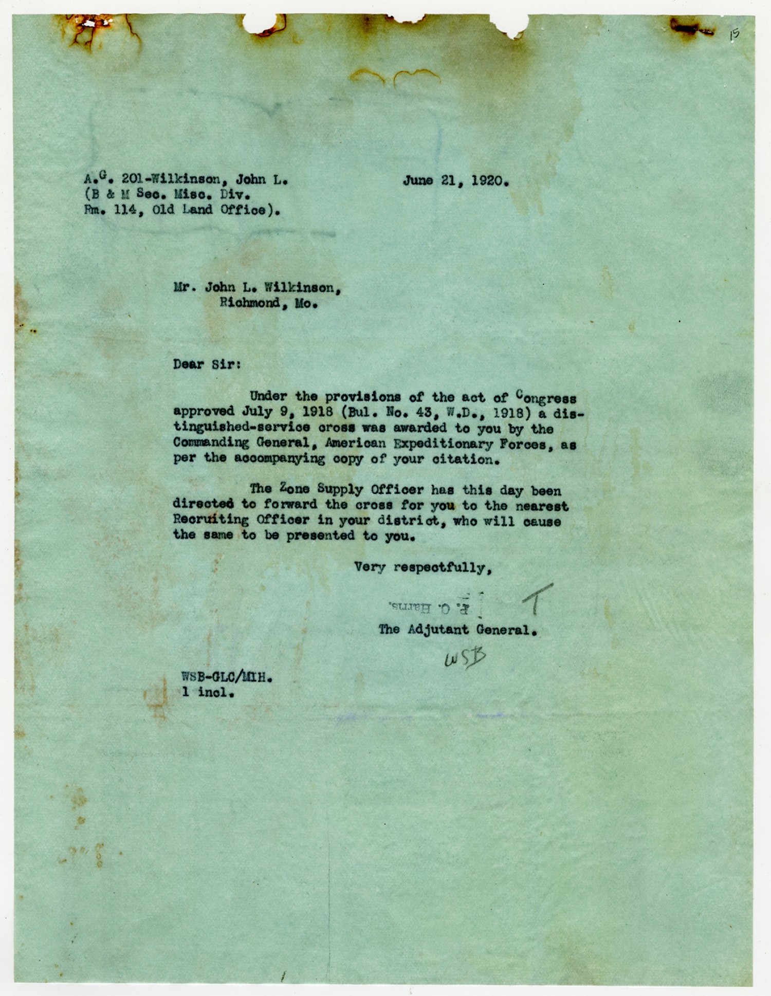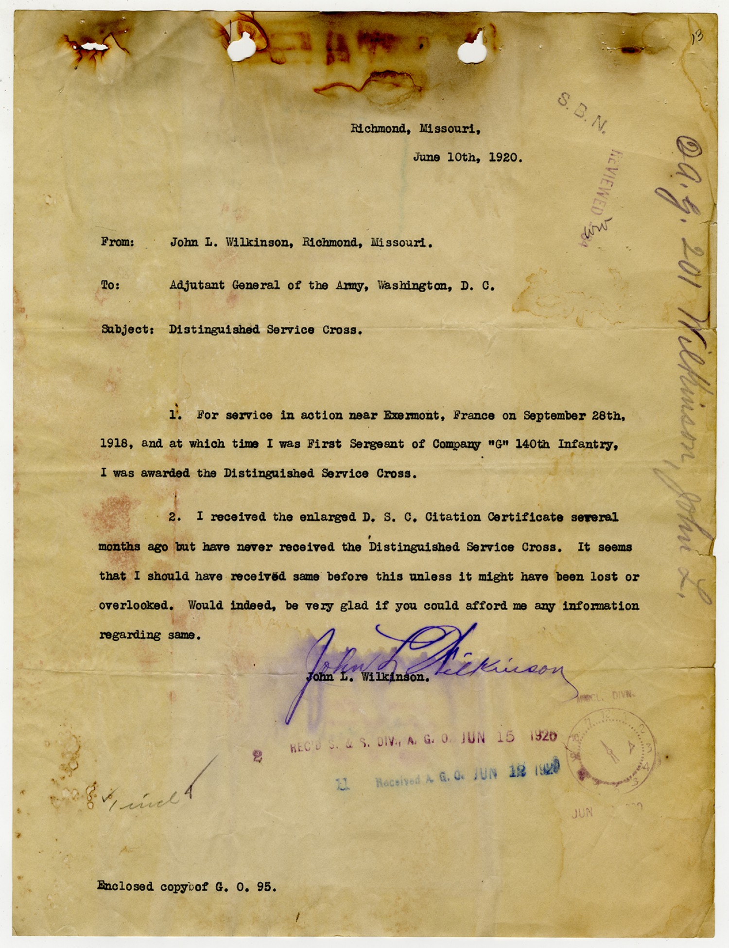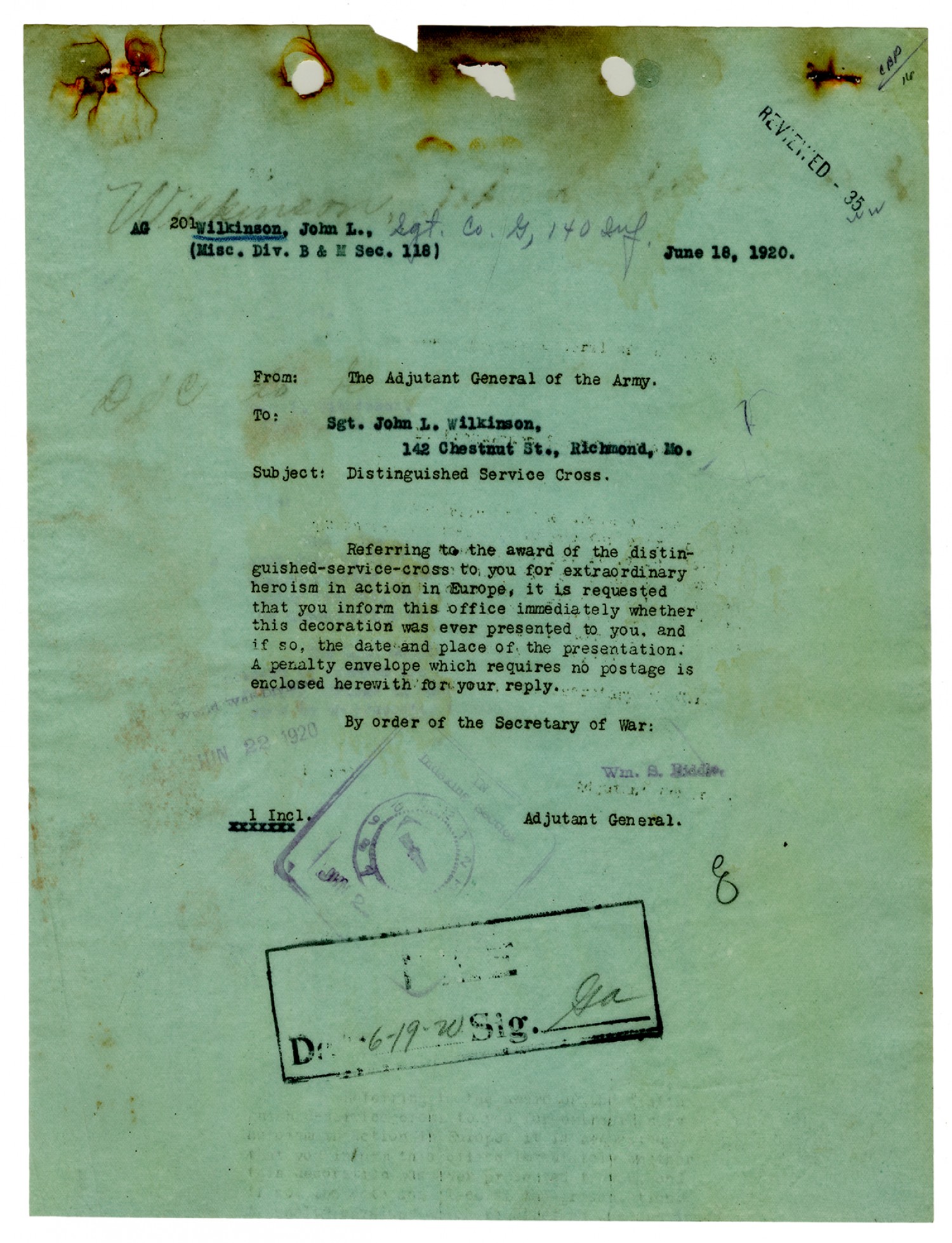 John L. Wilkinson letter to the Adjutant General of the Army - June 10, 1920