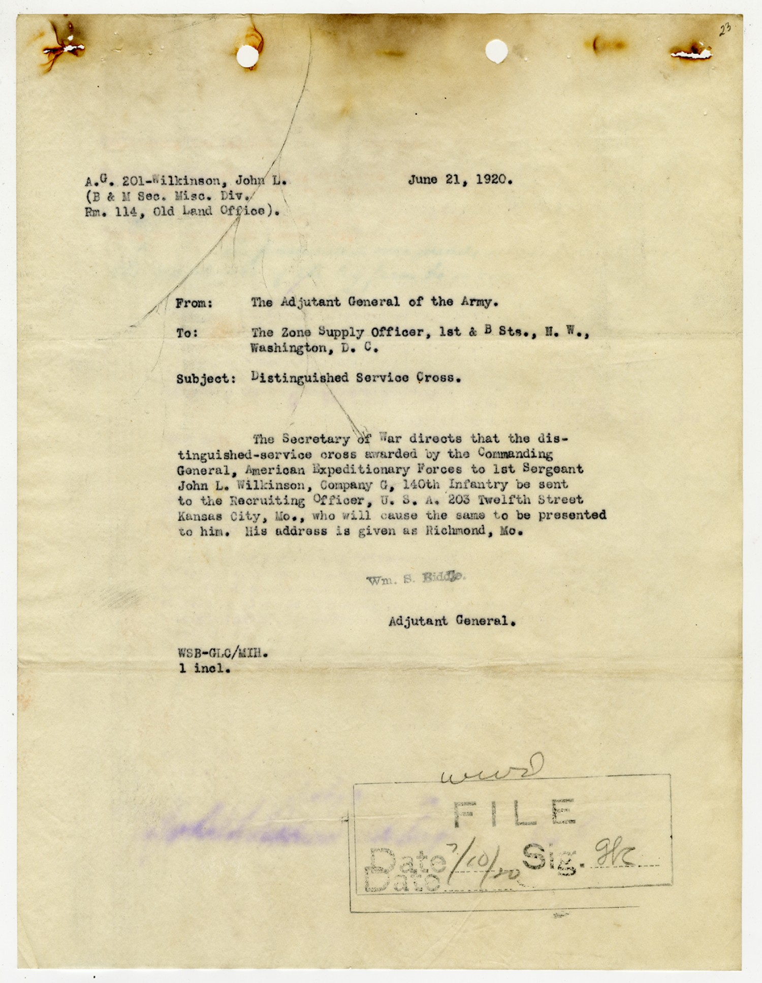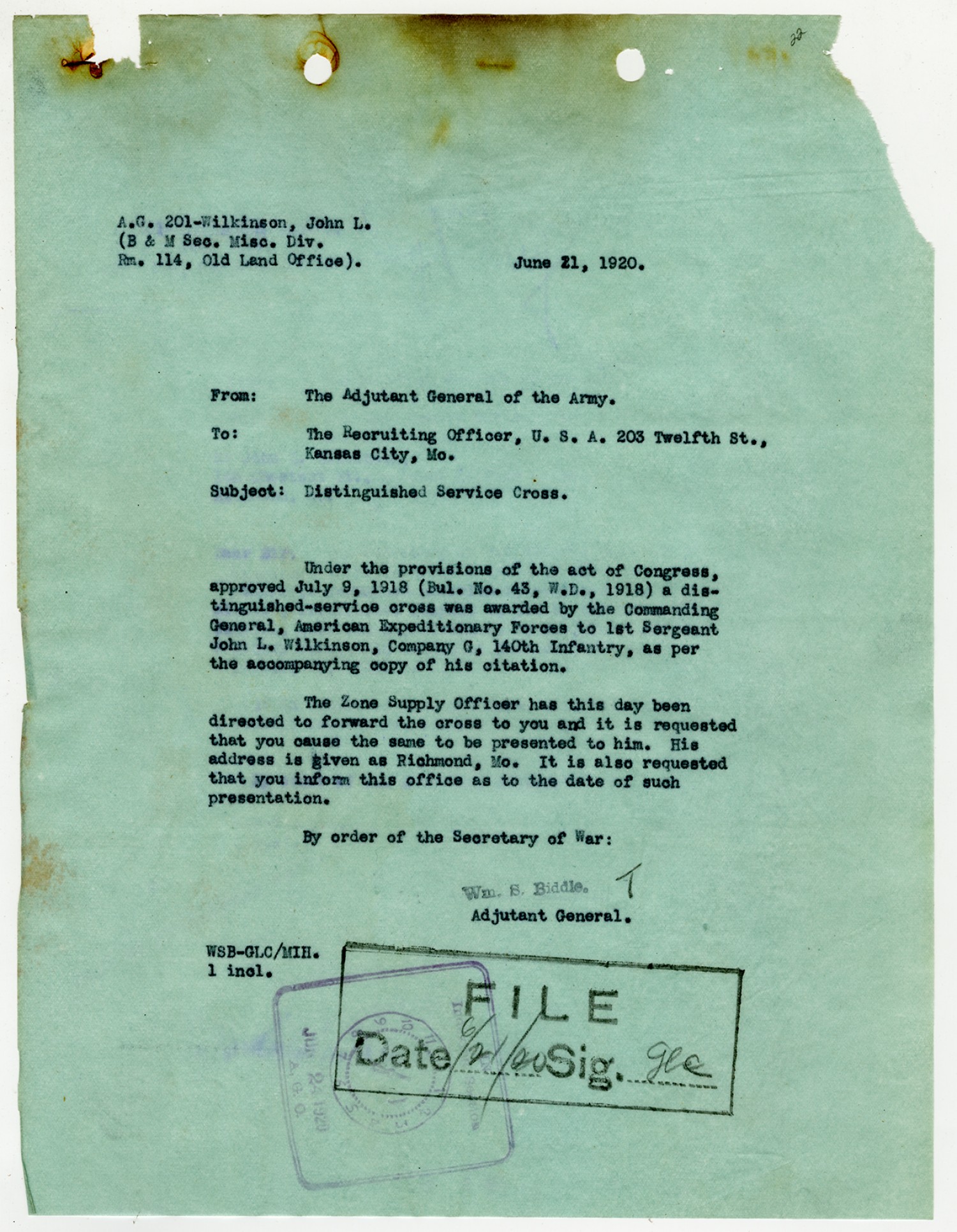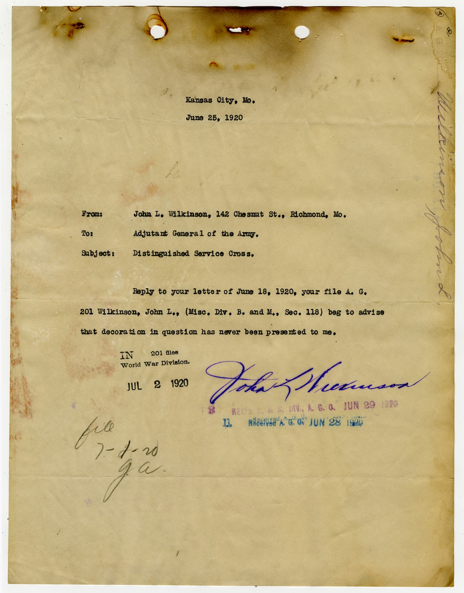 John L. Wilkinson letter to the Adjutant General of the Army - June 25, 1920