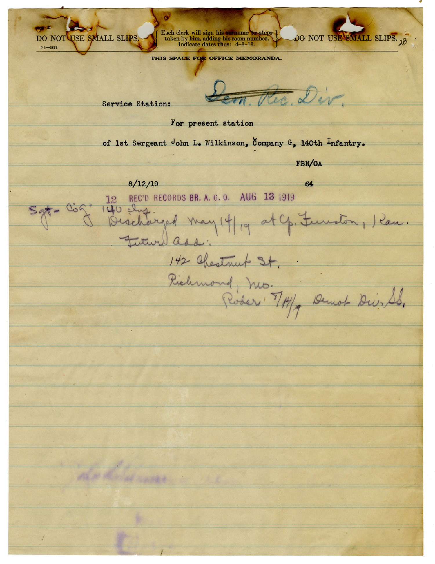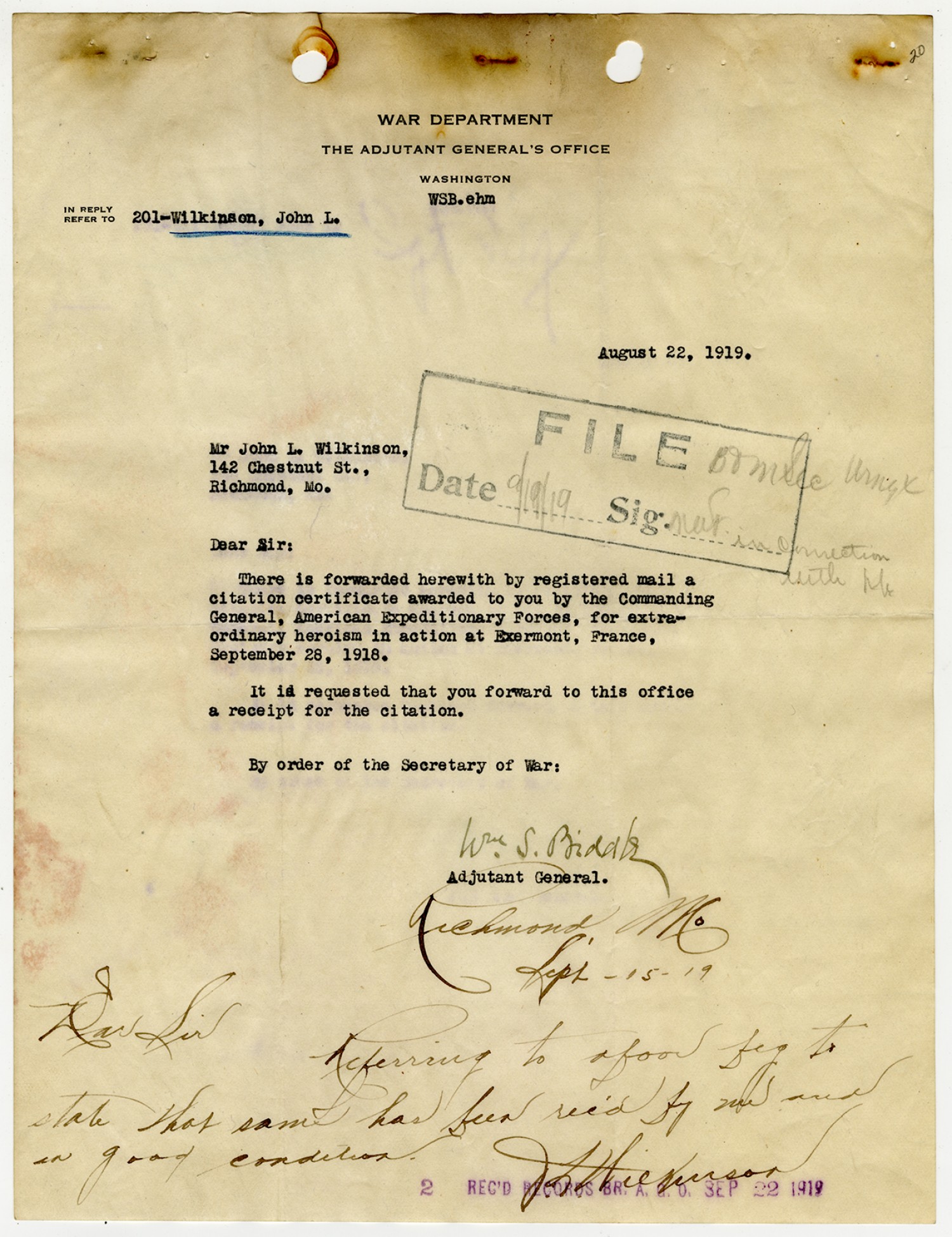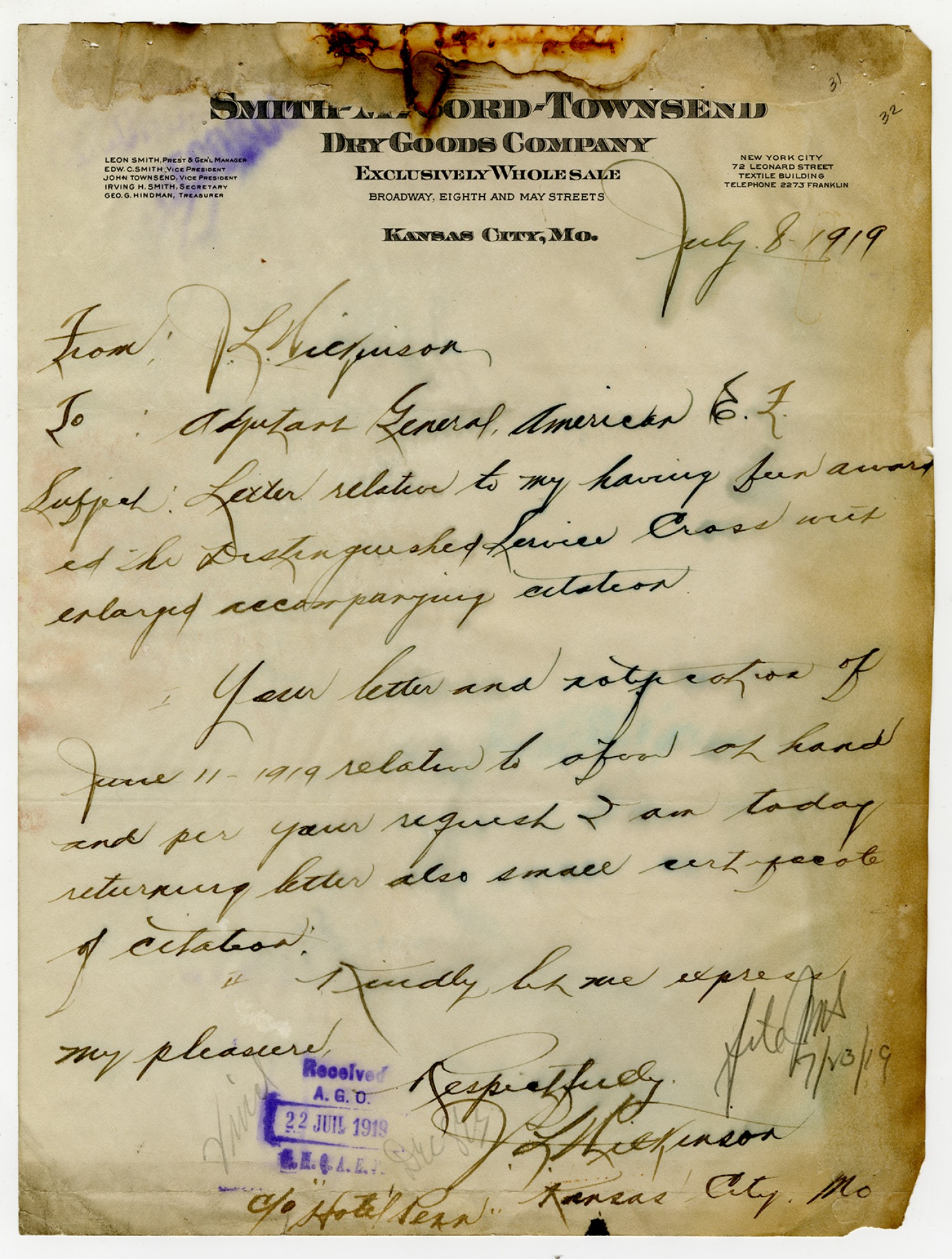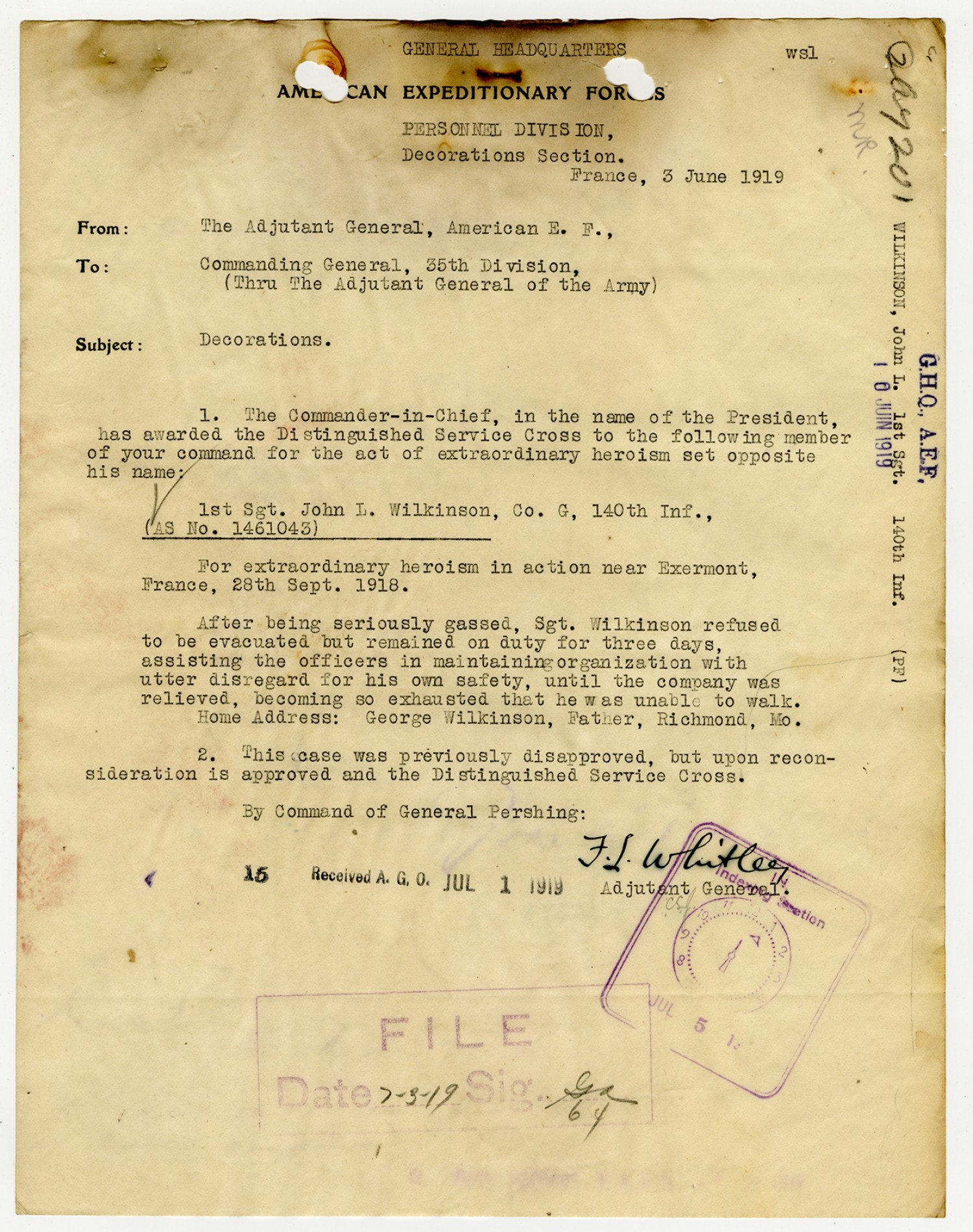 John L. Wilkinson letter to the Adjutant General - July 8, 1919