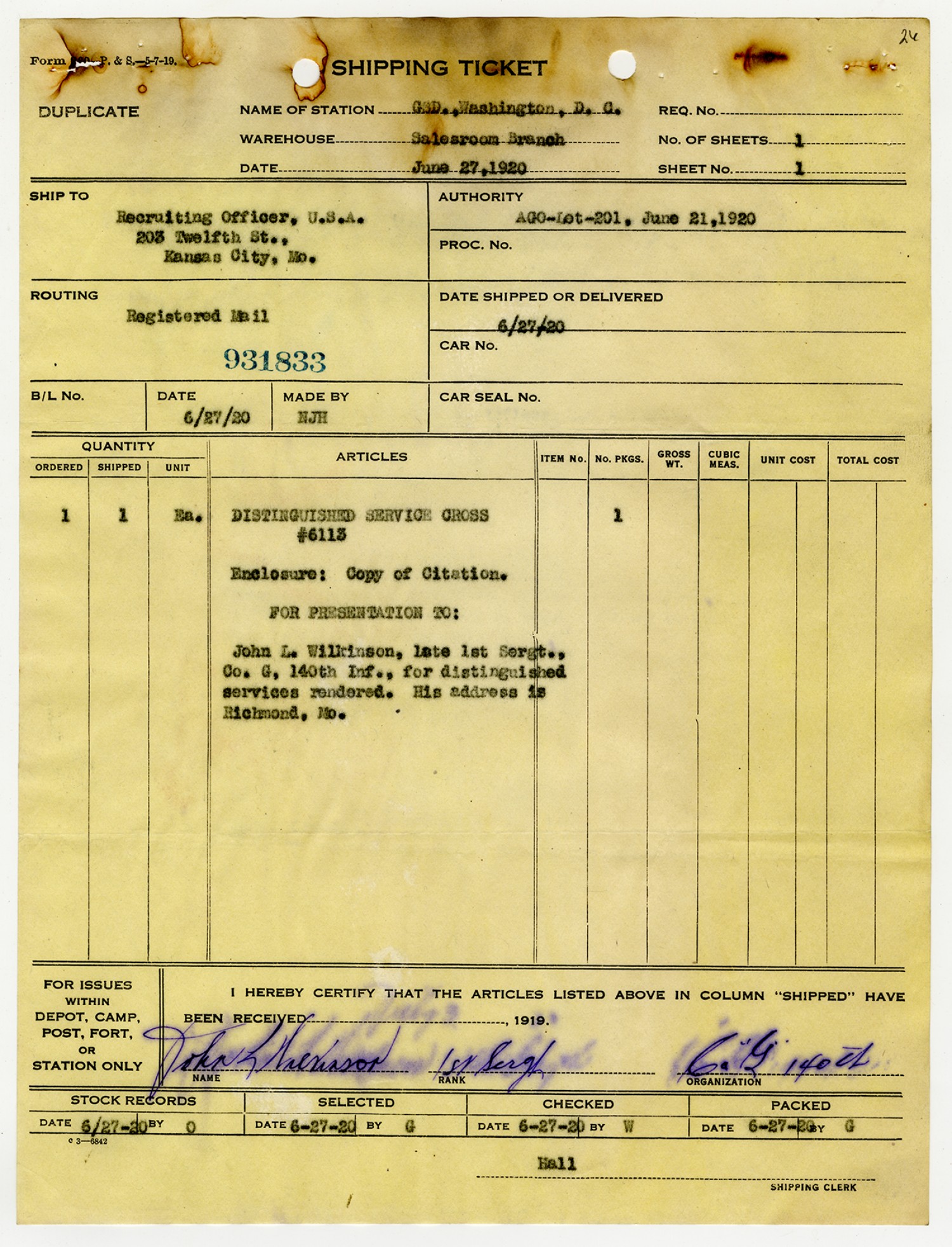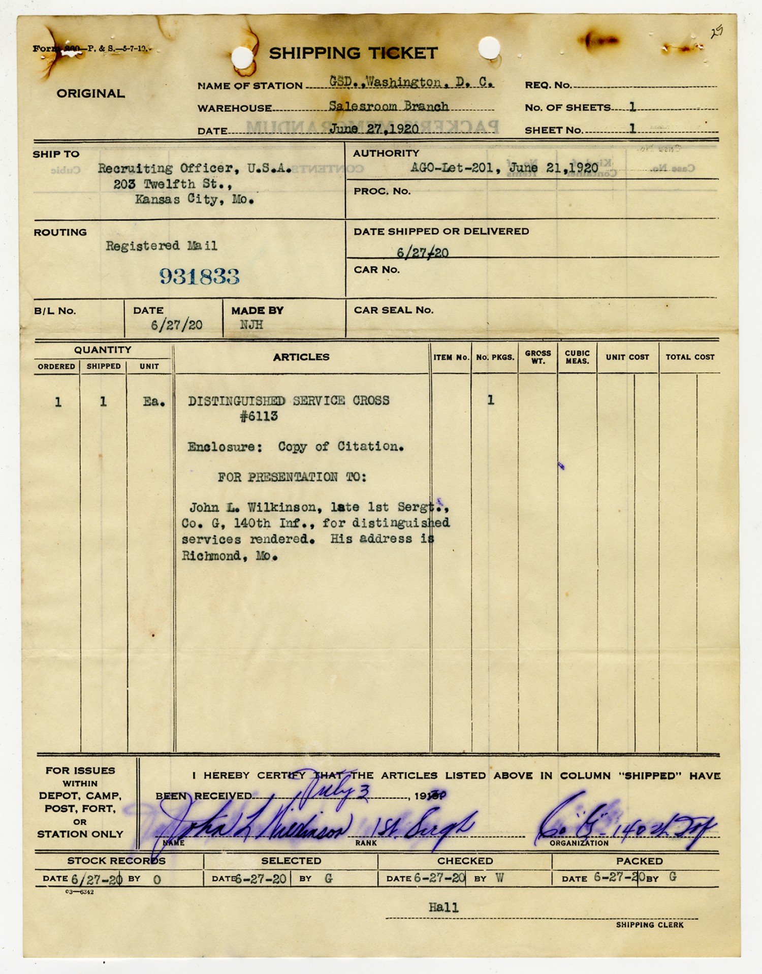 Distinguished Service Cross Shipping Ticket - July 3, 1920