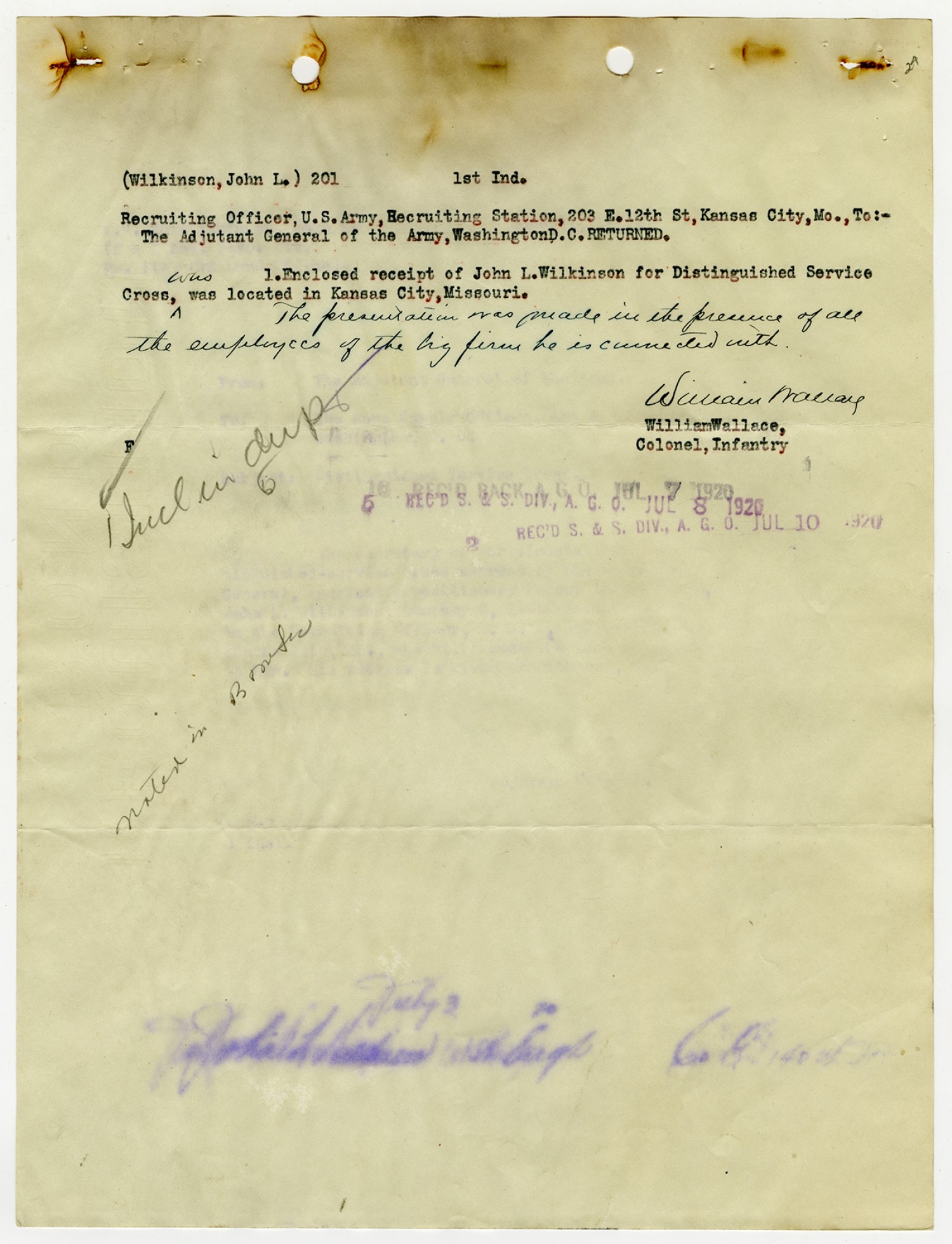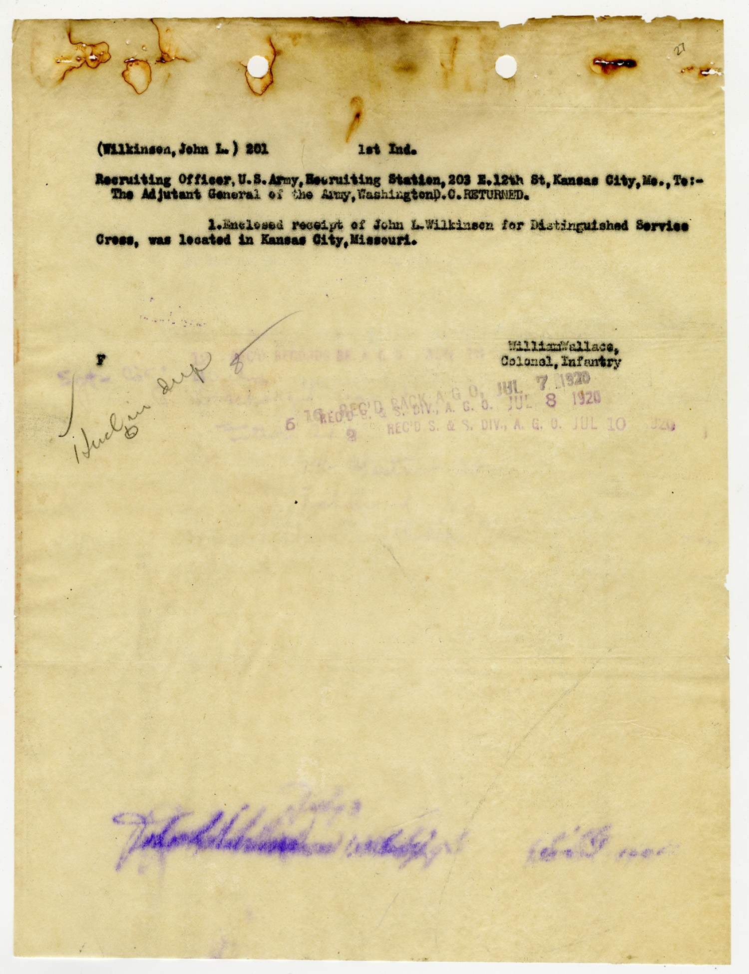 William Wallace 1st Indorsement for John Wilkinson - July 8, 1920