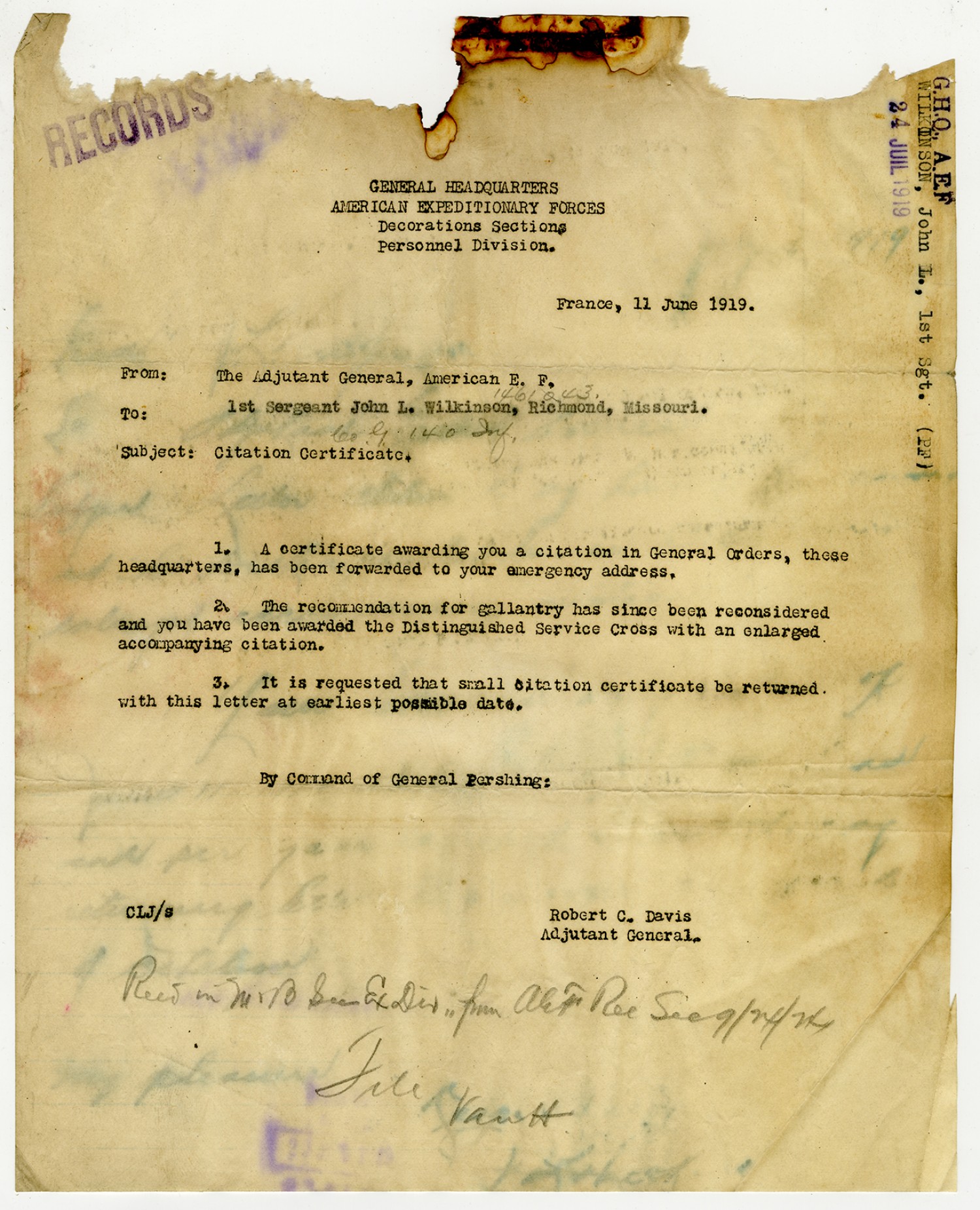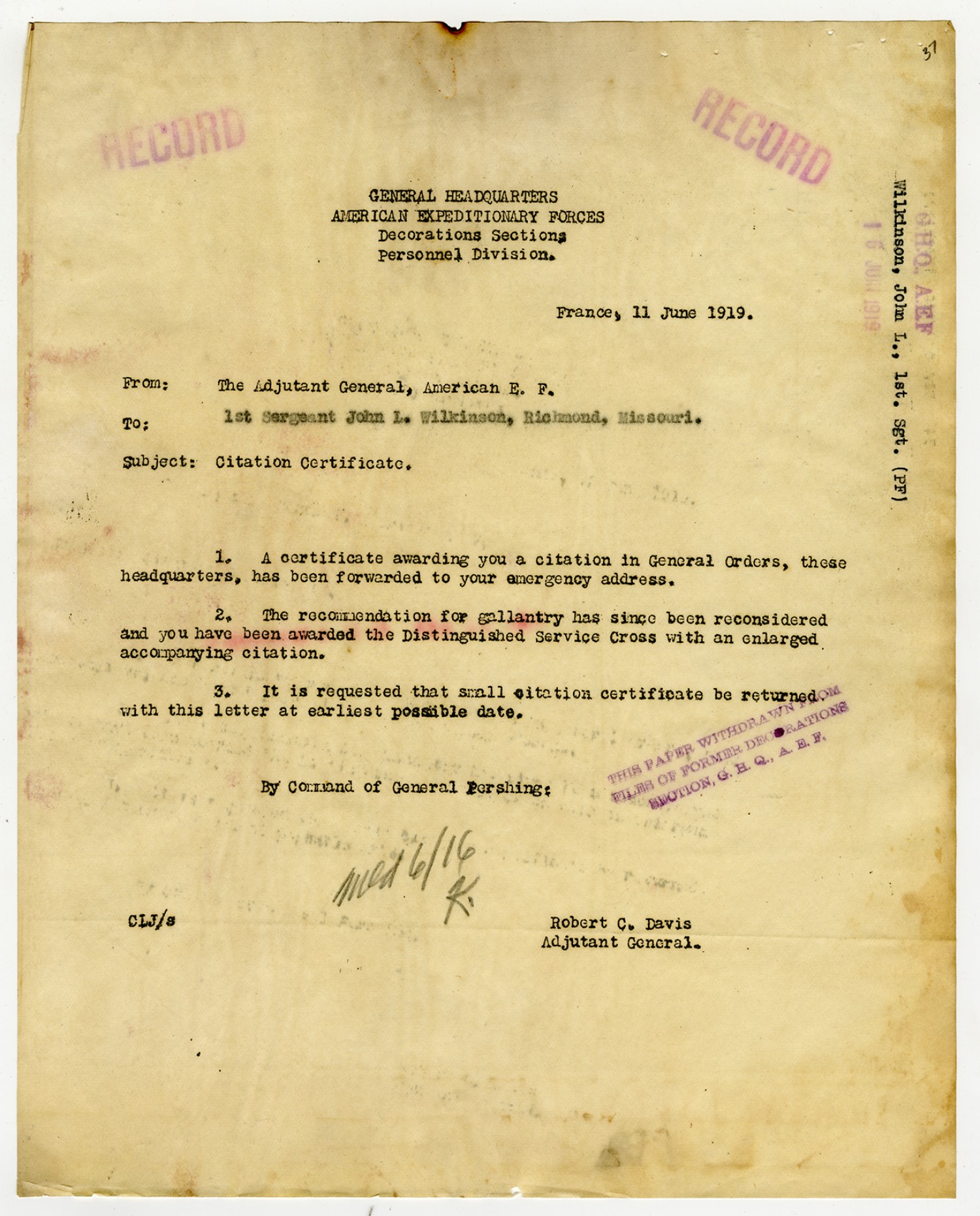 Robert C. Davis letter to the Adjutant General - June 11, 1919