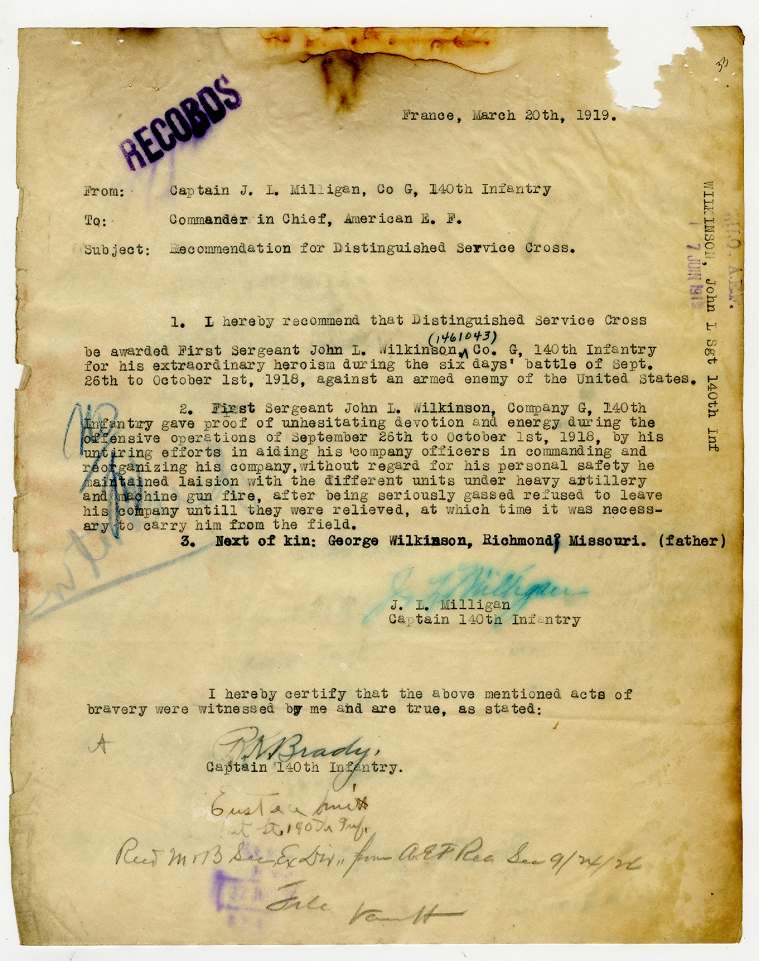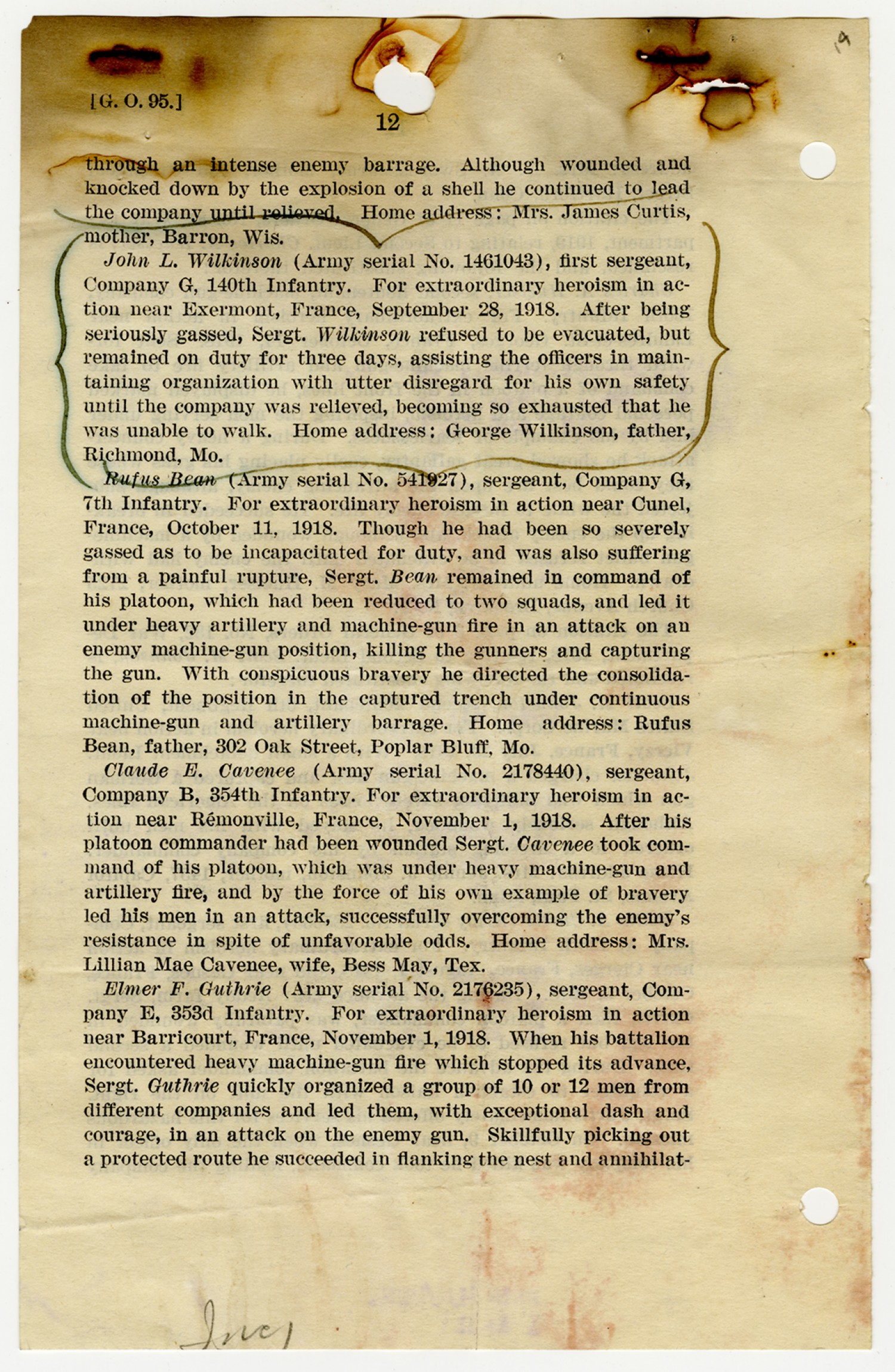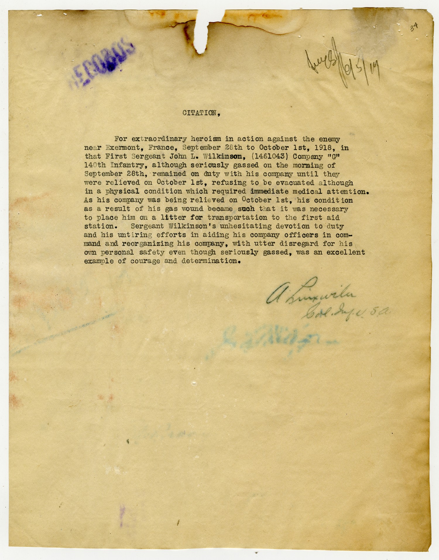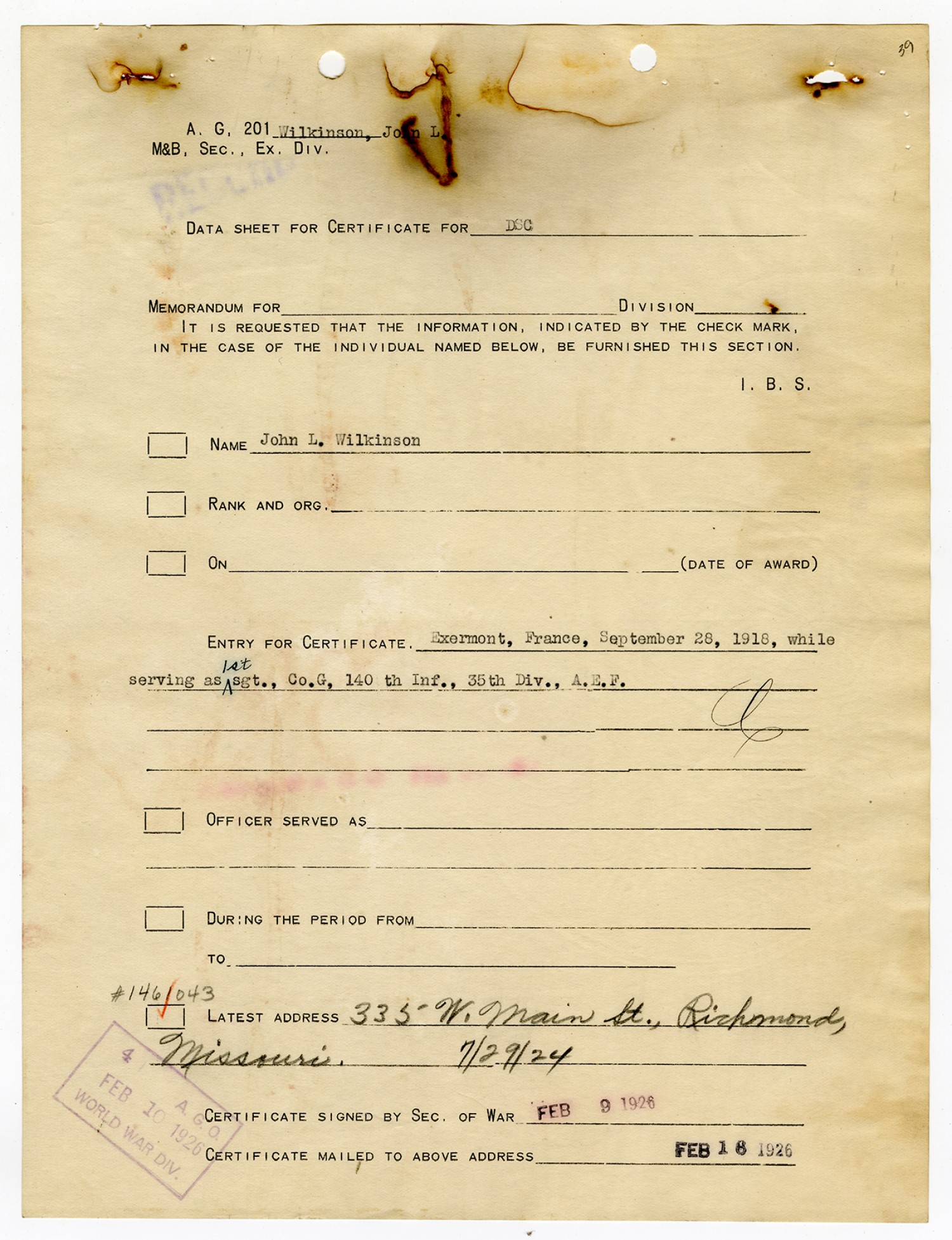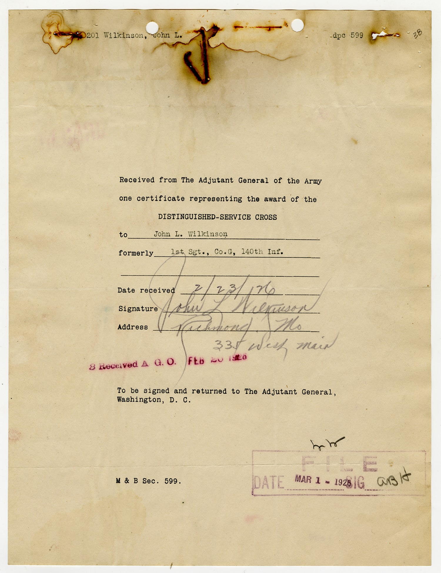 | Description | <p>Personnel record files for John L. Wilkinson containing letters and correspondence concerning his Distinguished Service Cross award. Wilkinson served as sergeant with Company G, 140th Infantry. He received the Distinguished Service Cross for heroism after being gassed near Exermont, France on September 28, 1918.</p> |
