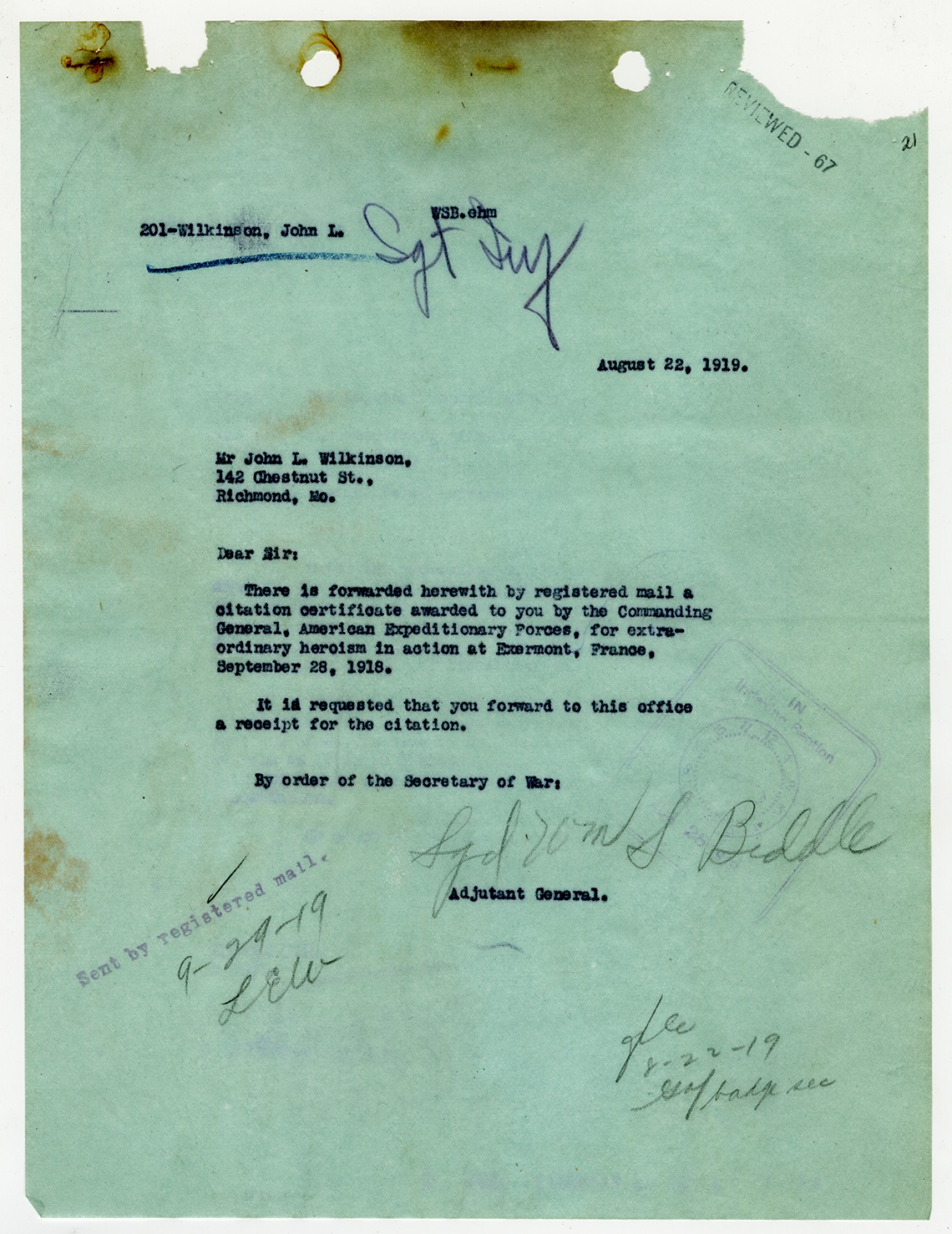 William S. Biddle letter to Sergeant John L. Wilkinson - August 22, 1919