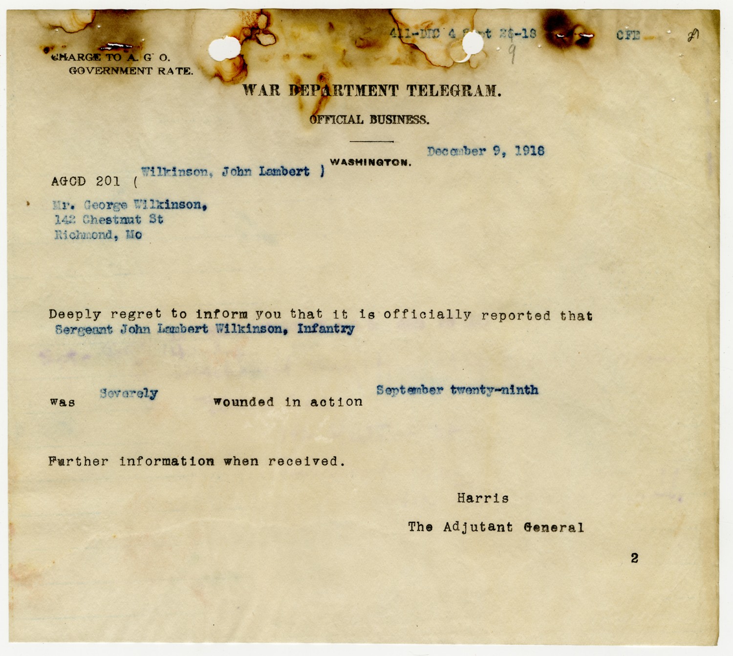 Telegram to George Wilkinson from Harris- December 9, 1918