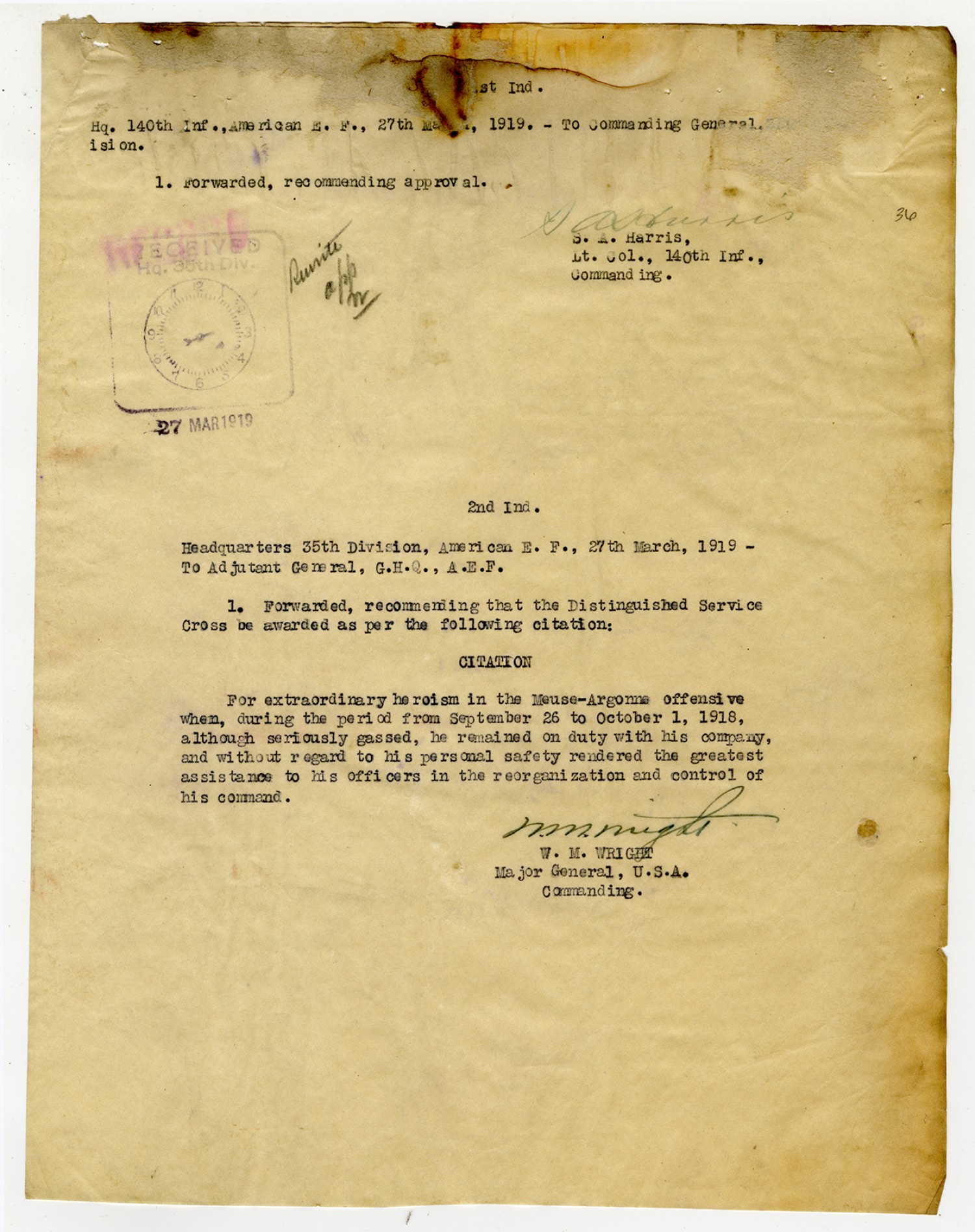 W.M. Wright 2nd Indorsement for John L. Wilkinson - March 27, 1919