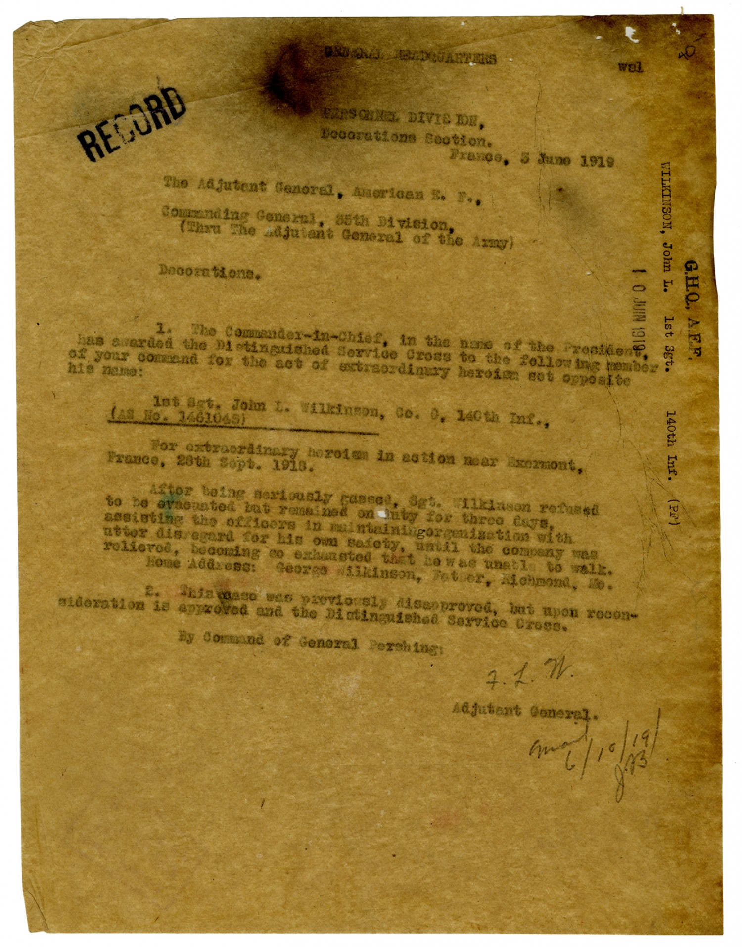 Adjutant General letter to Commanding General - June 3, 1919