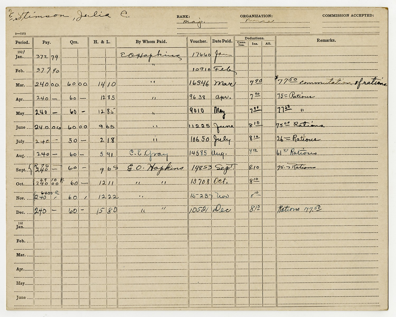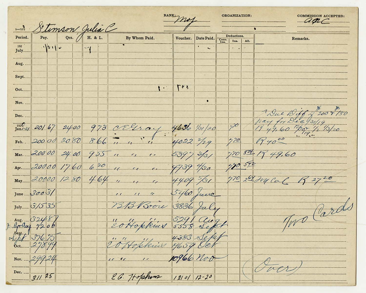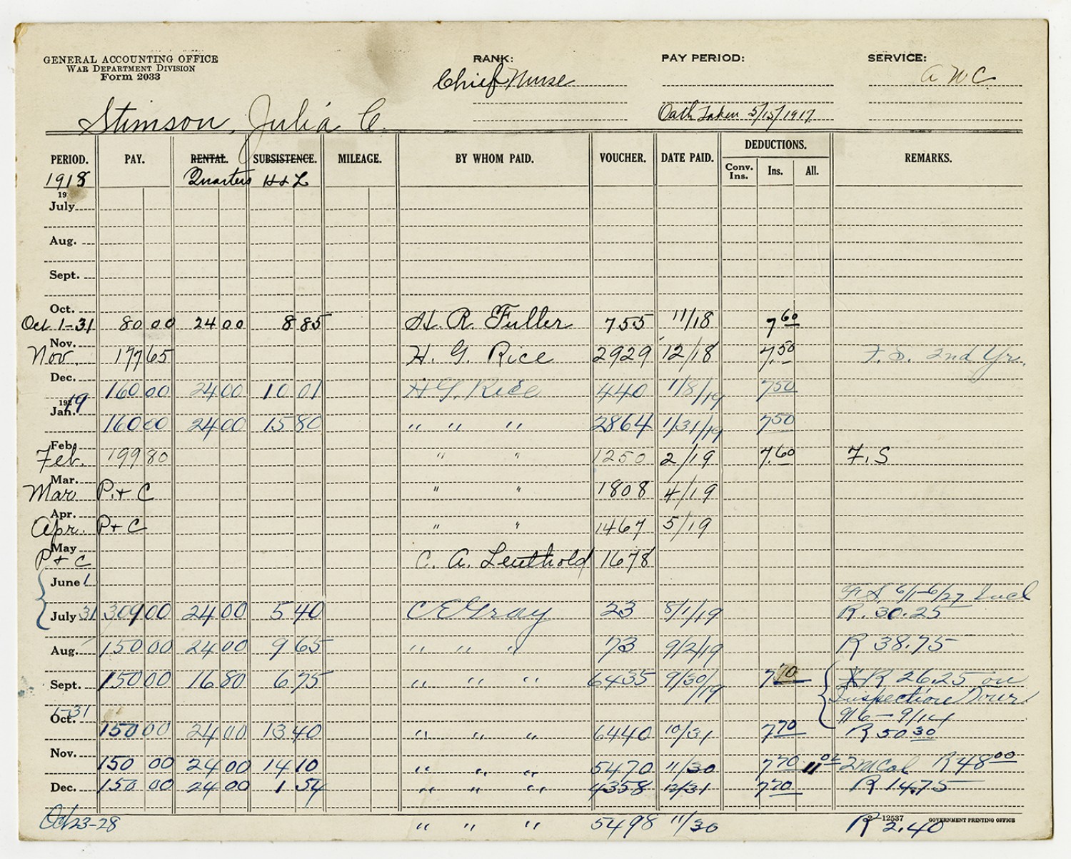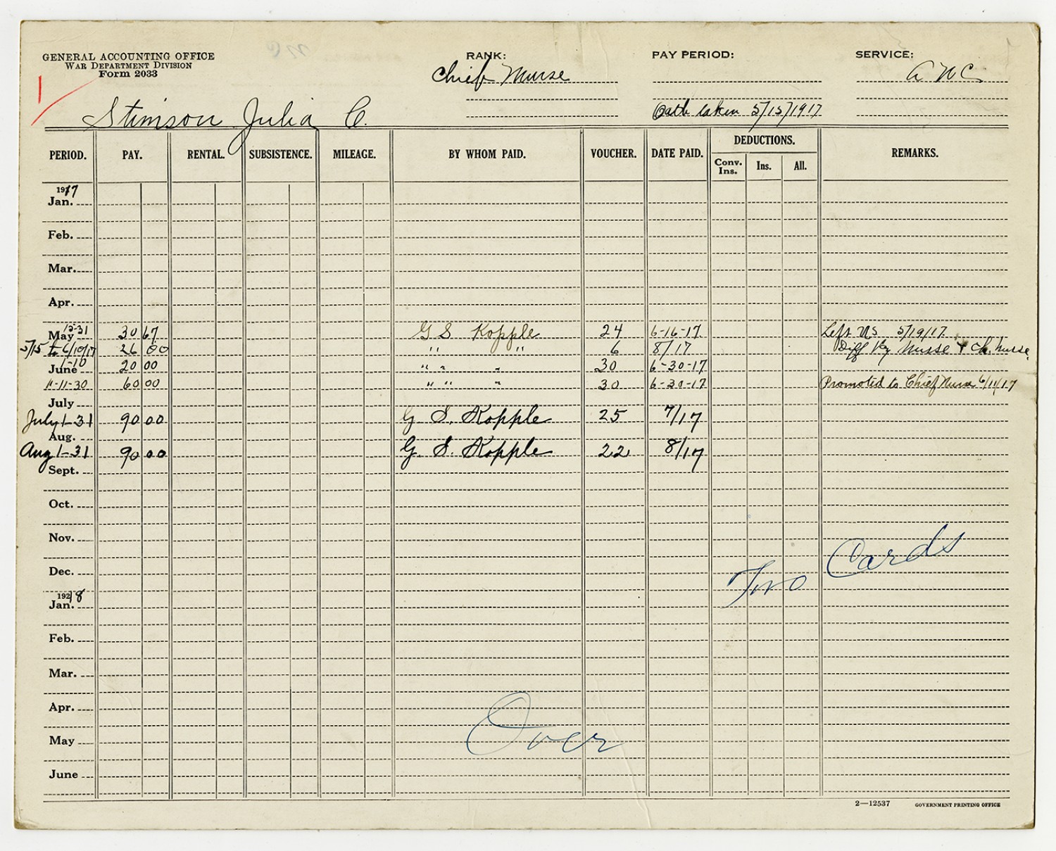 | Source | Stimson, Julia; Pay cards of the enlisted, 12/31/1917-12/31/1921; National Archives and Records Administration-National Personnel Records Center (St. Louis). |