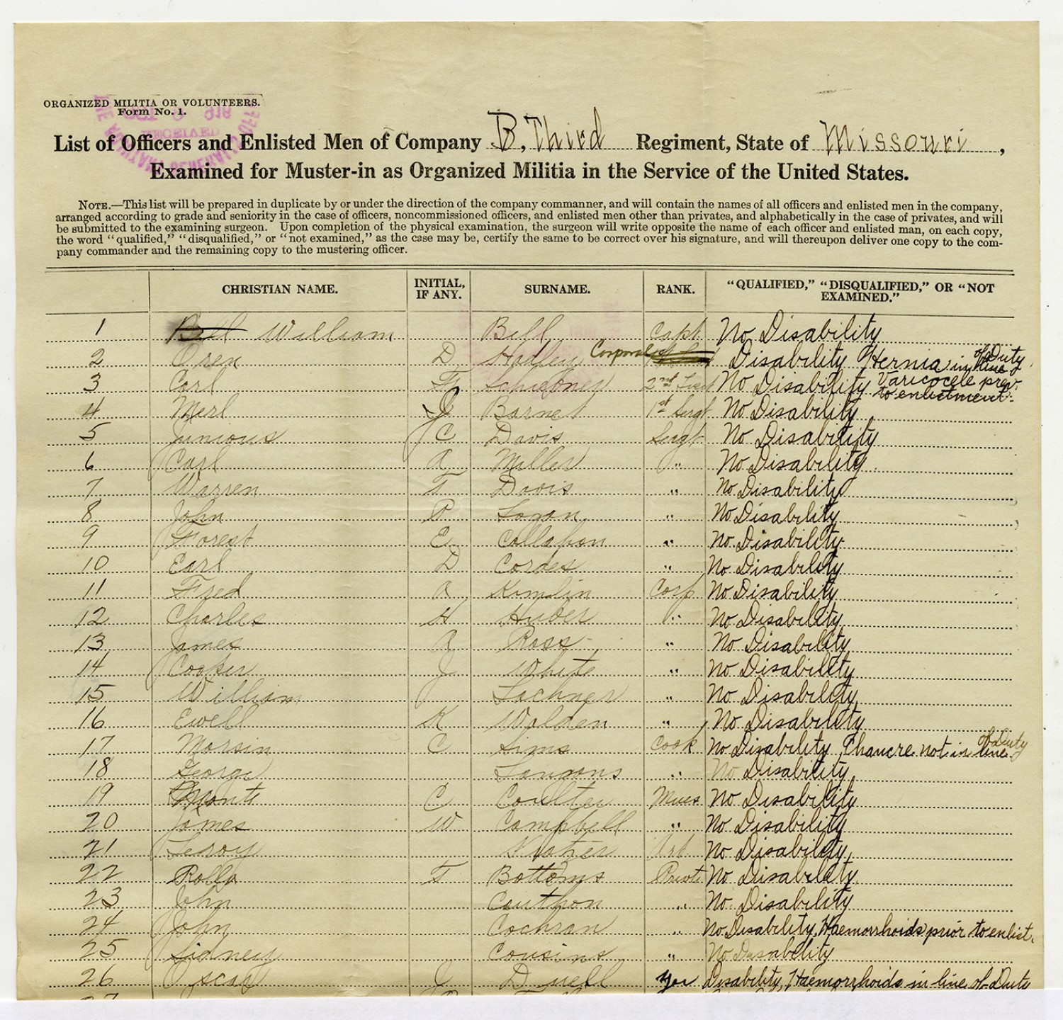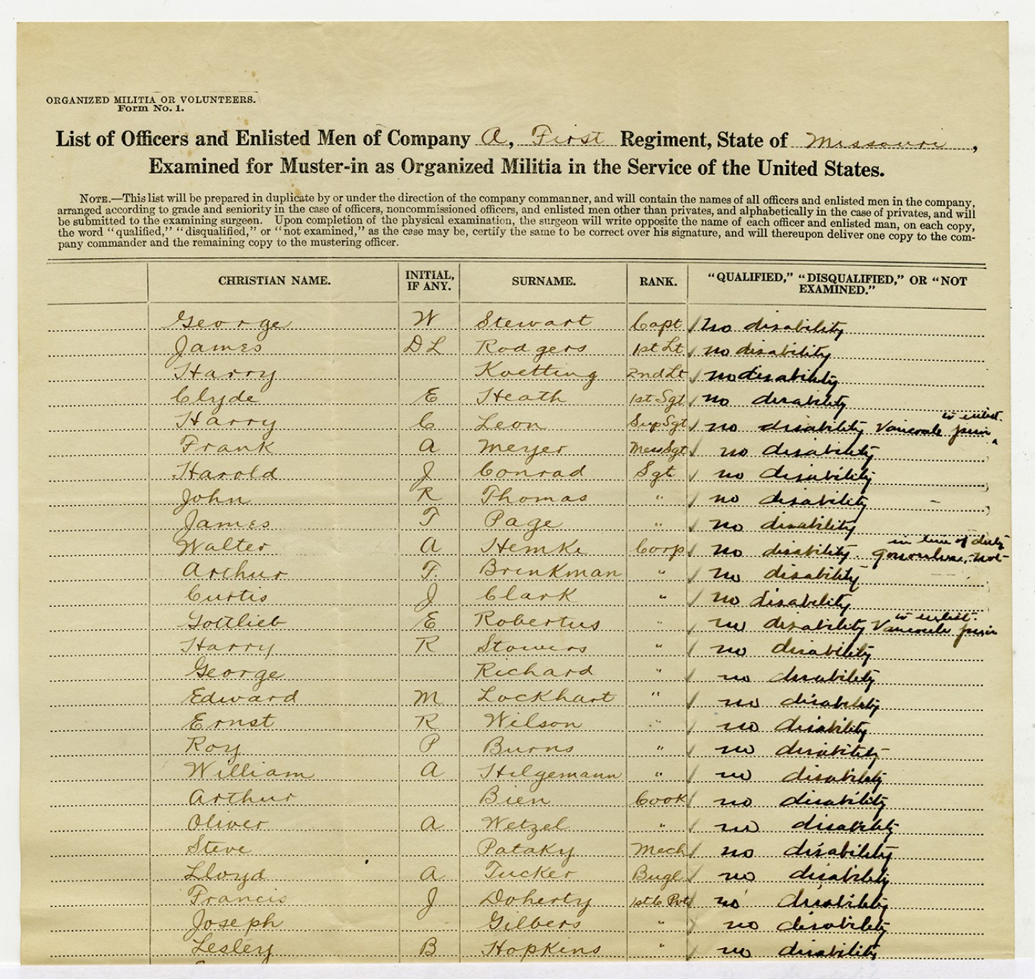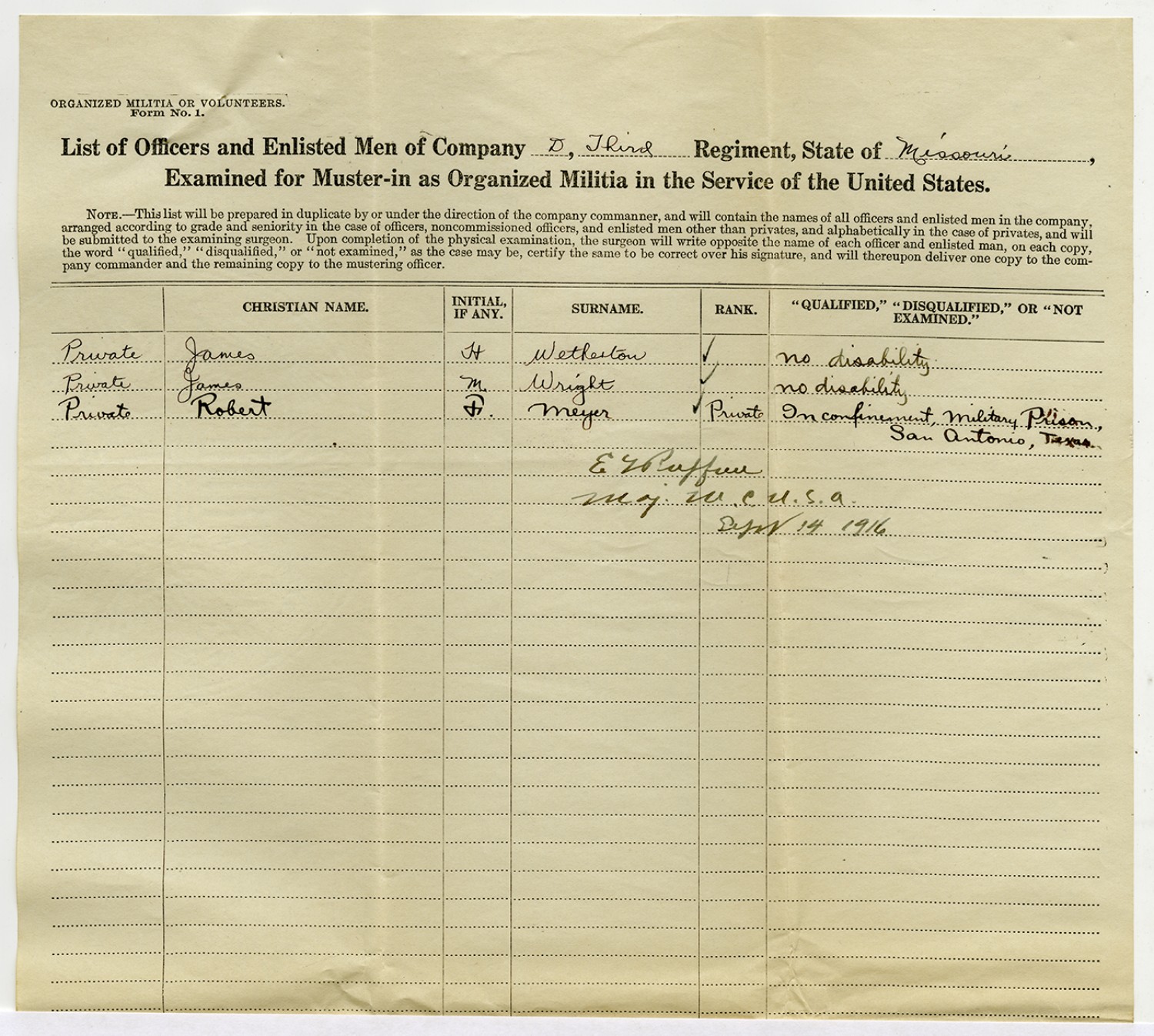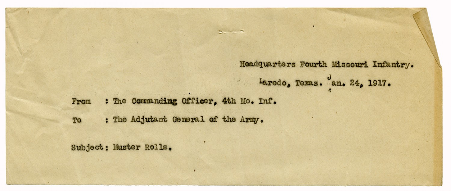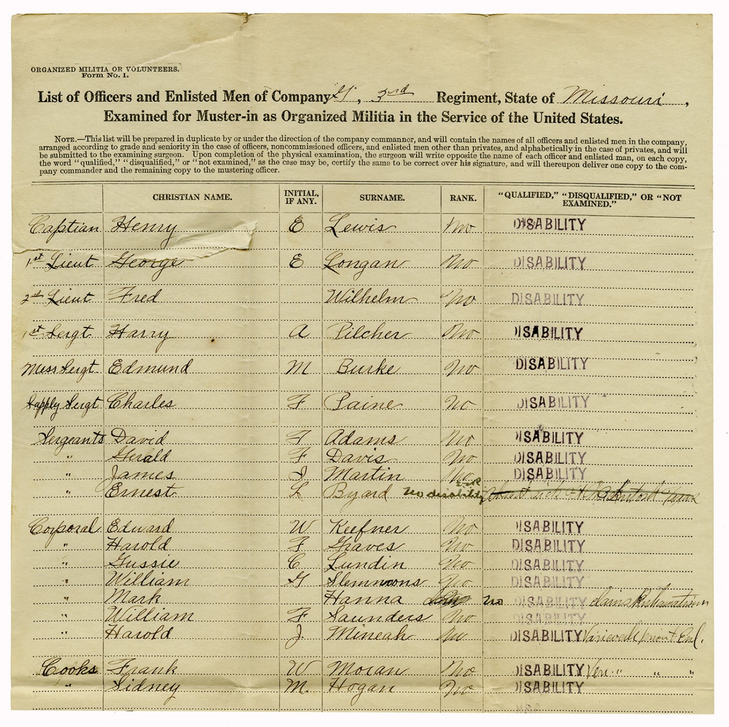 | Source | Missouri National Guard; Military Rosters, Physical Qualifications, List of Officers, List of Acceptances, List of Rejected, Weekly Report, Oath and Contract of Enlistment, Correspondence, List of Deserters, telegrams, and other papers regarding the enlis |