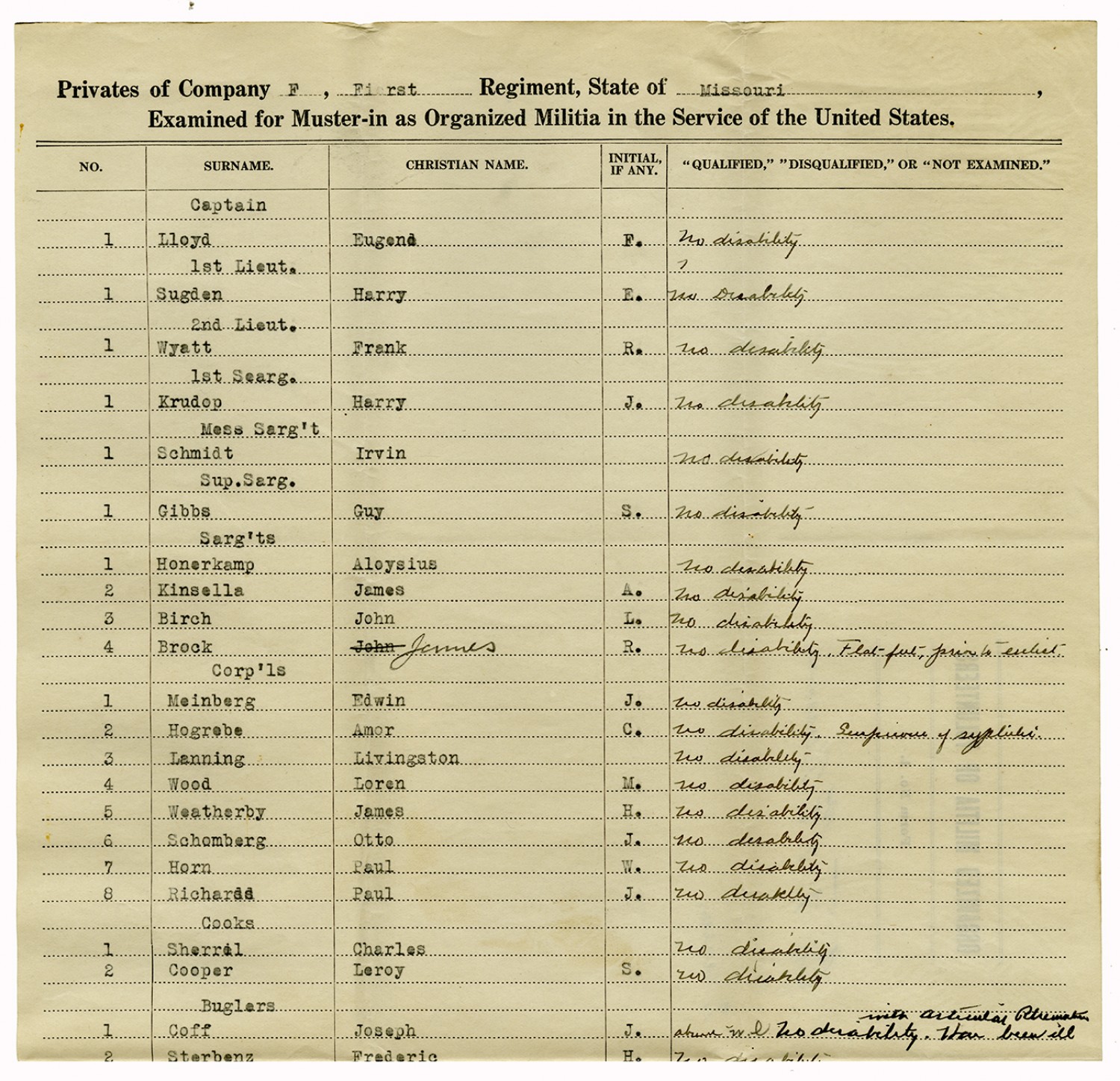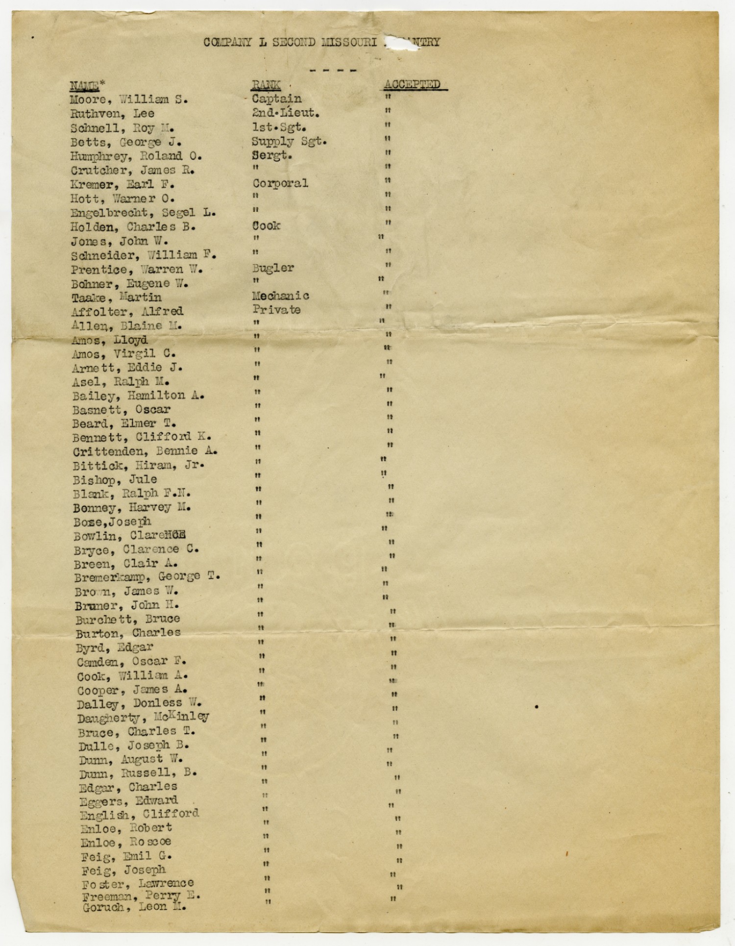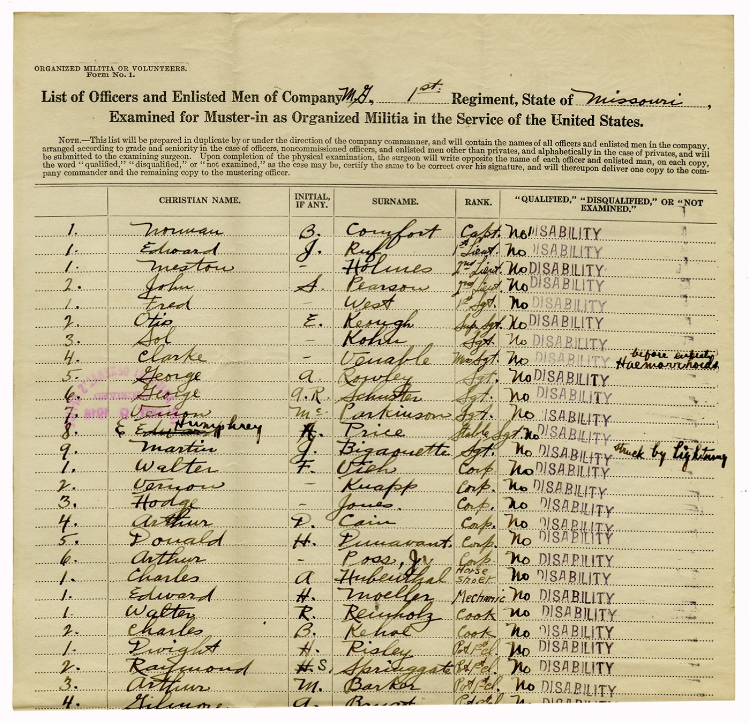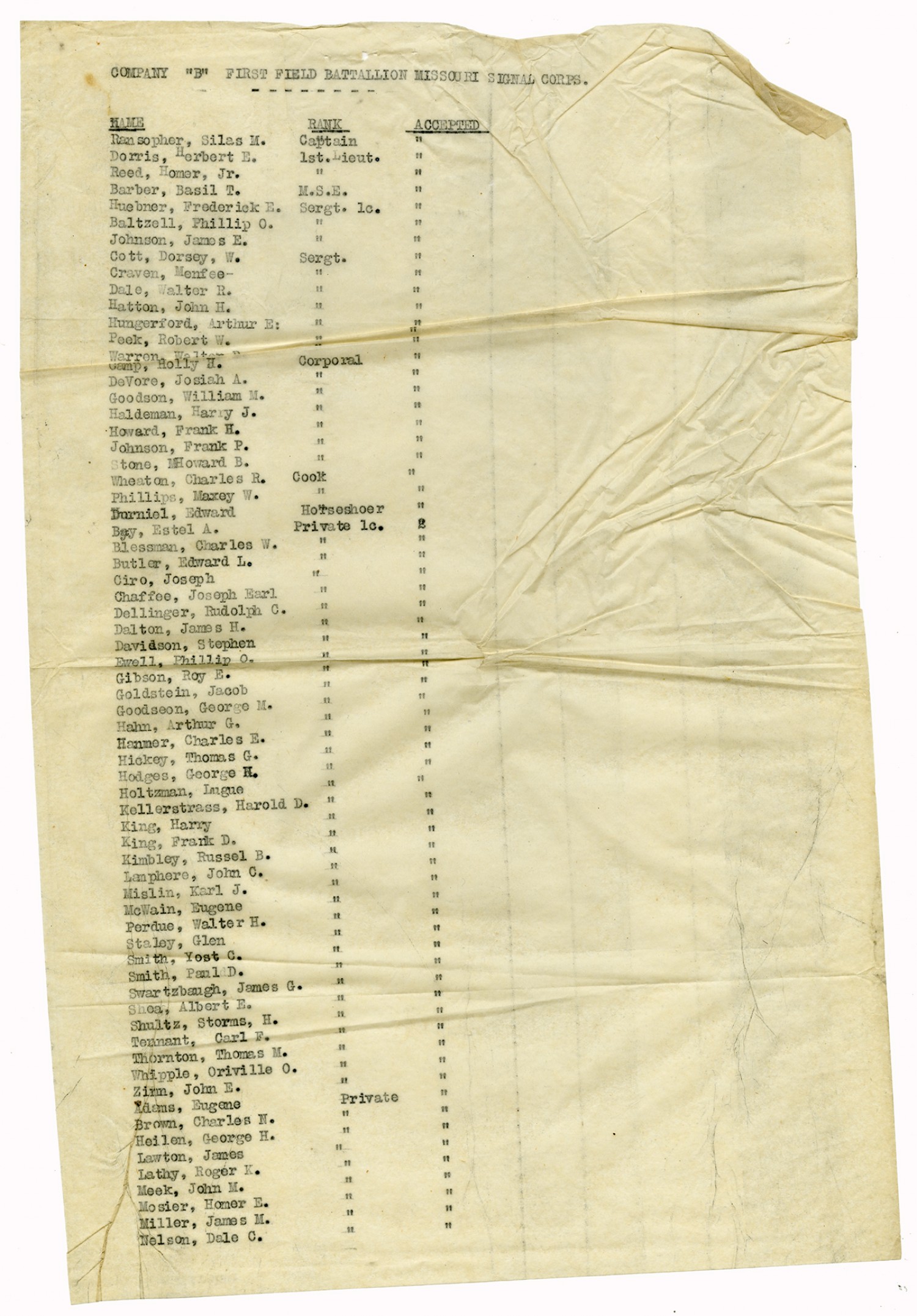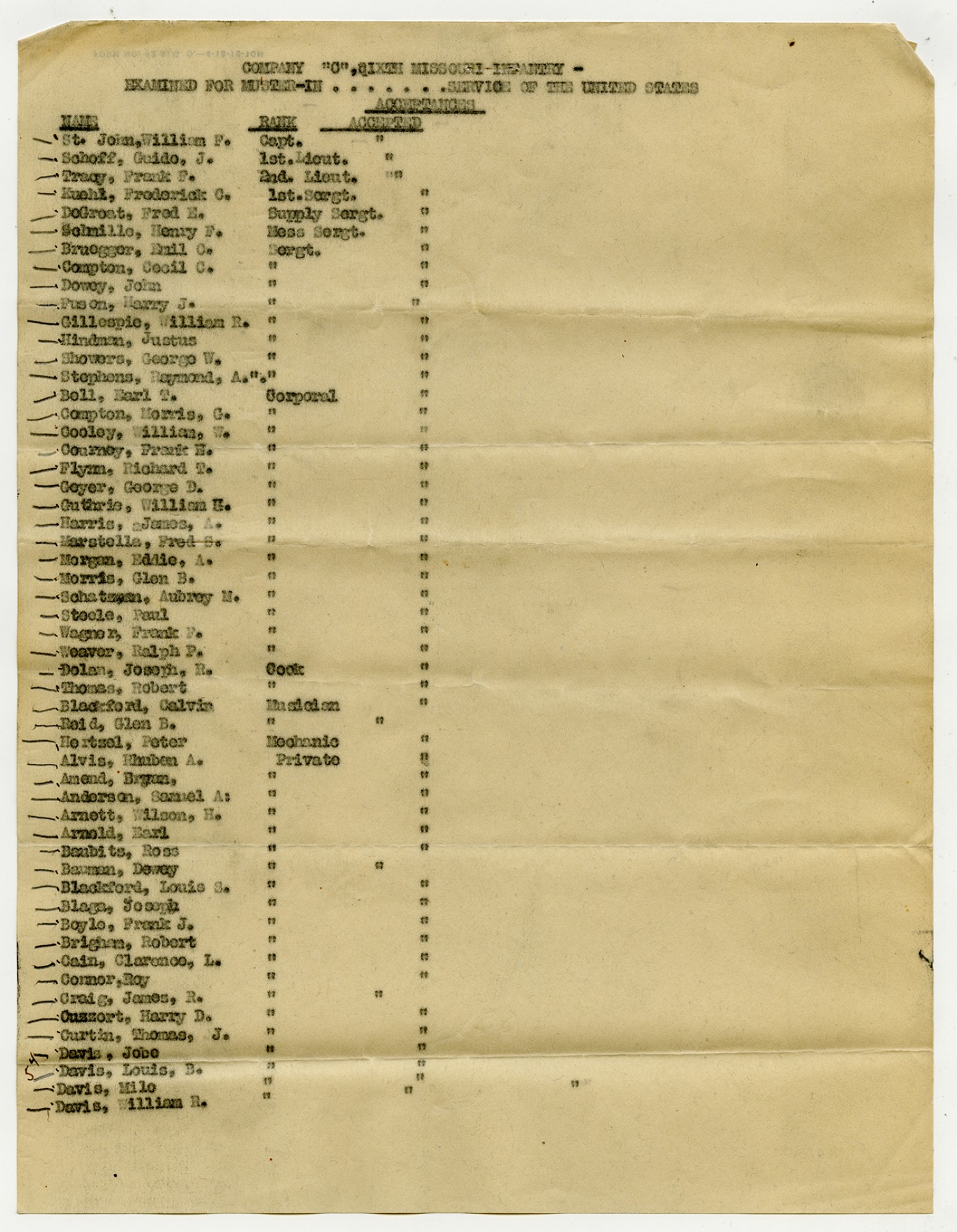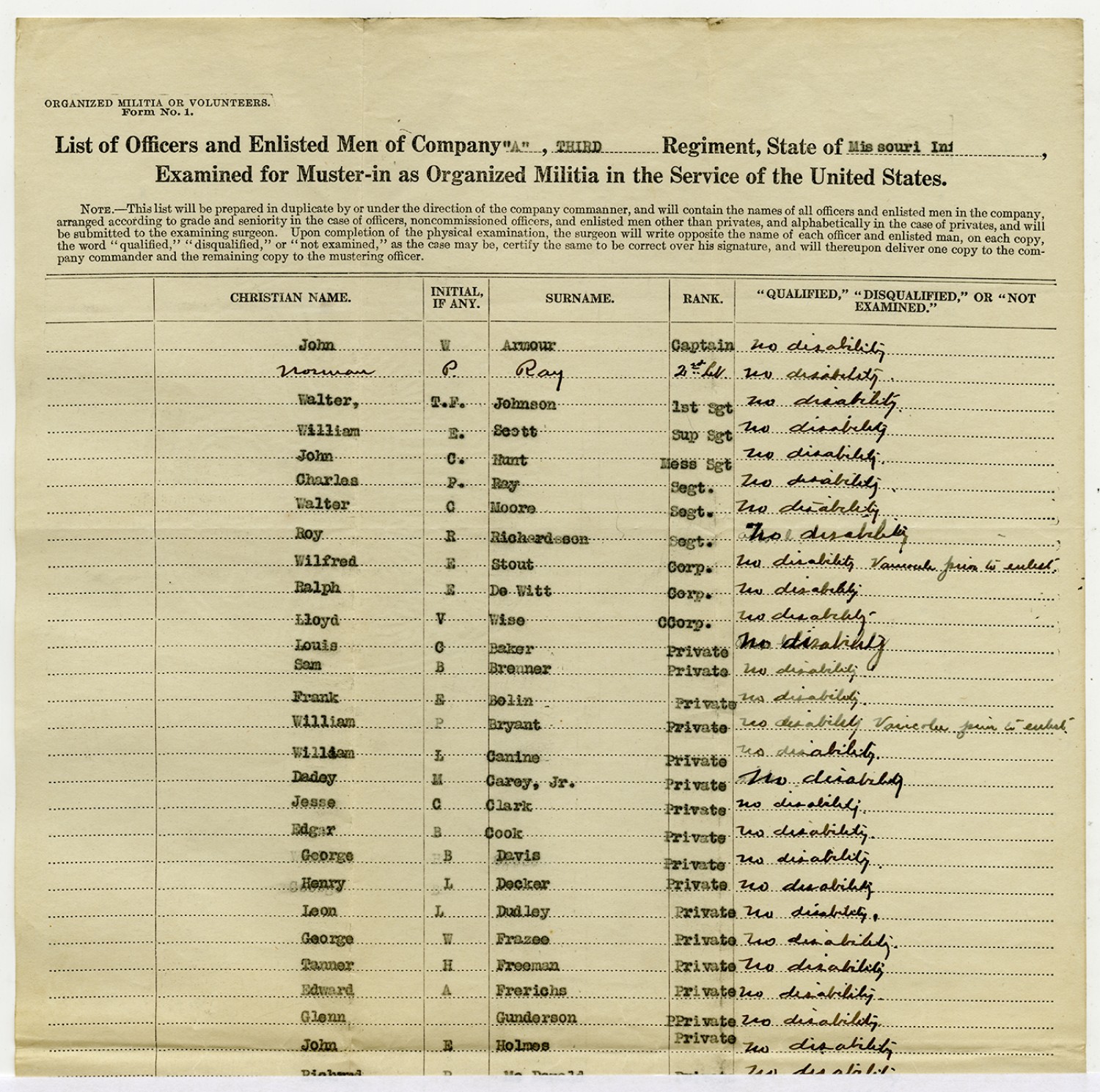 | Source | Missouri National Guard; Military Rosters, Physical Qualifications, List of Officers, List of Acceptances, List of Rejected, Weekly Report, Oath and Contract of Enlistment, Correspondence, List of Deserters, telegrams, and other papers regarding the enlis |