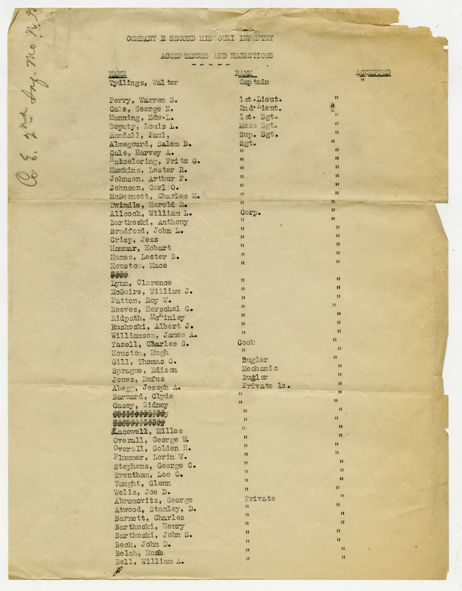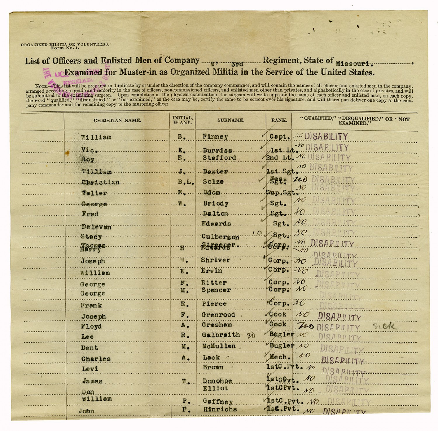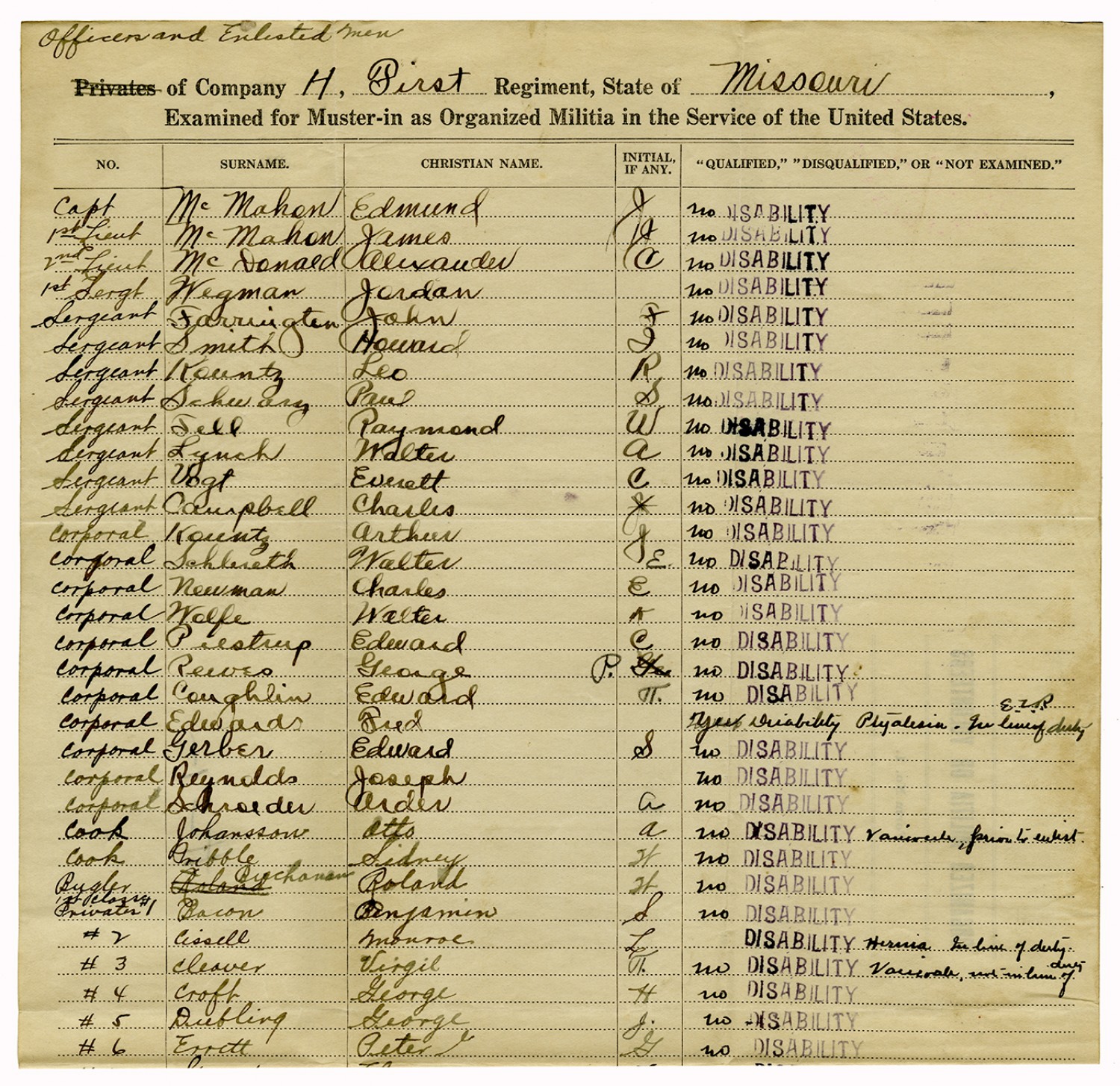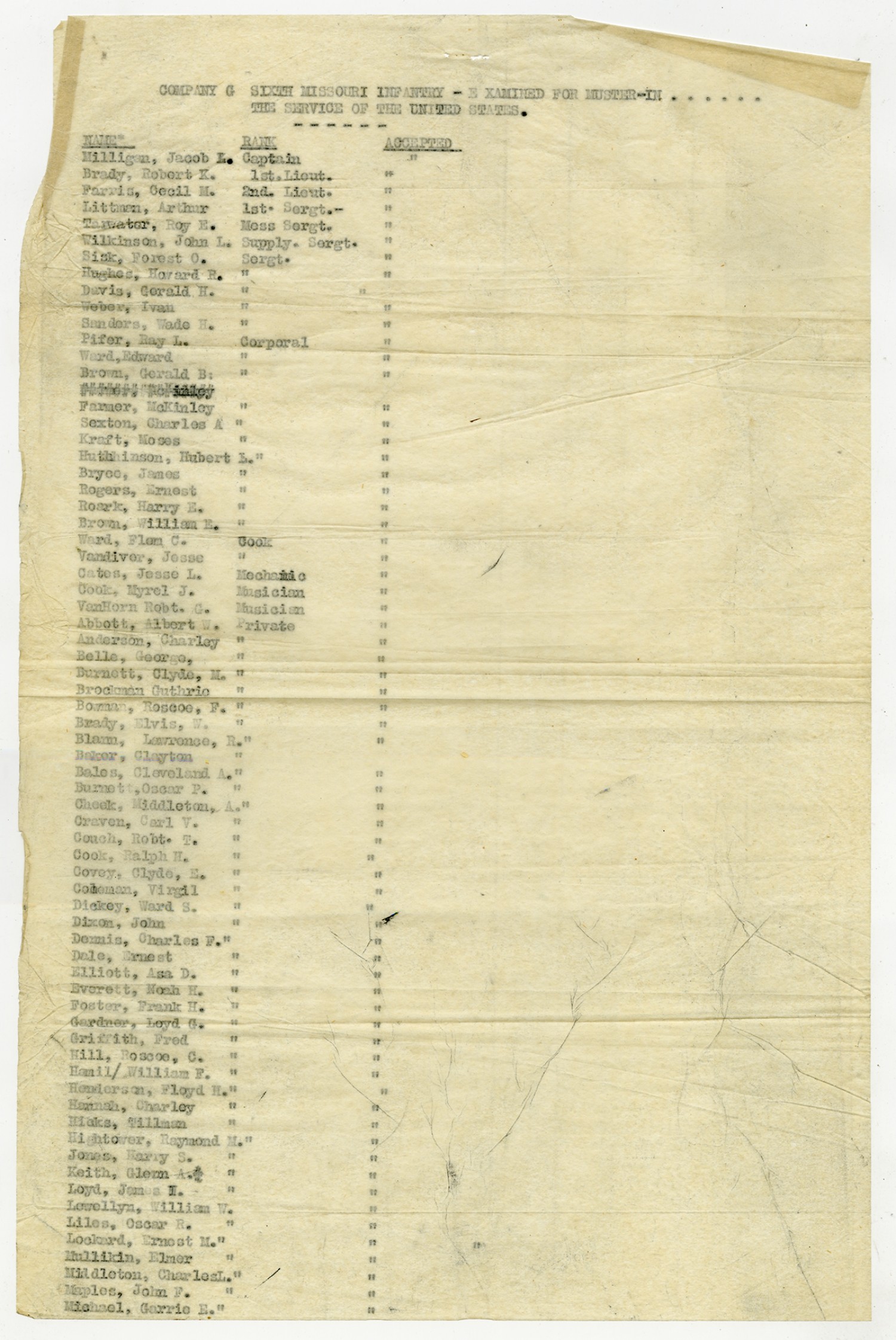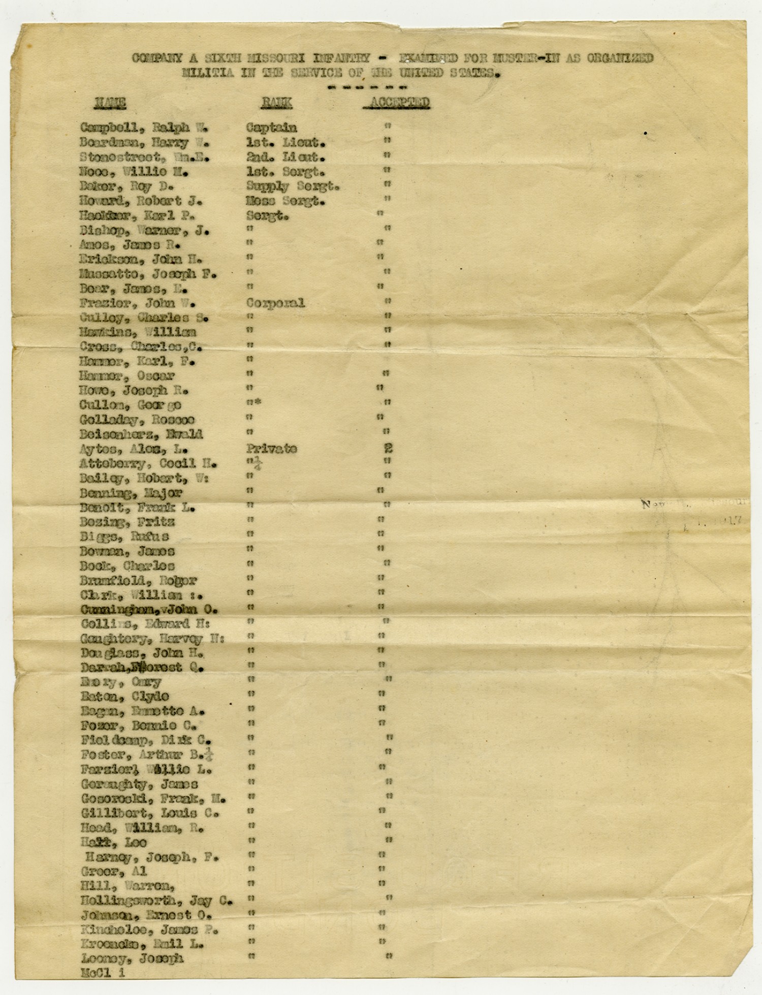 | Source | Missouri National Guard; Military Rosters, Physical Qualifications, List of Officers, List of Acceptances, List of Rejected, Weekly Report, Oath and Contract of Enlistment, Correspondence, List of Deserters, telegrams, and other papers regarding the enlis |