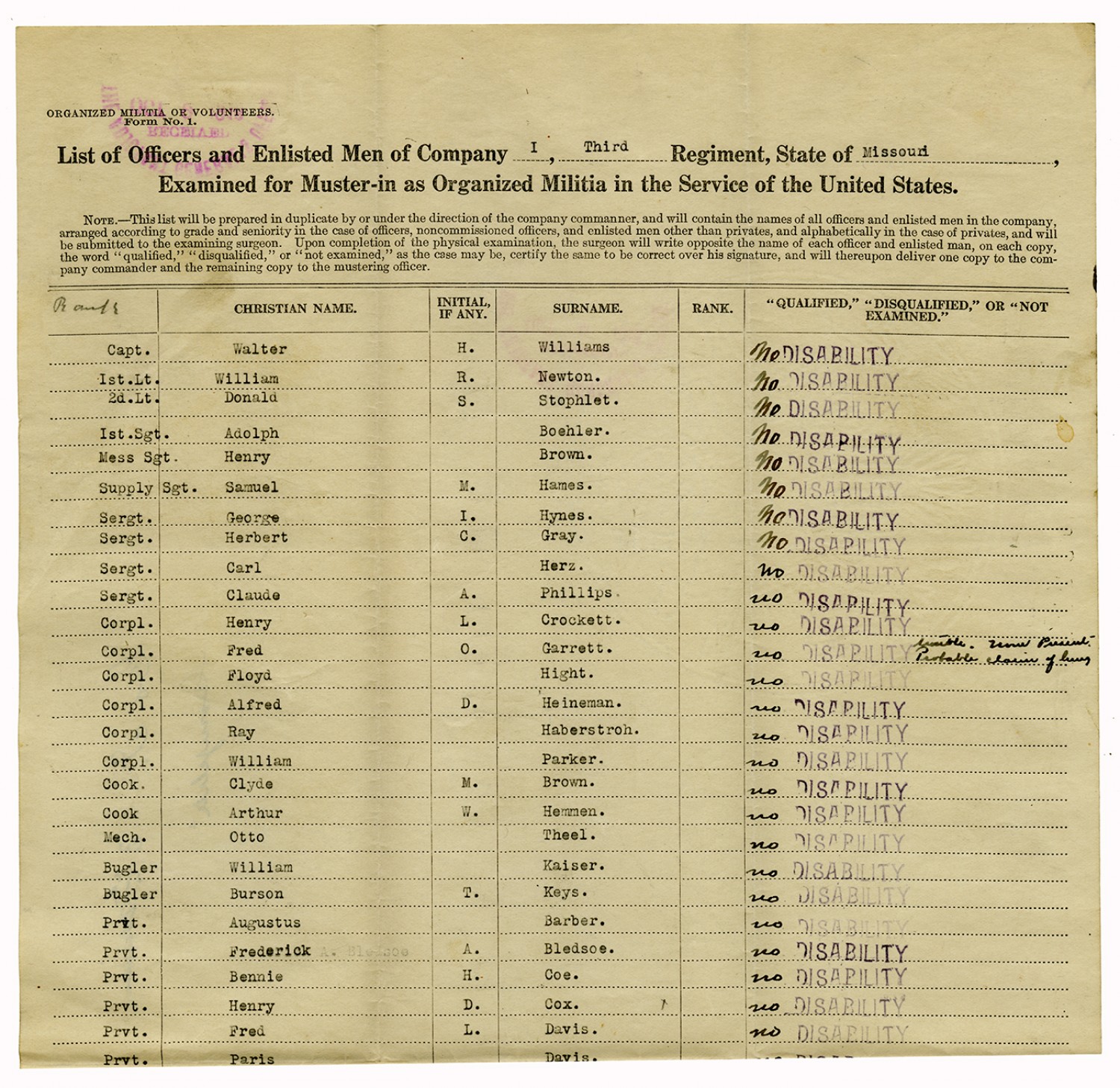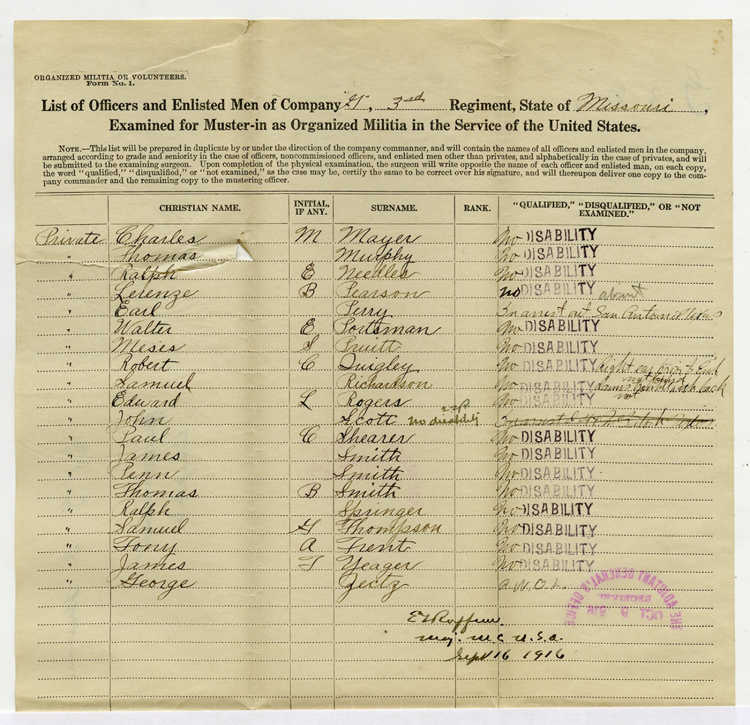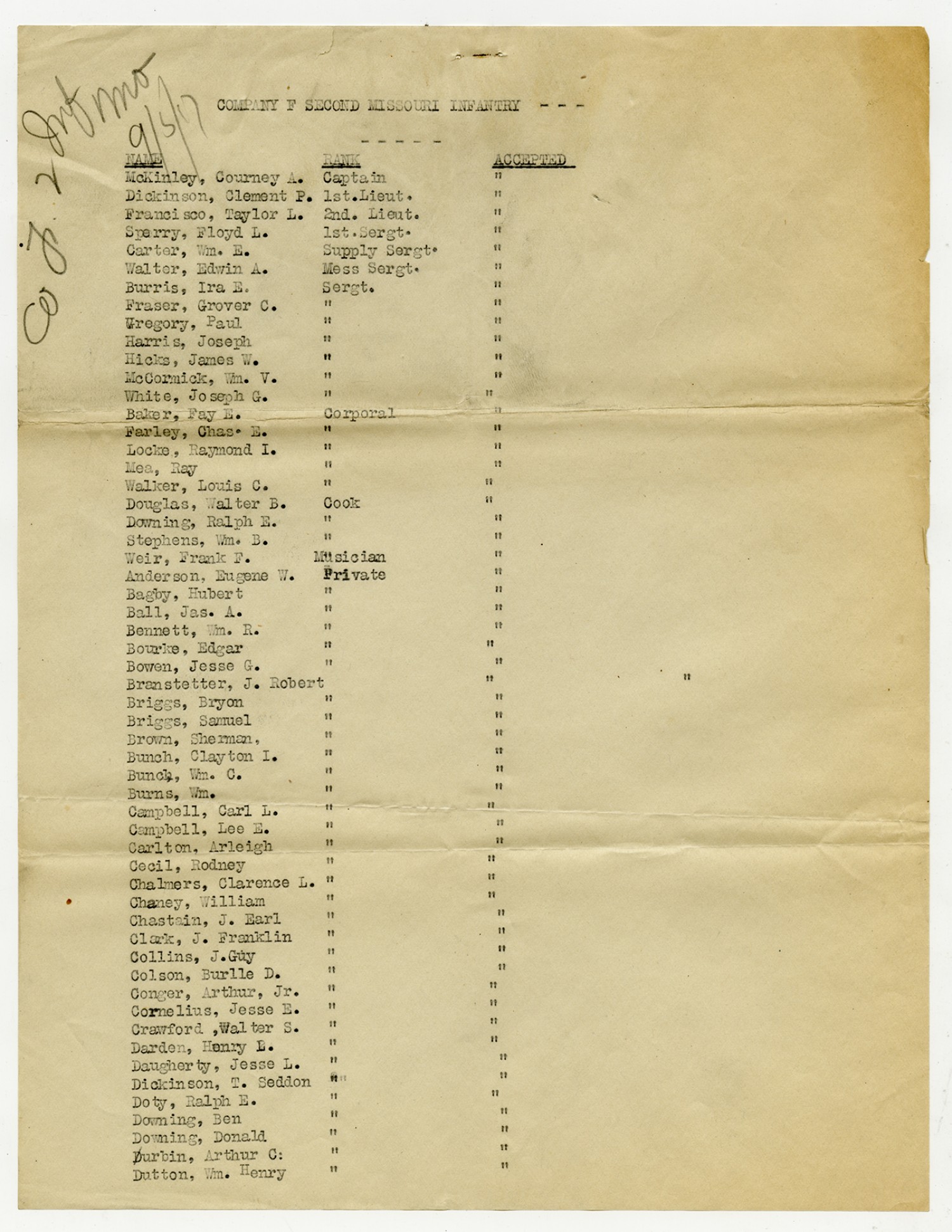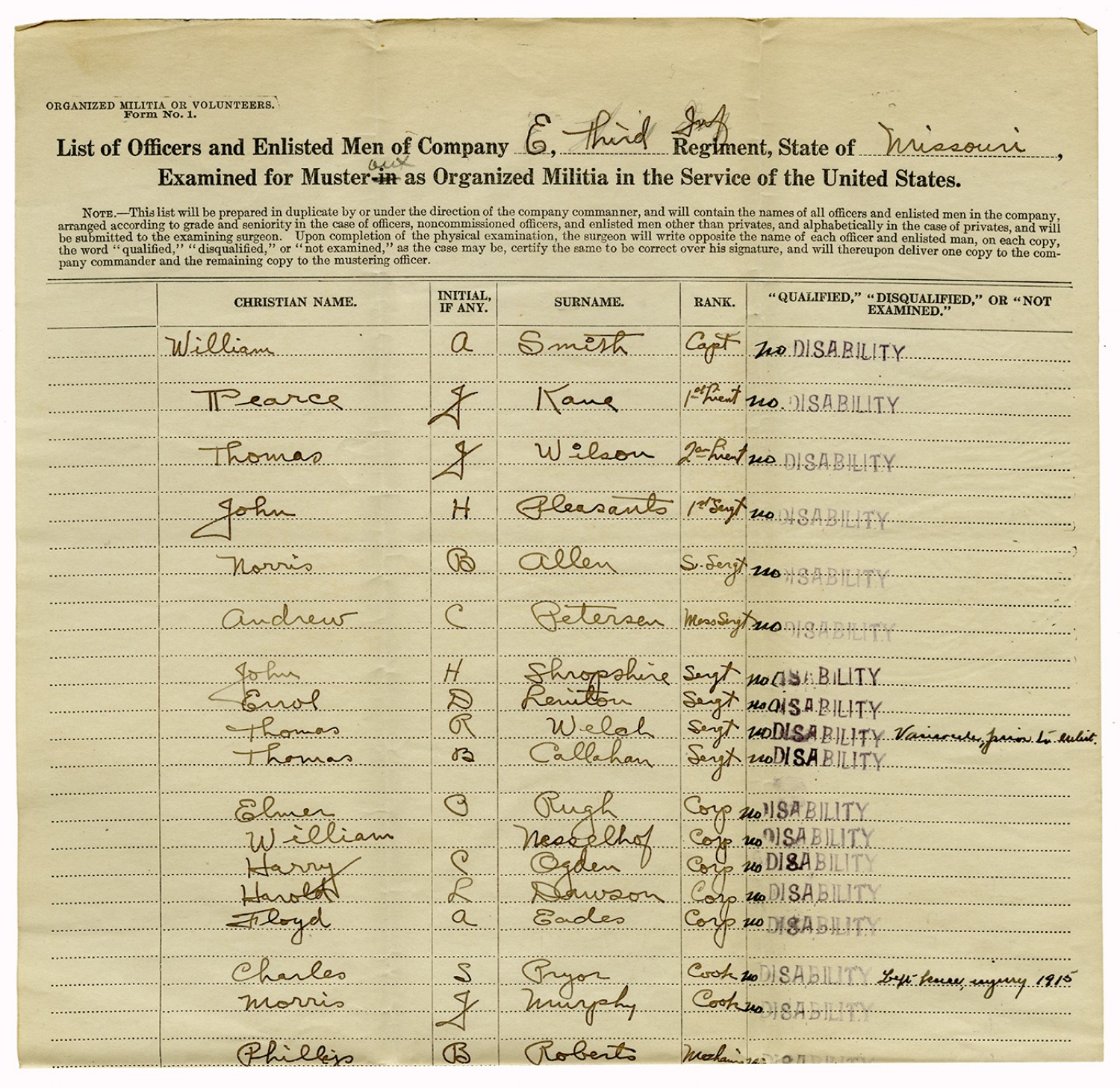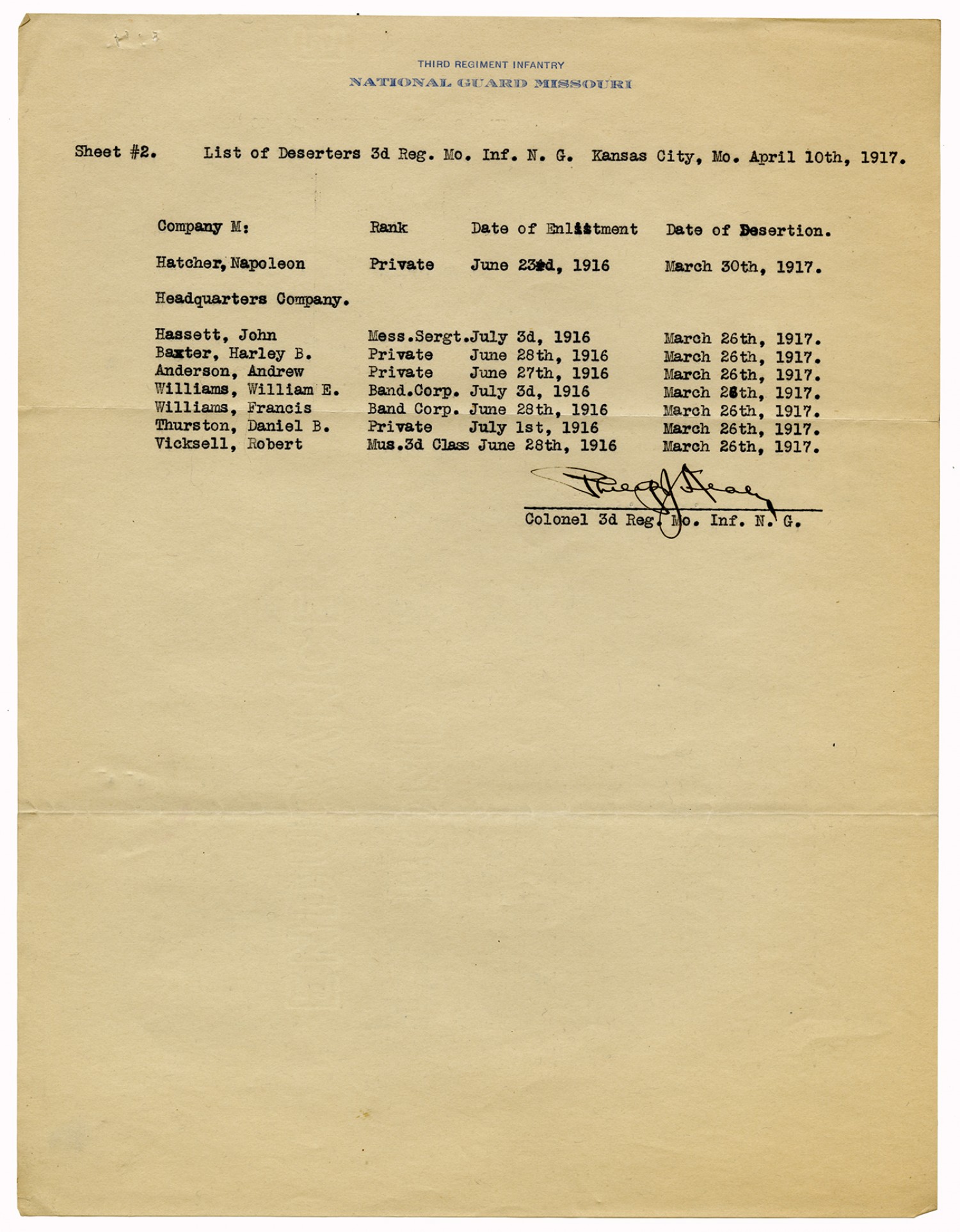 | Source | Missouri National Guard; Military Rosters, Physical Qualifications, List of Officers, List of Acceptances, List of Rejected, Weekly Report, Oath and Contract of Enlistment, Correspondence, List of Deserters, telegrams, and other papers regarding the enlis |
