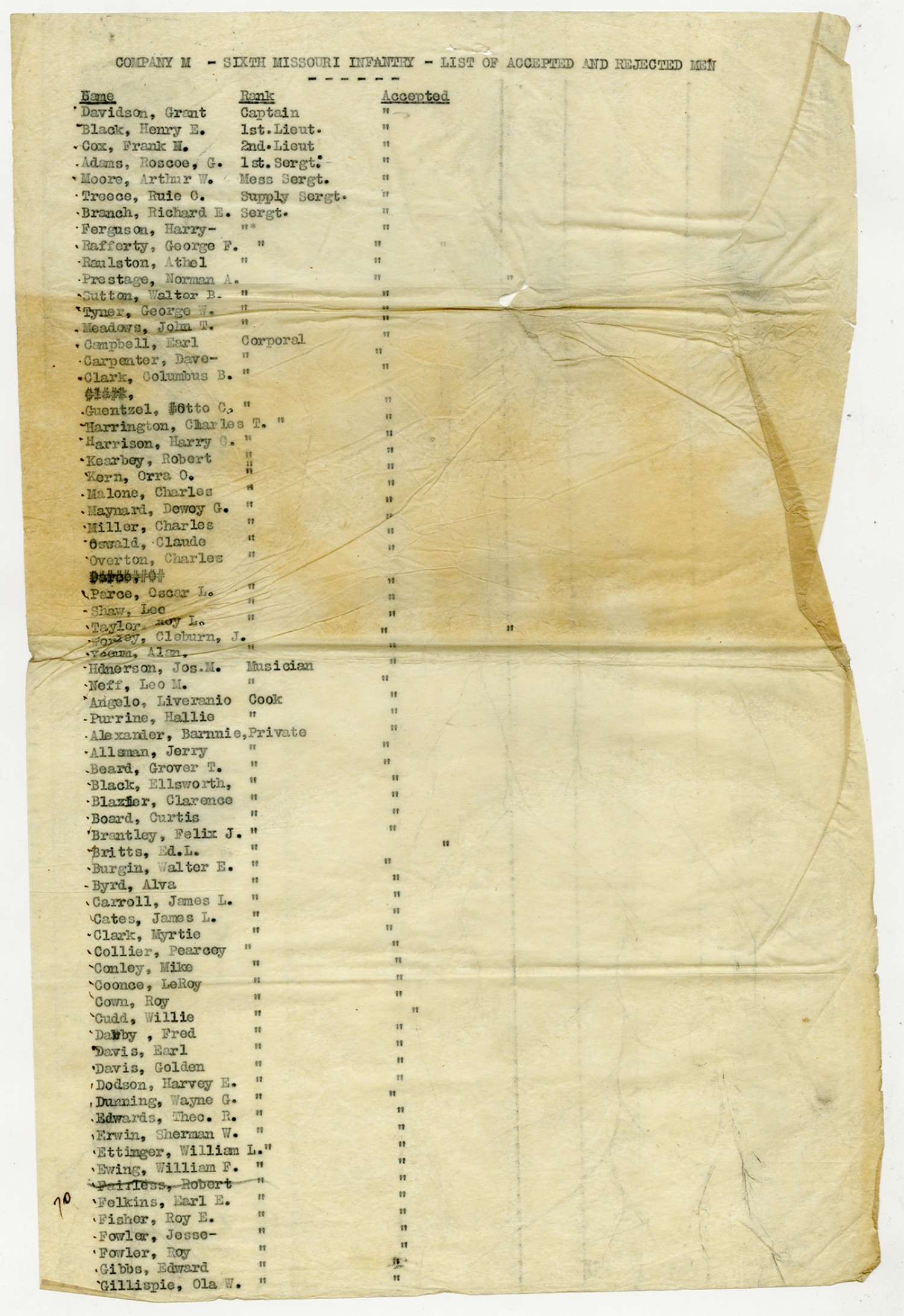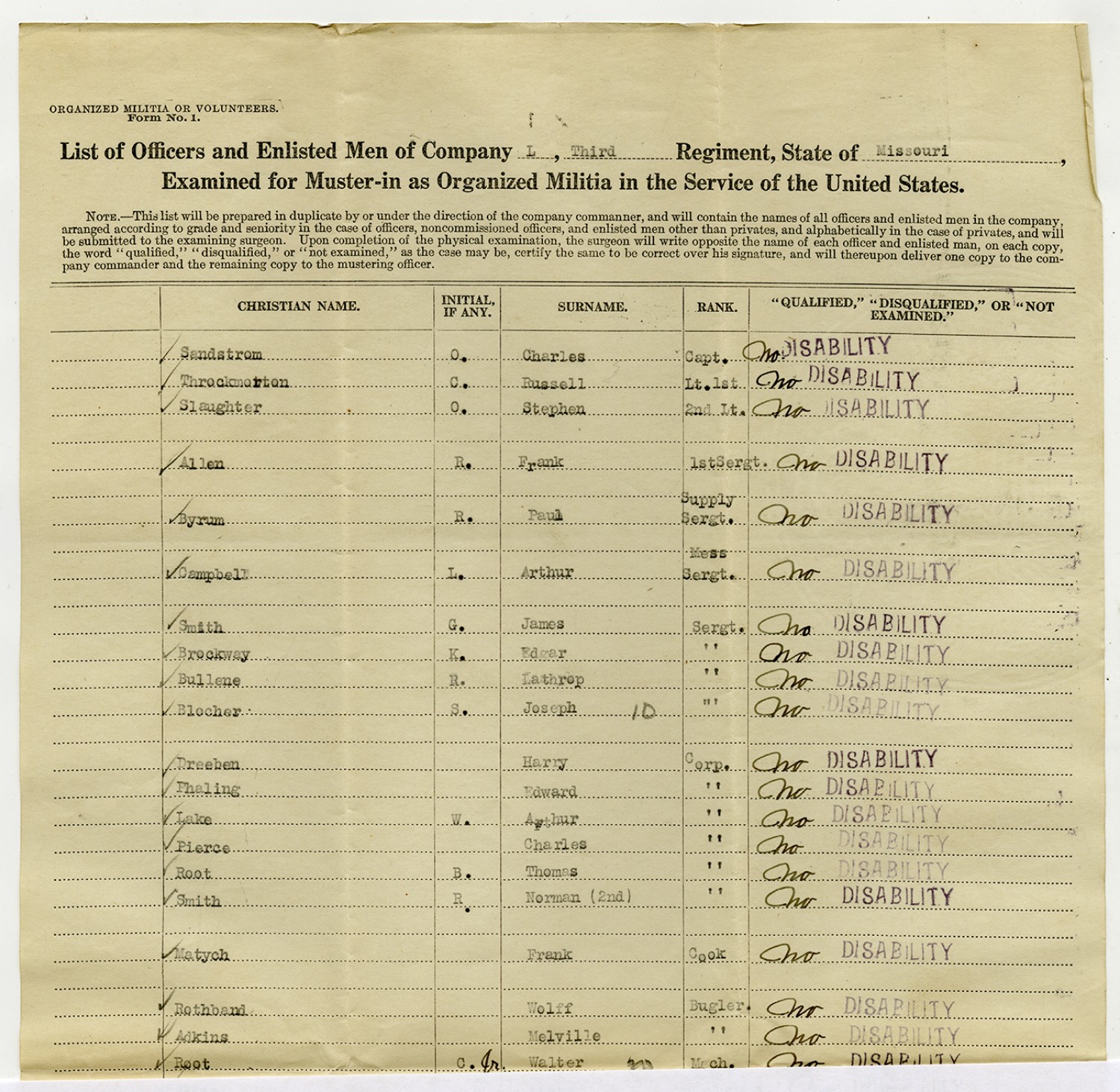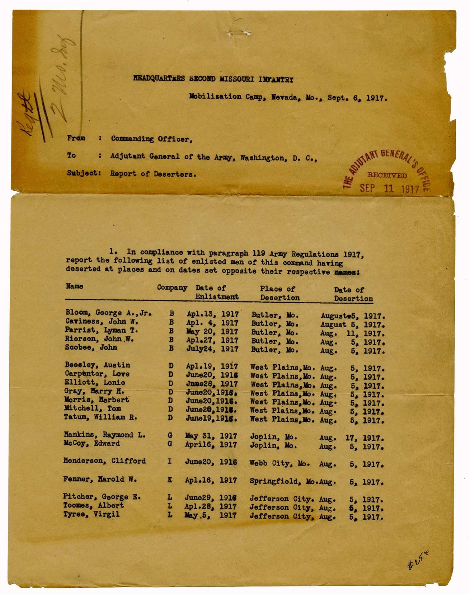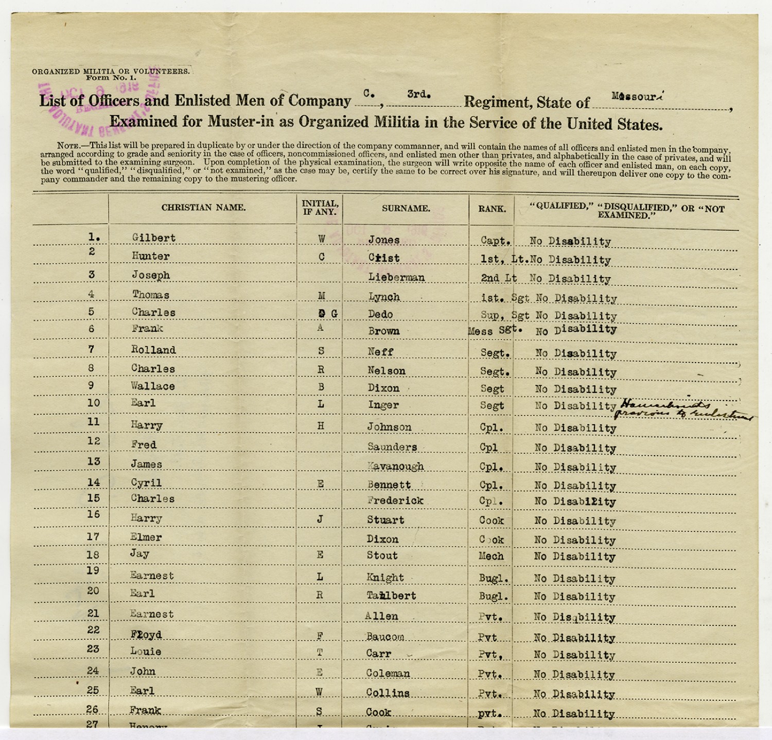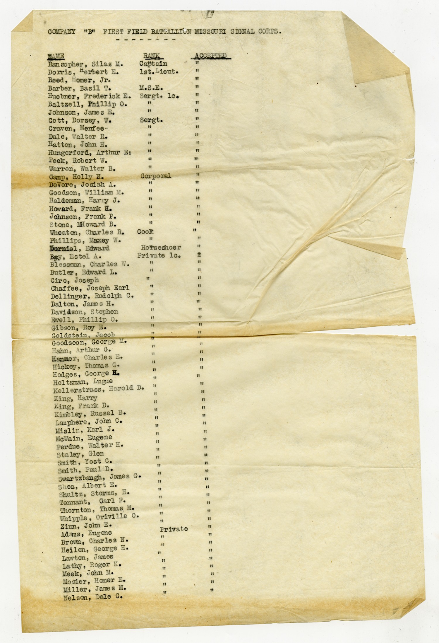 | Source | Missouri National Guard; Military Rosters, Physical Qualifications, List of Officers, List of Acceptances, List of Rejected, Weekly Report, Oath and Contract of Enlistment, Correspondence, List of Deserters, telegrams, and other papers regarding the enlis |