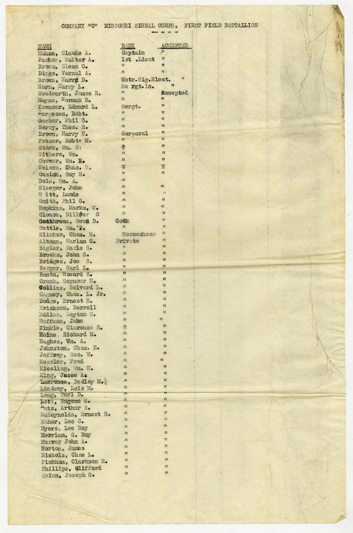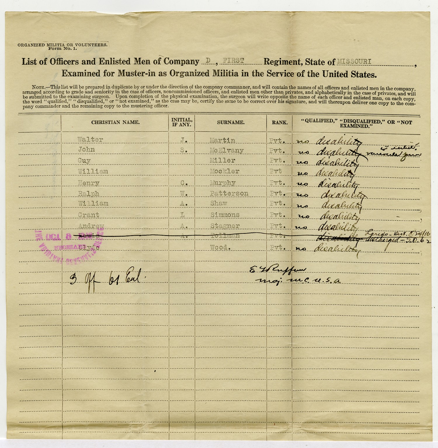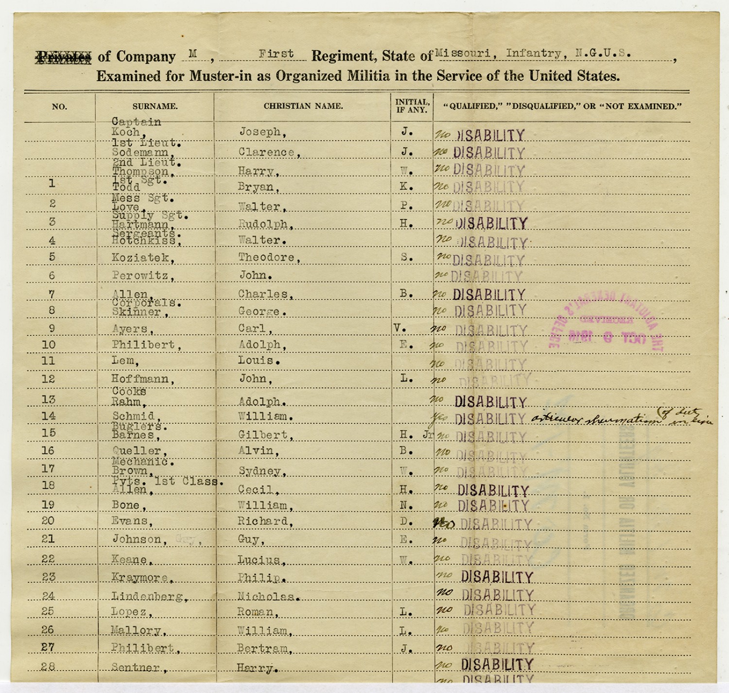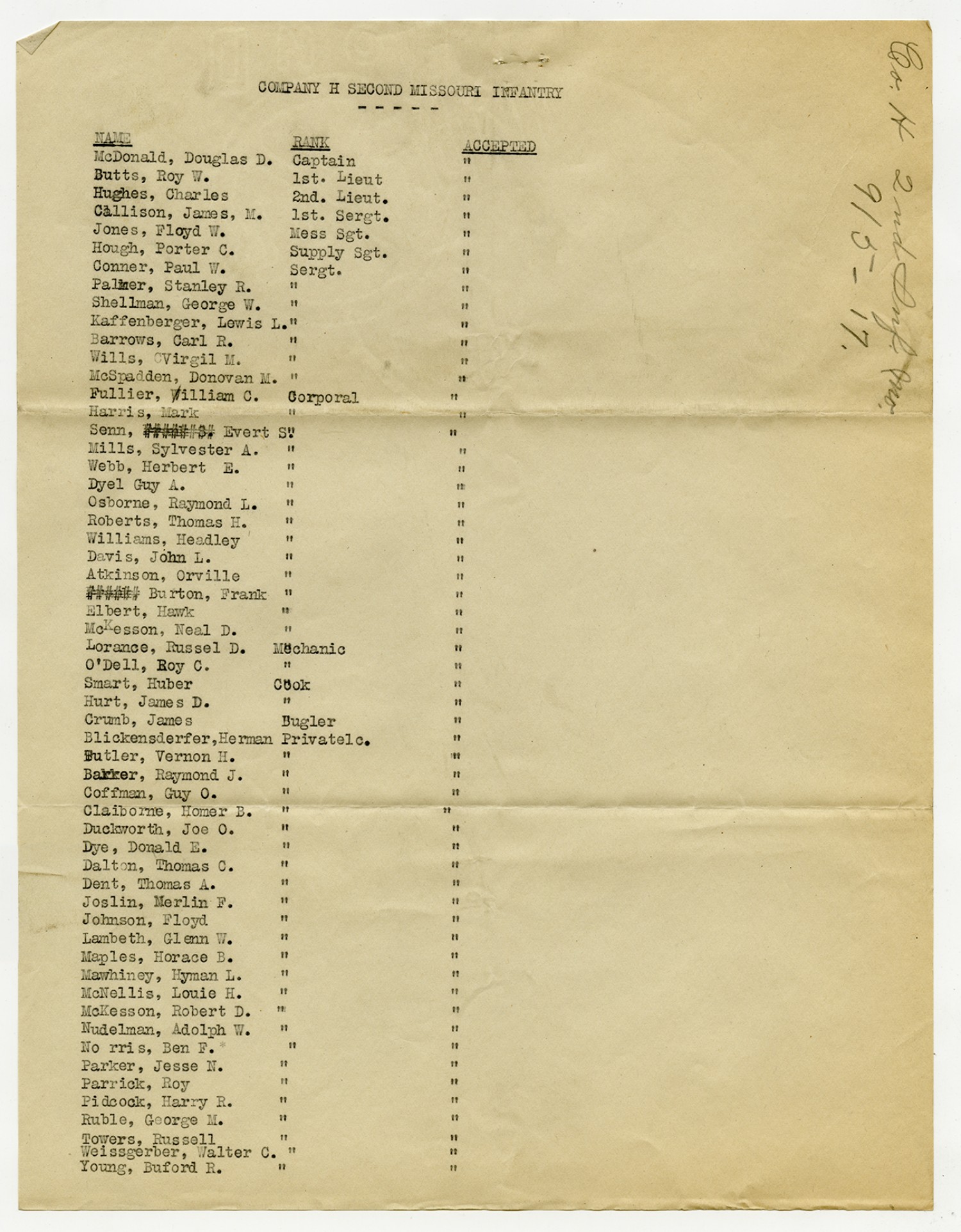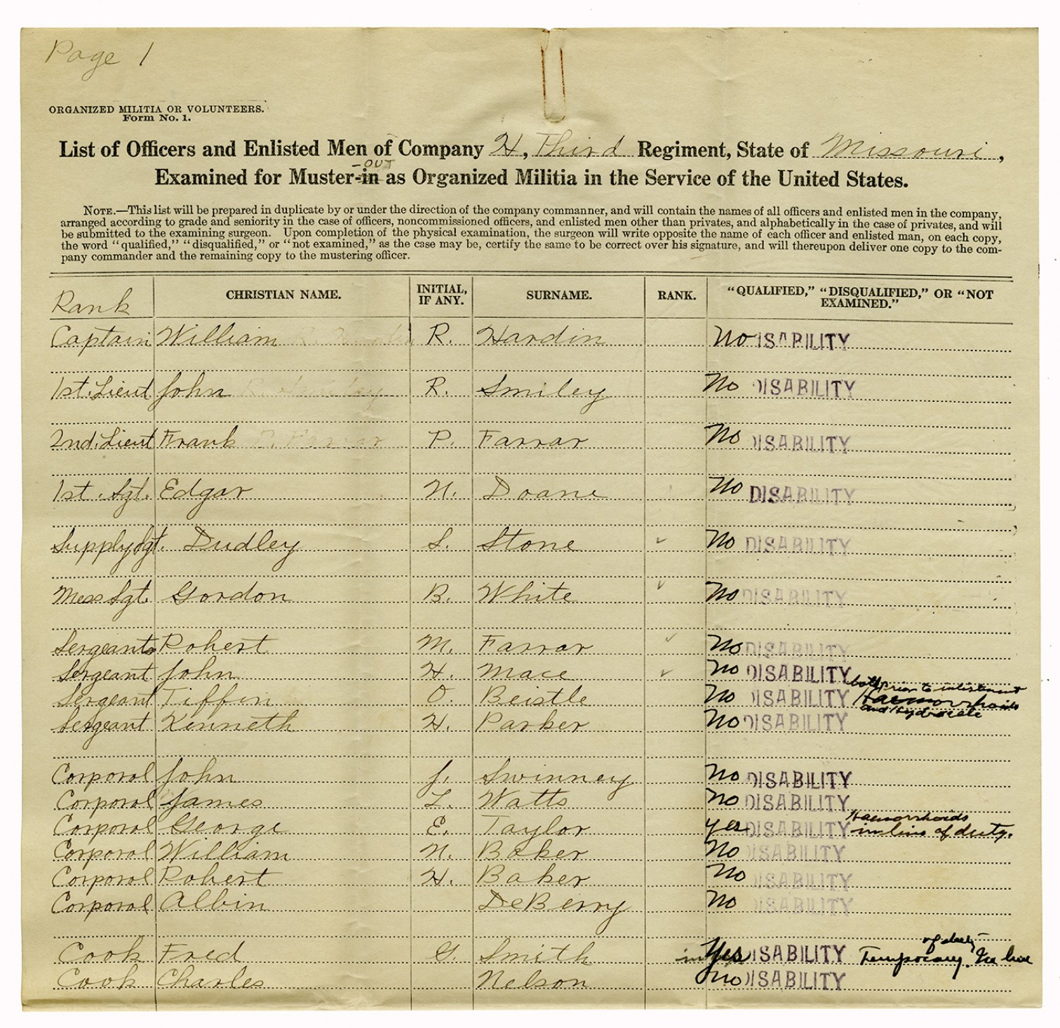 | Source | Missouri National Guard; Military Rosters, Physical Qualifications, List of Officers, List of Acceptances, List of Rejected, Weekly Report, Oath and Contract of Enlistment, Correspondence, List of Deserters, telegrams, and other papers regarding the enlis |